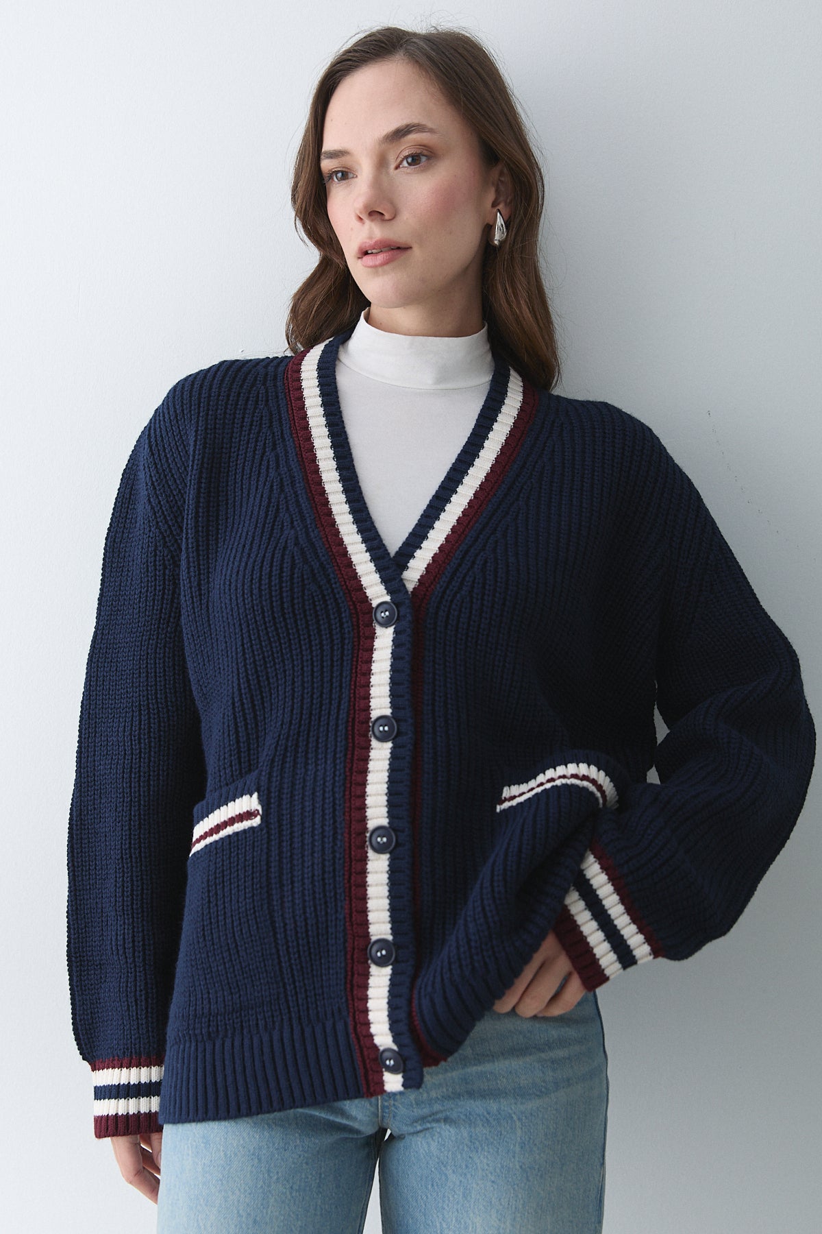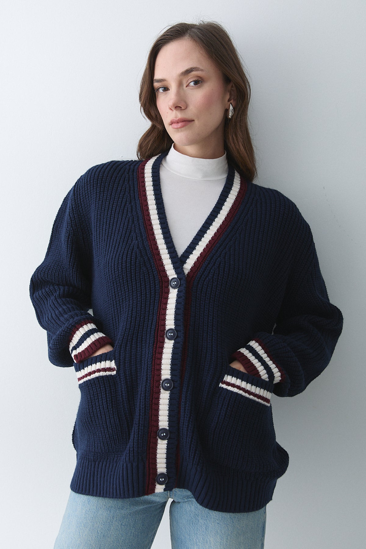 - Lacivert - Bordo Renkli Cepli Hırka - 241143