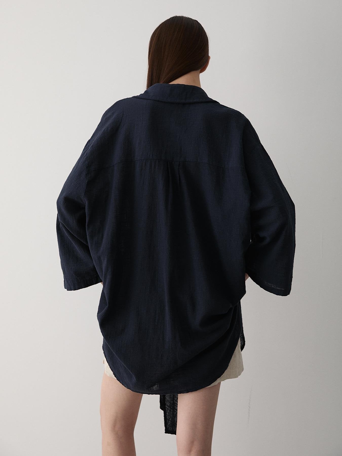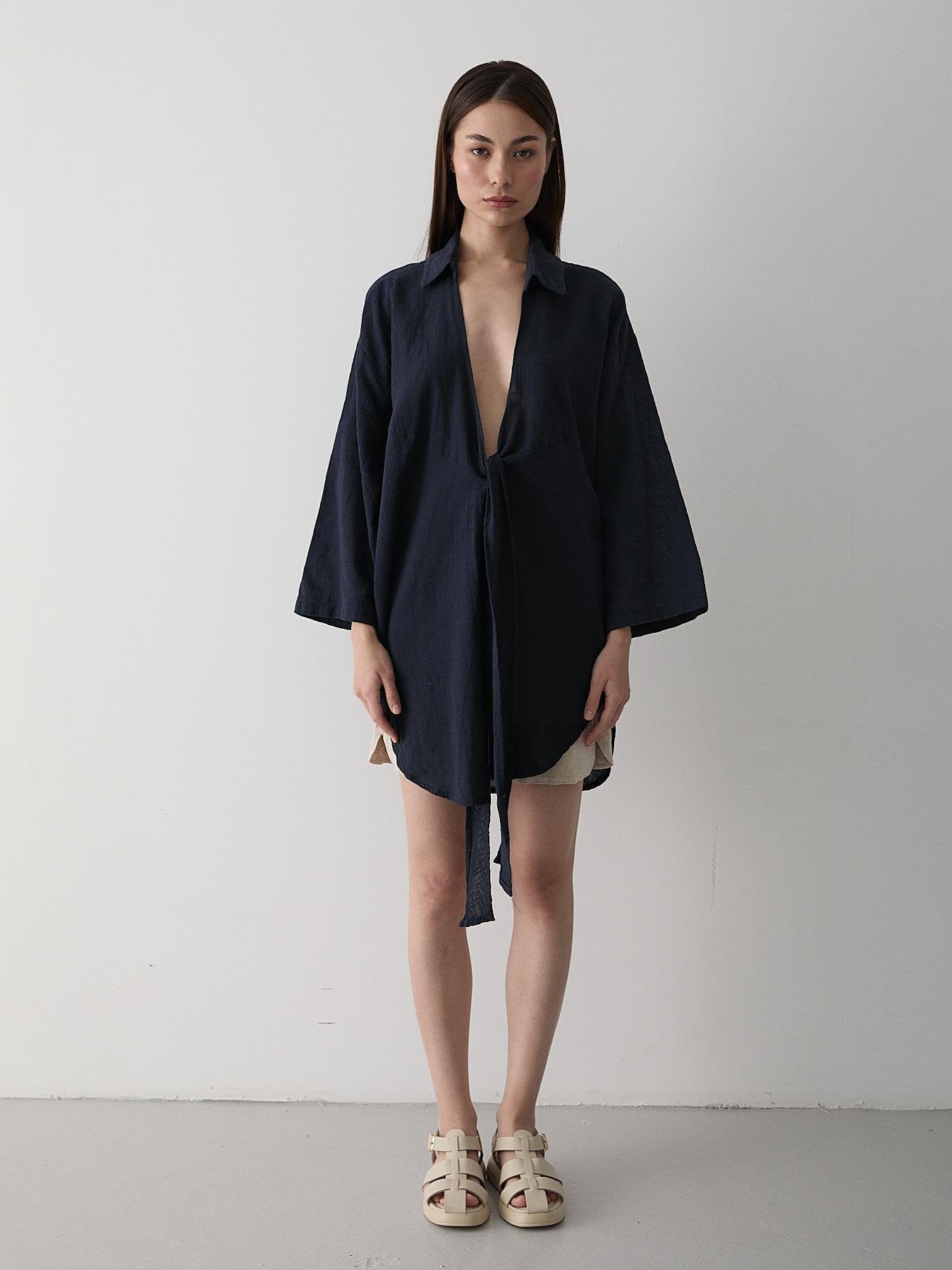 - Lacivert Flam Keten Kimono Gömlek