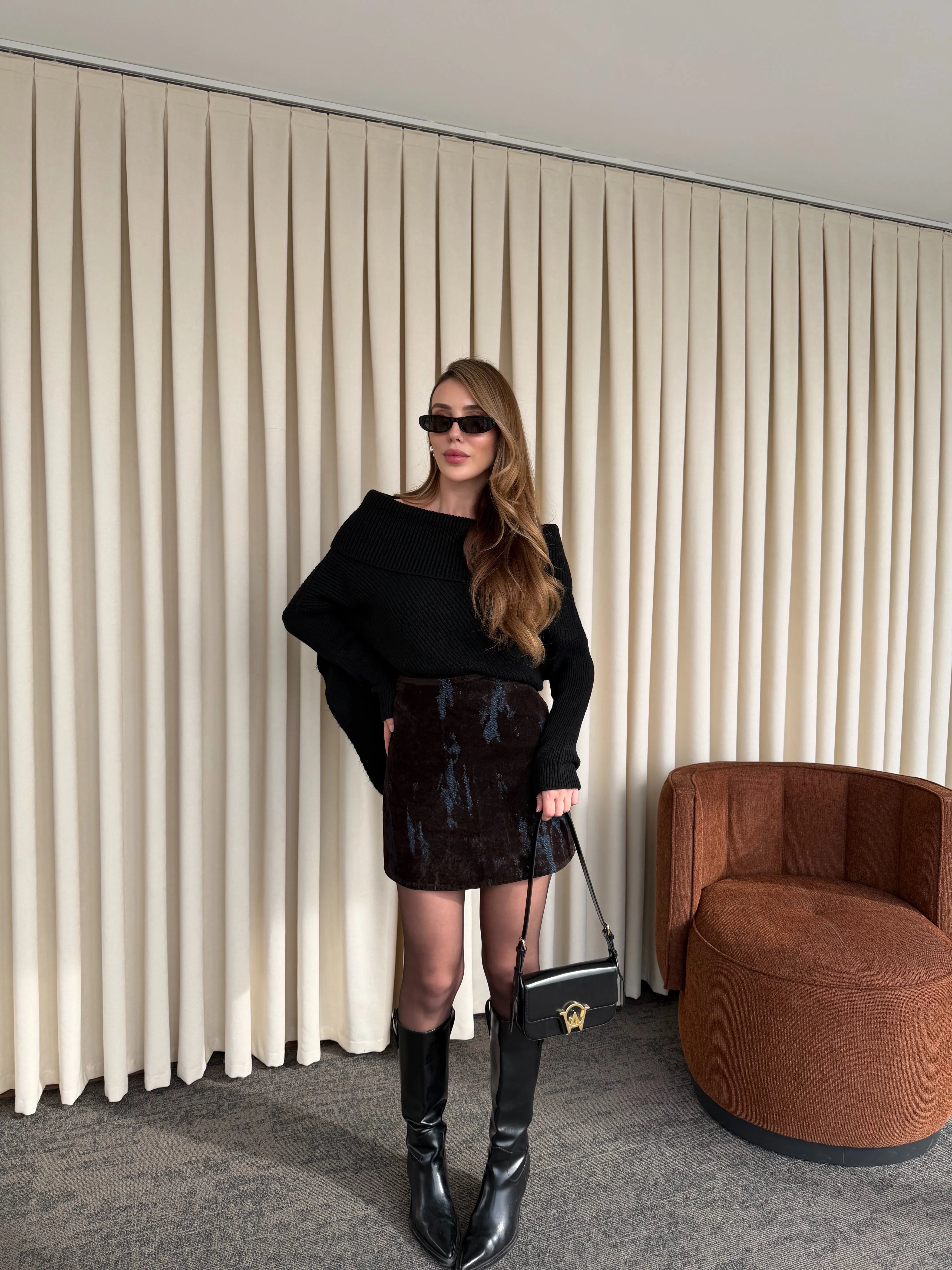 - Lacivert - Kahverengi Flok Baskılı Etek - 261002