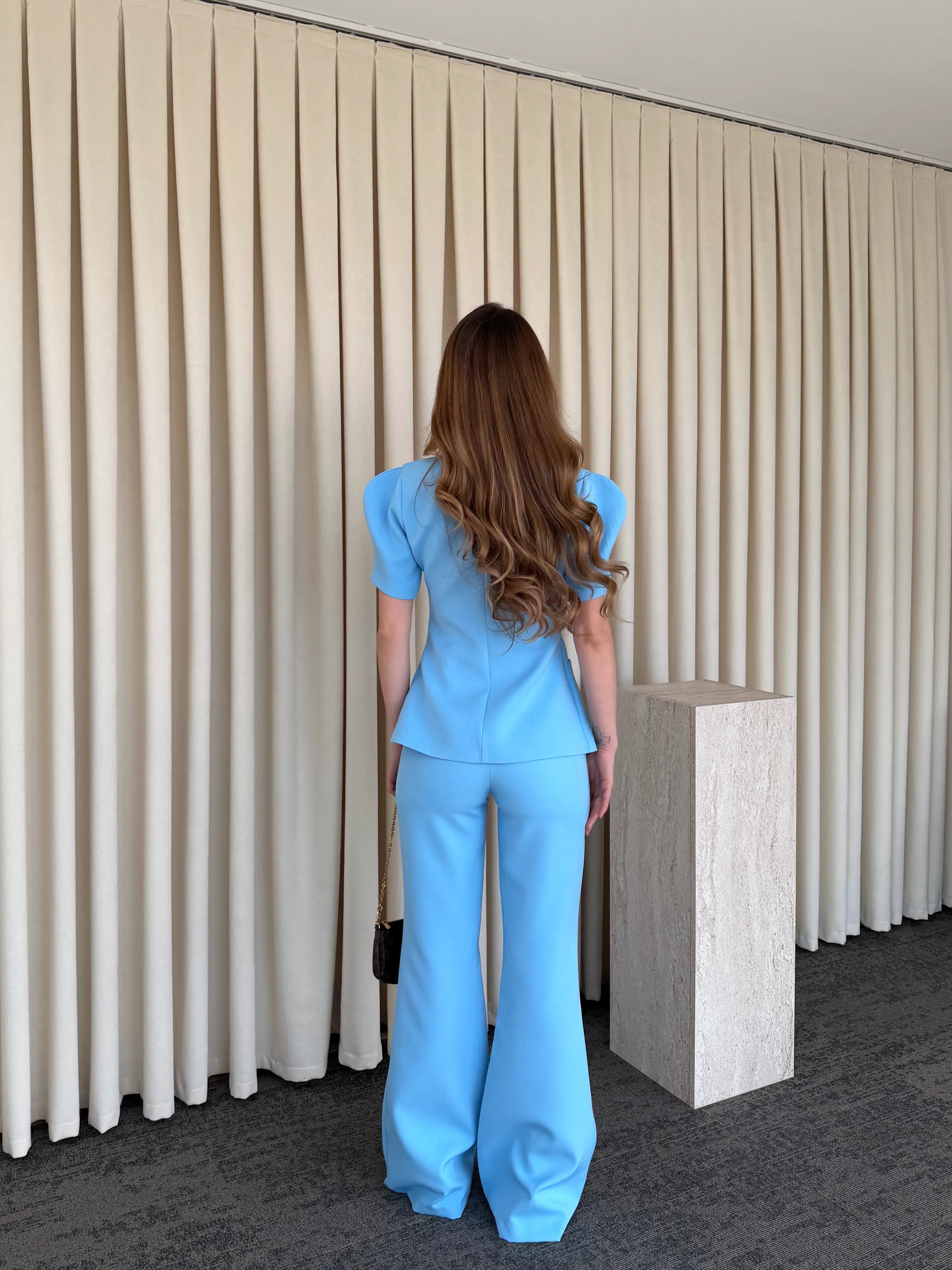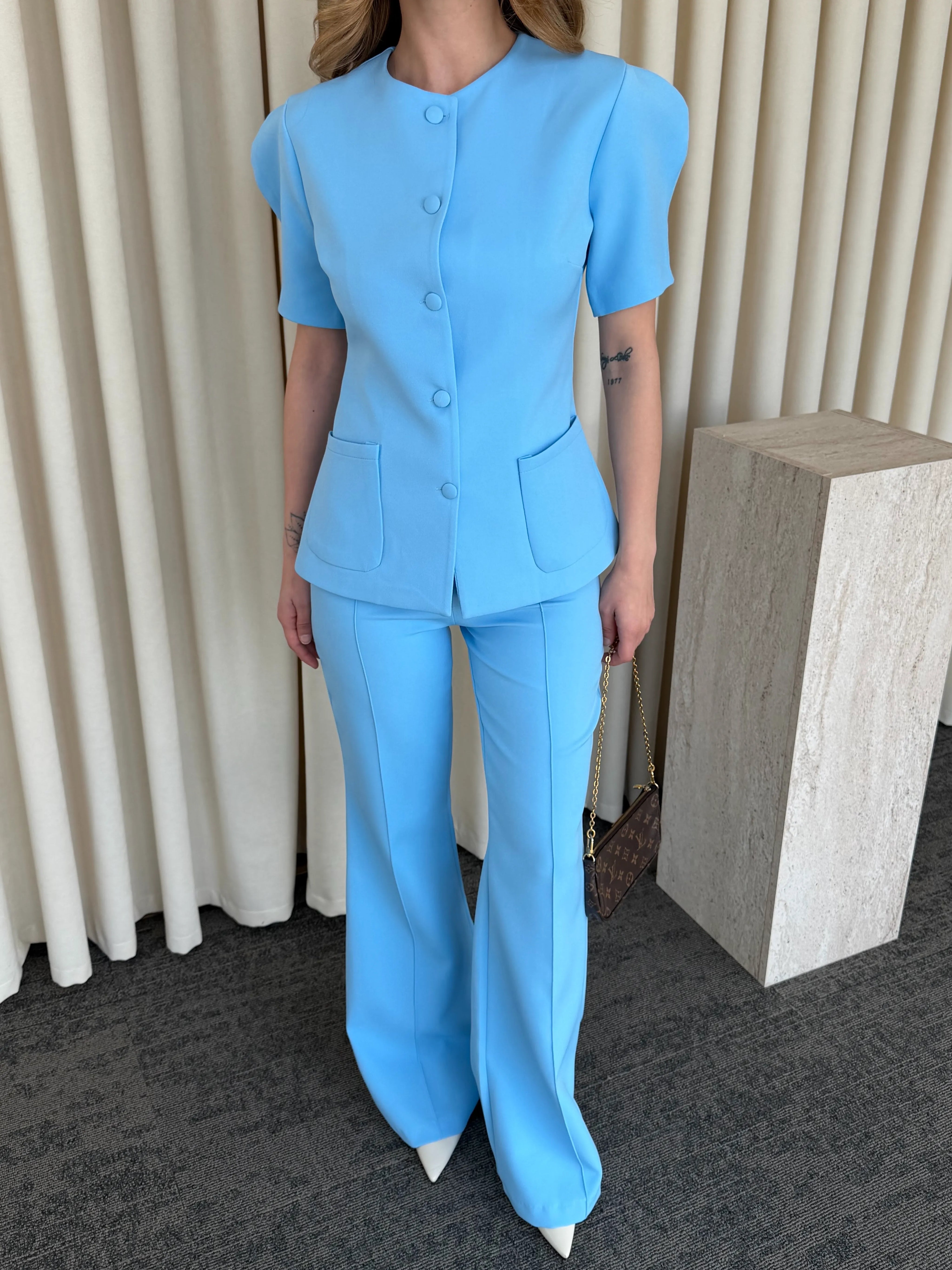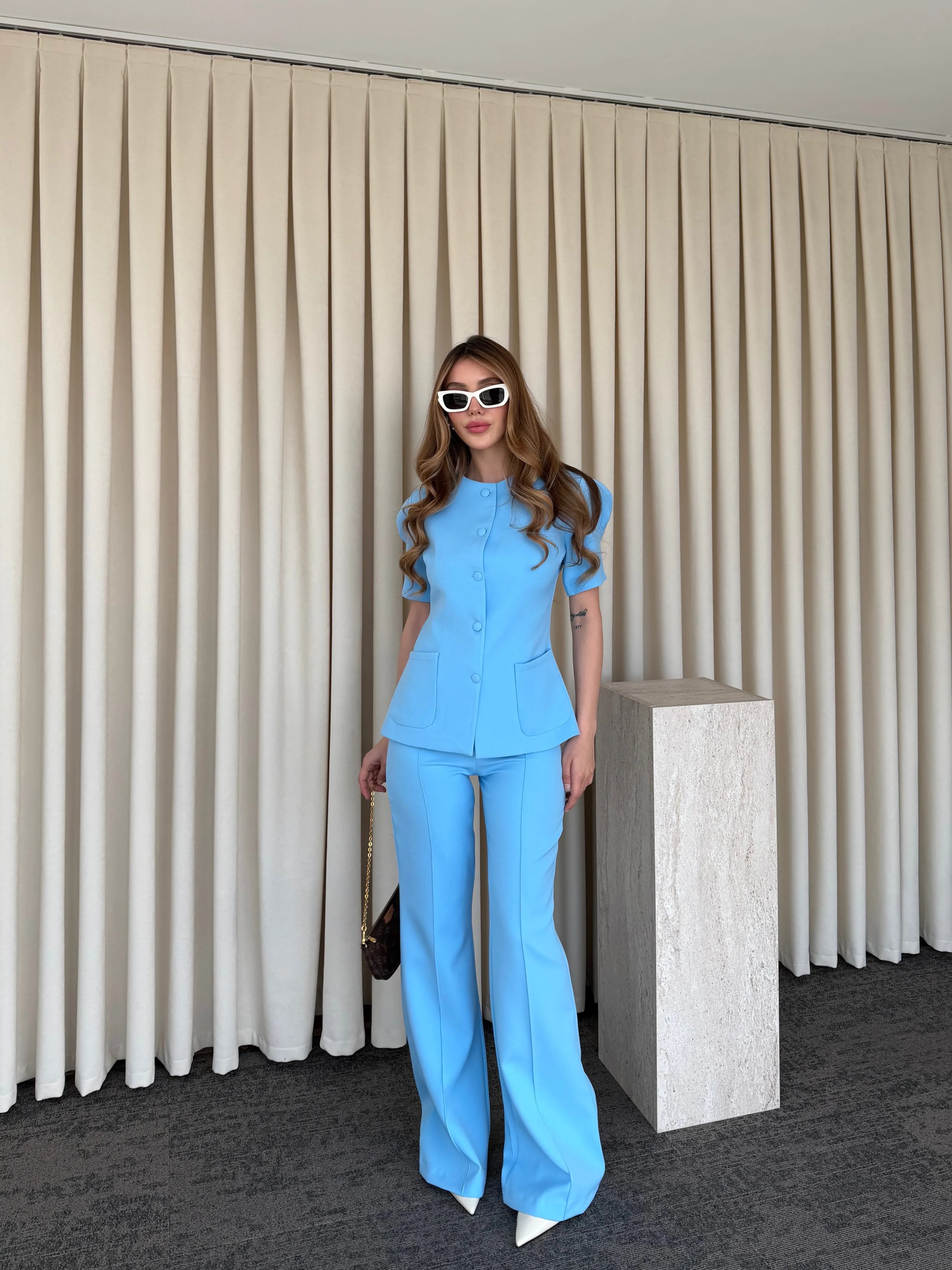 Üst parçadaki cep detayları ve bele oturan kalıp silueti dengelerken, yüksek bel ve geniş paça pantolon akıcı bir hareket kazandırır. Vücut formunu zarifçe toparlayan yapısı sayesinde hem konforlu hem de iddialı bir stil sunar.