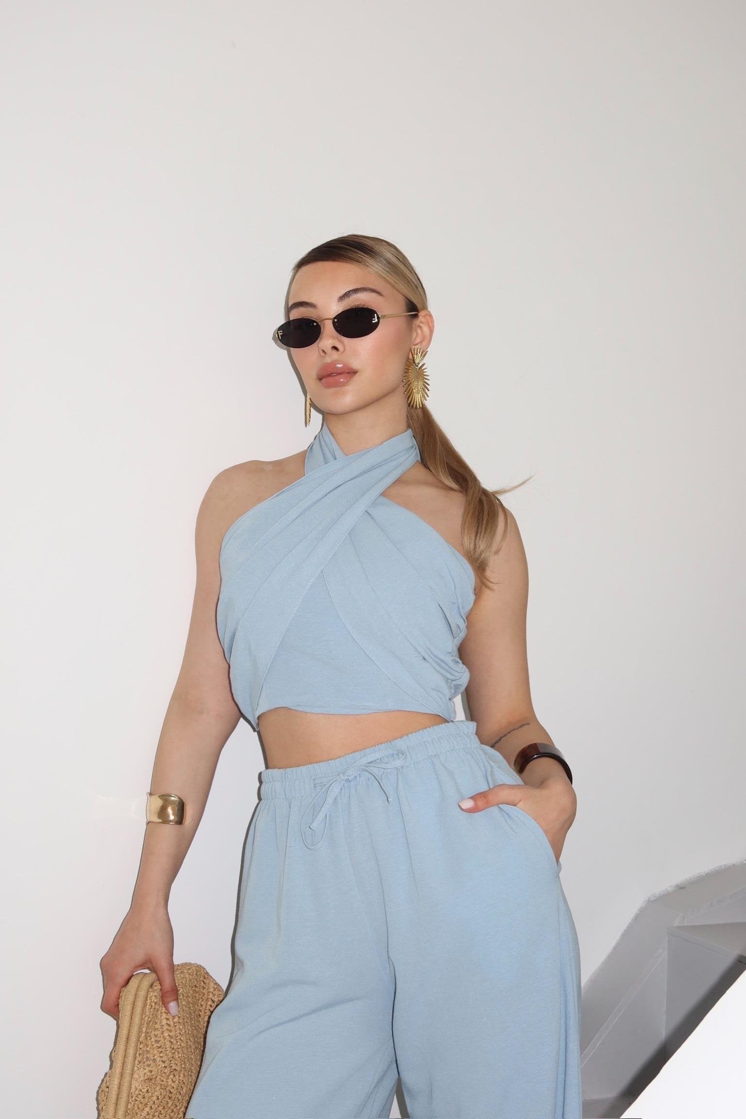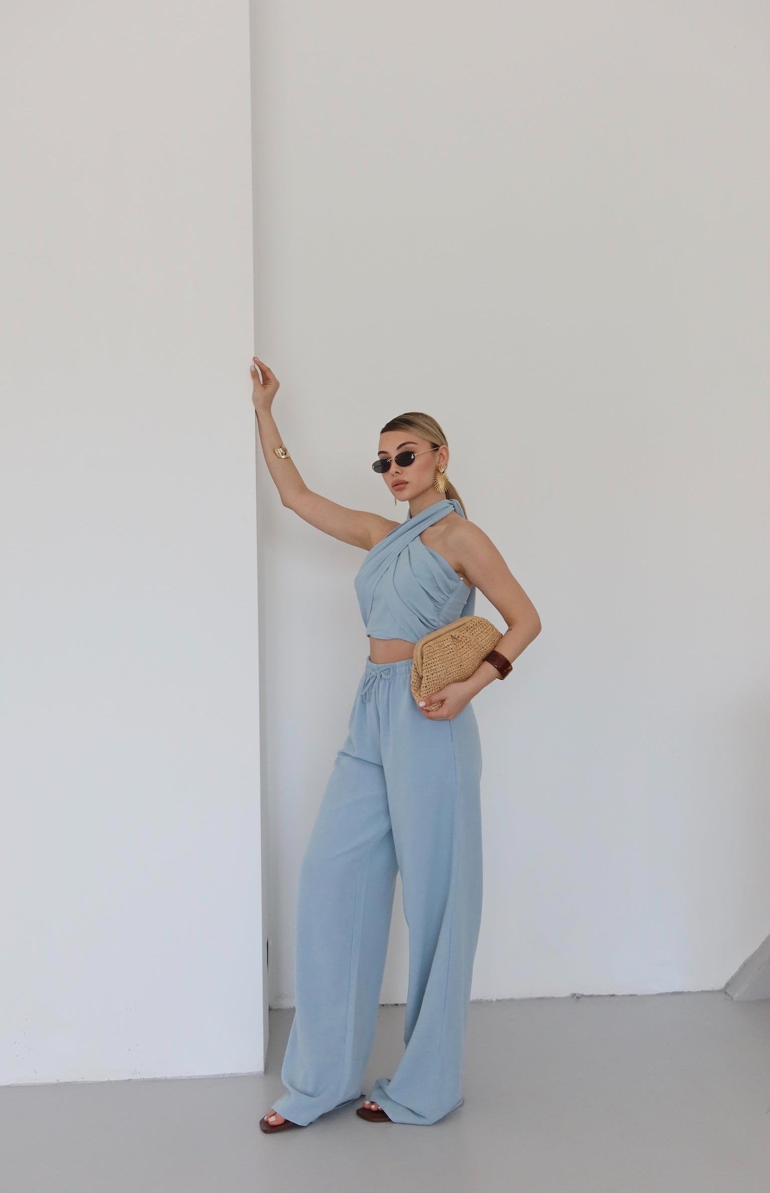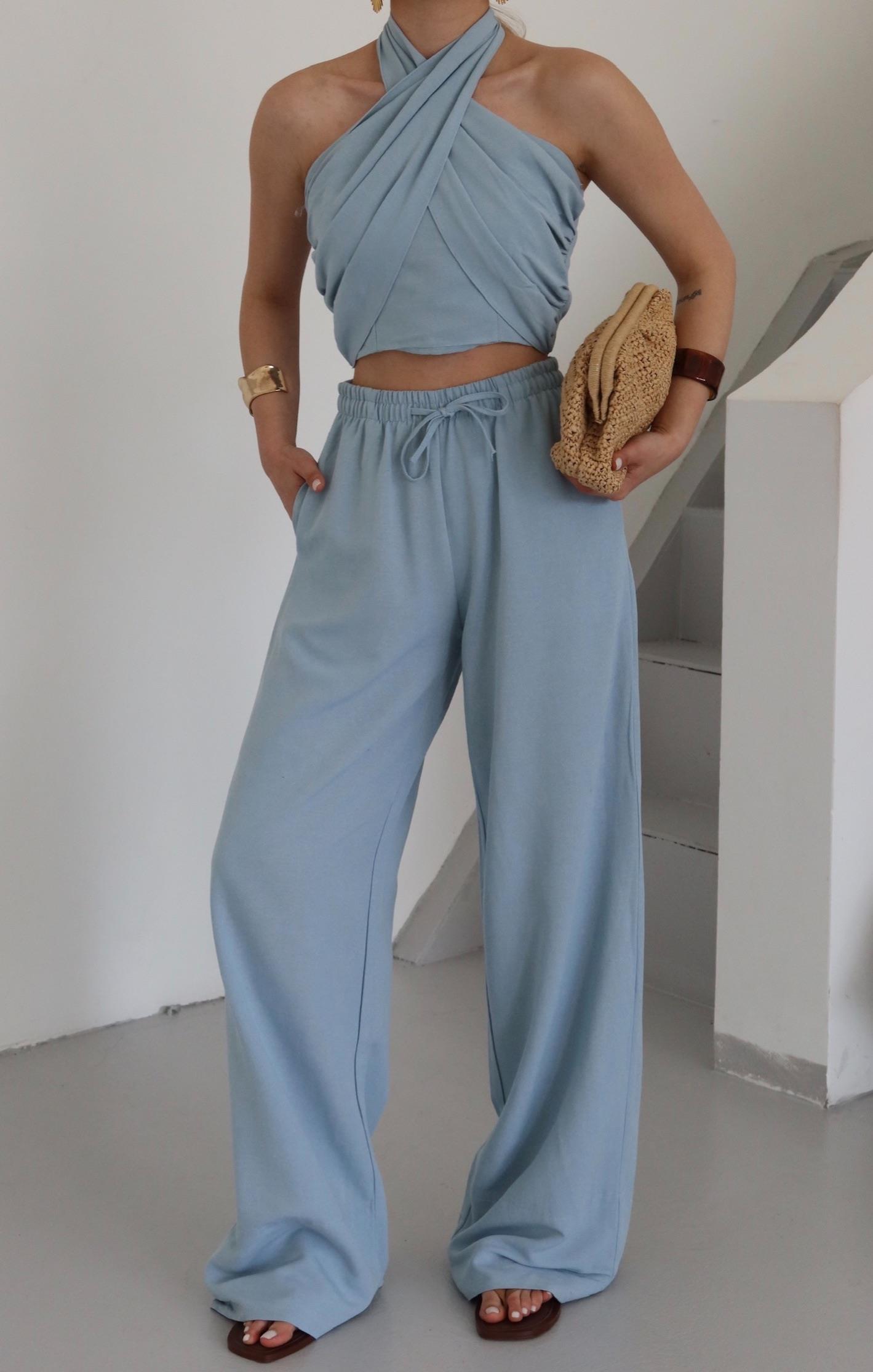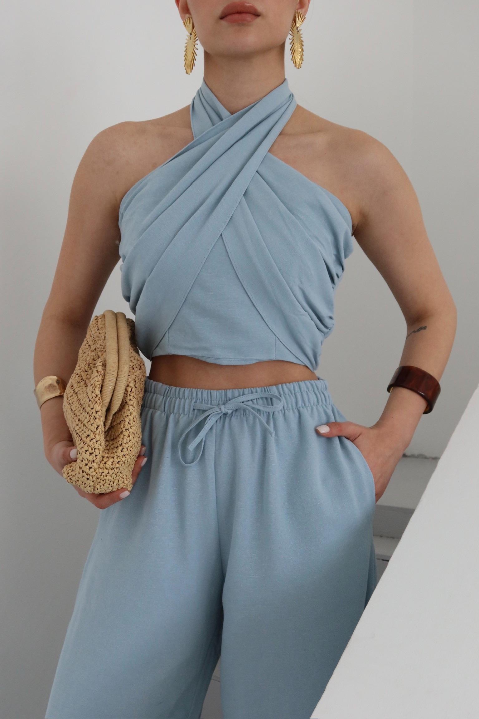 - Mavi Boyundan Bağlı Büstiyer Pantolon Takım