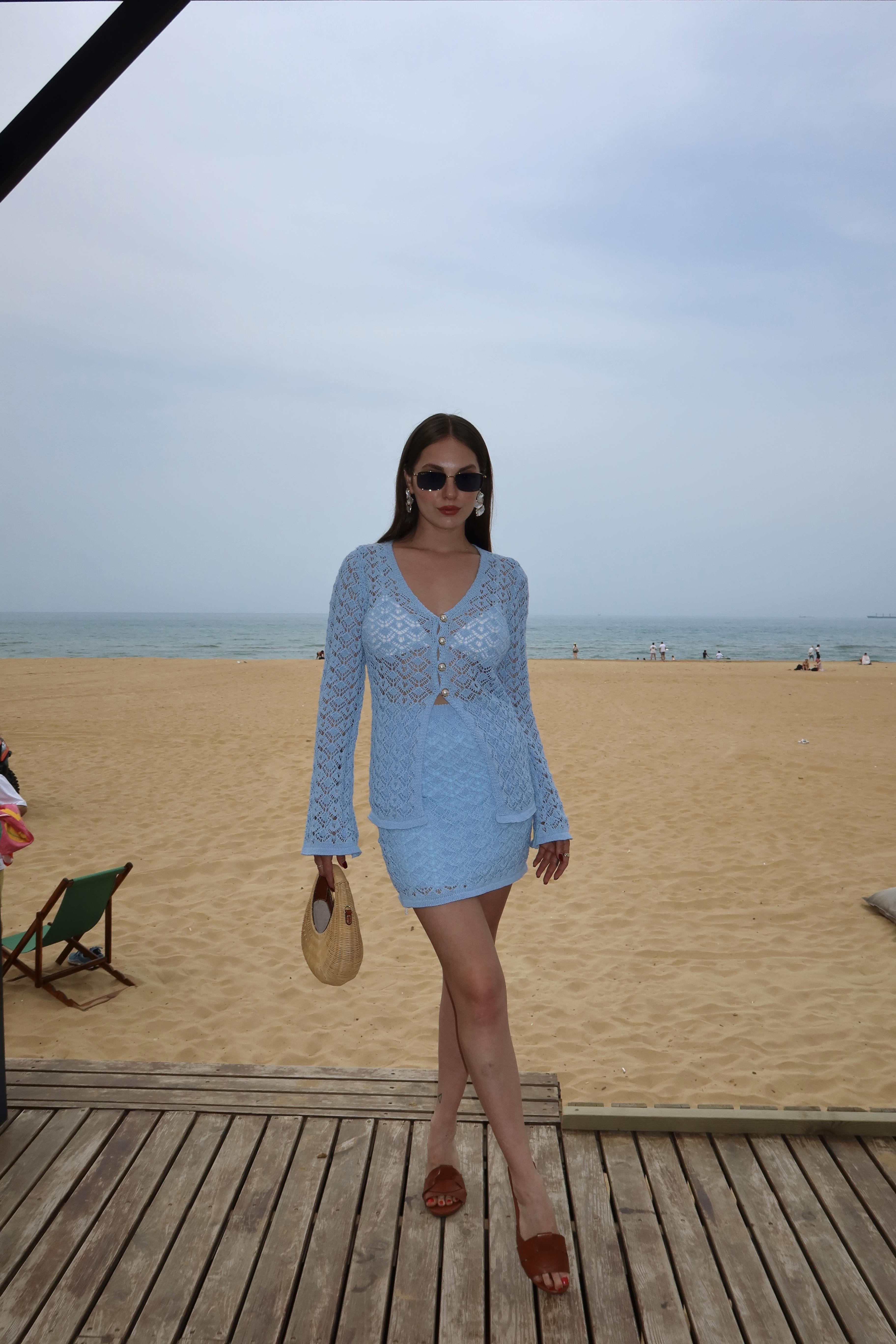 - Mavi İnci Düğmeli Hırka Etek Takım