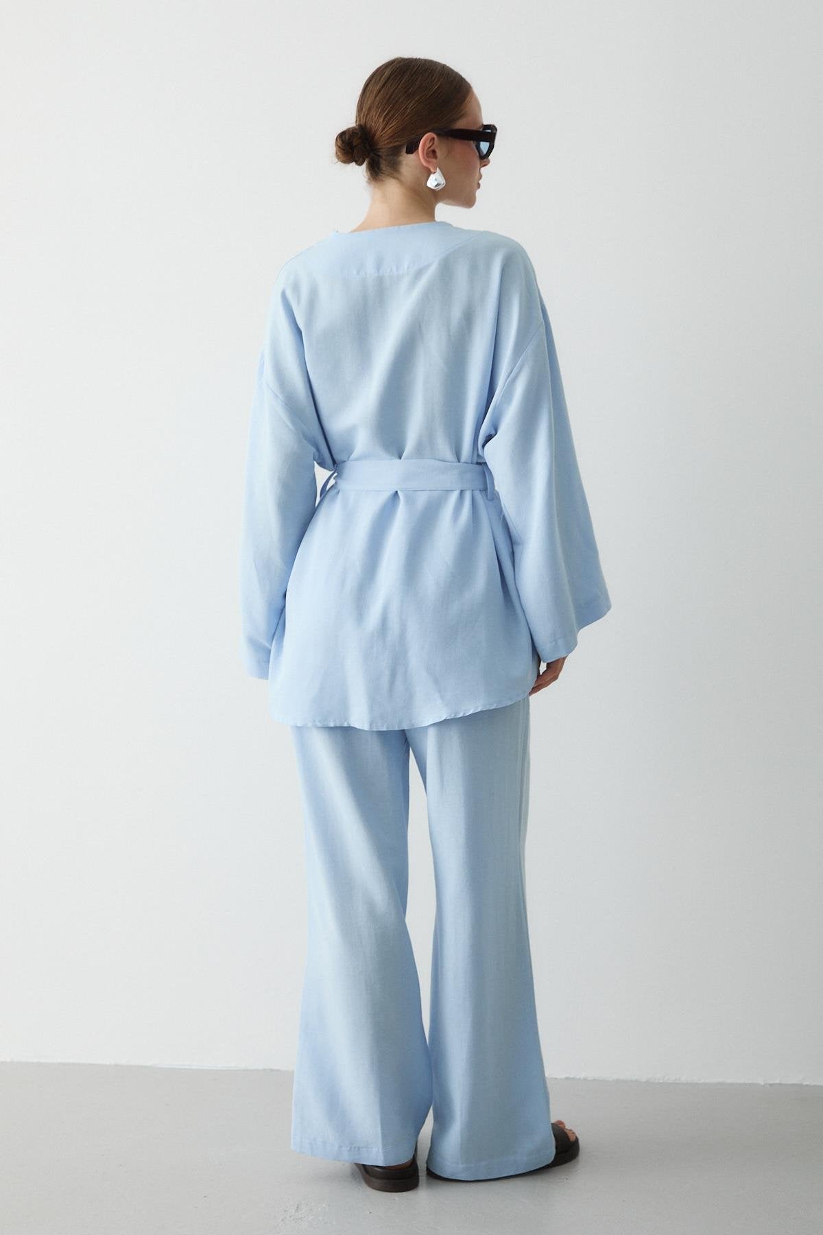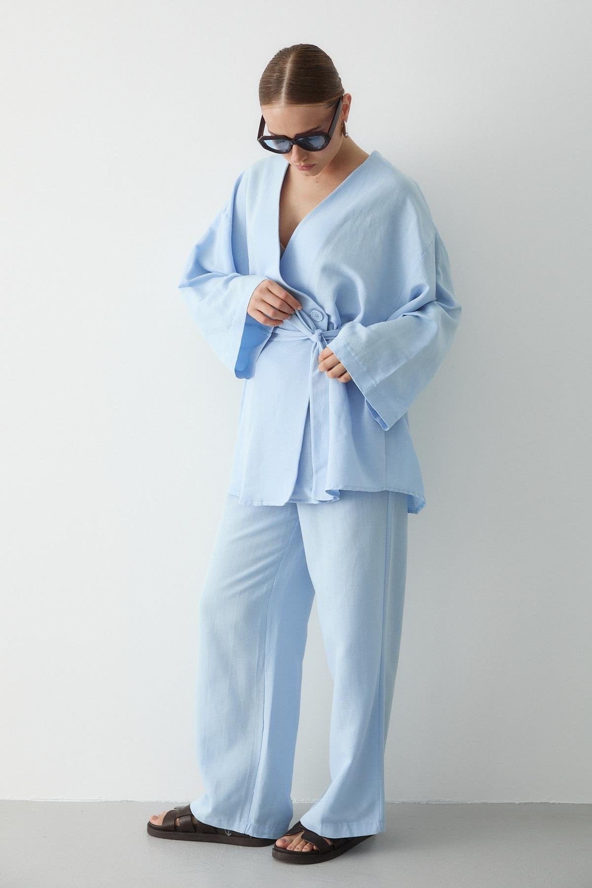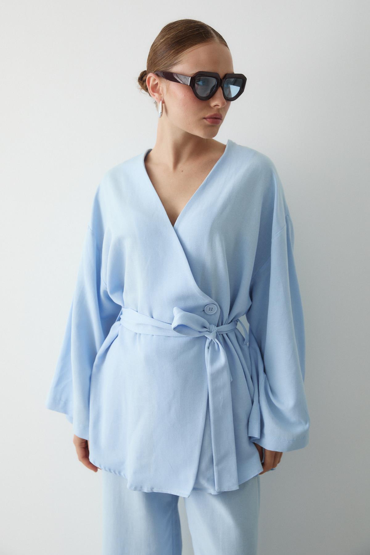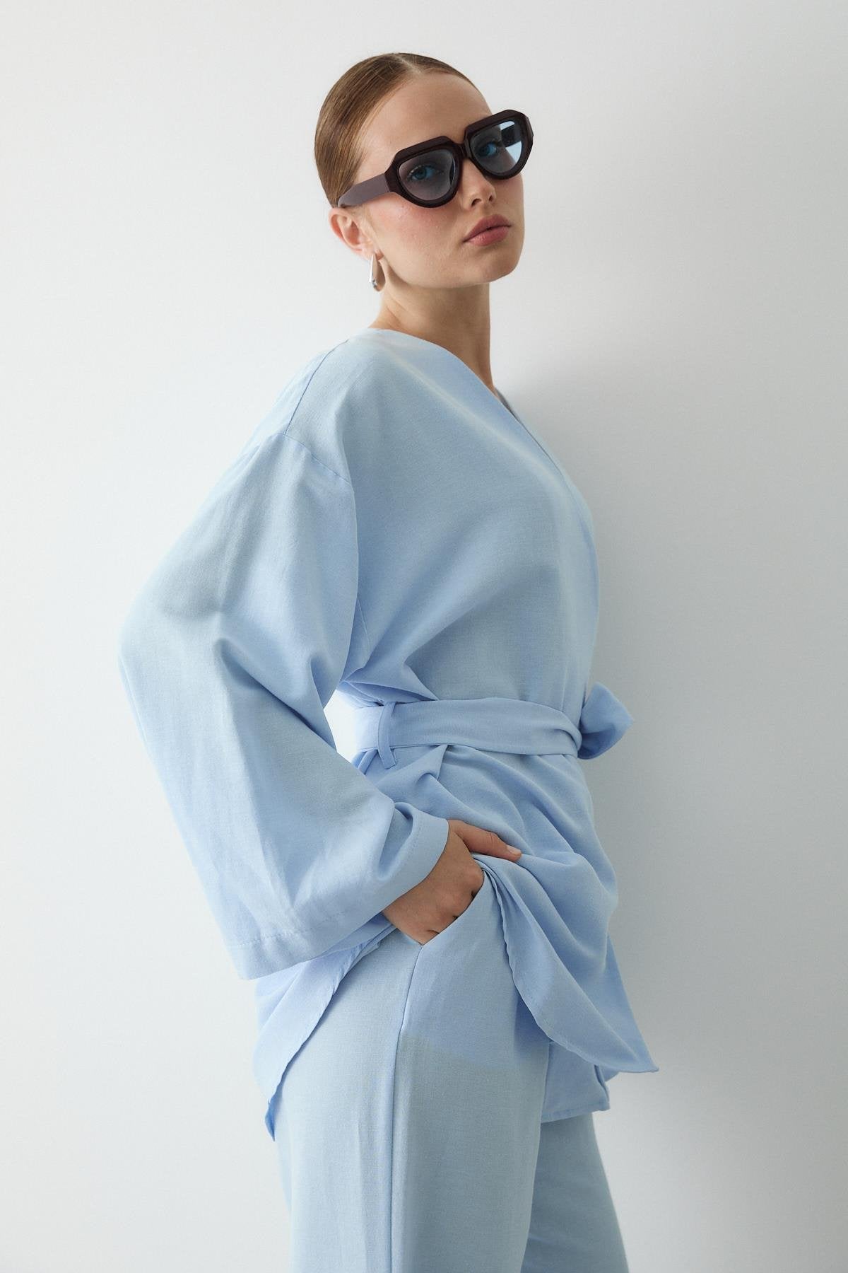 Mavi Pamuklu Düğme Detaylı Kemerli Keten Kimono