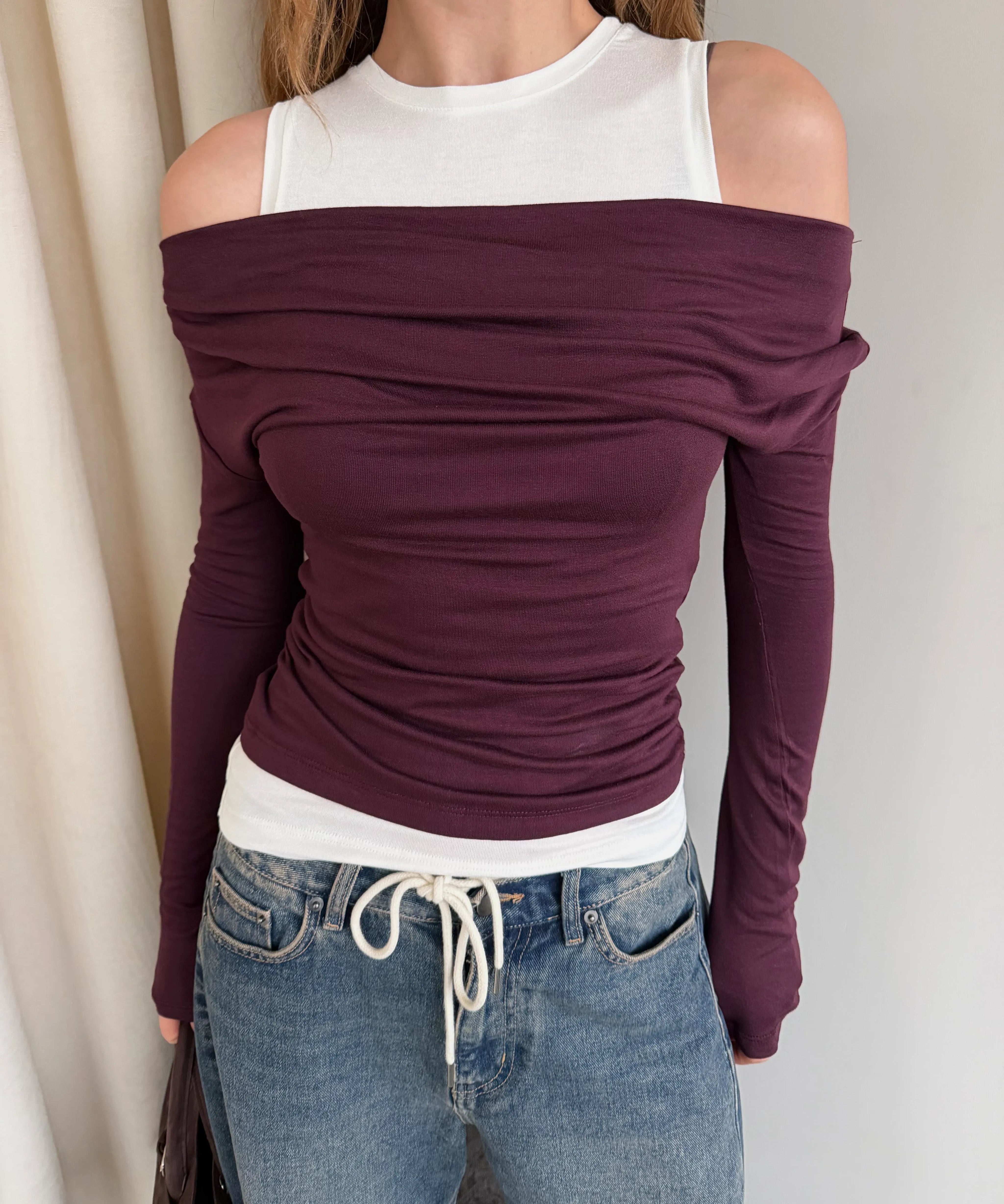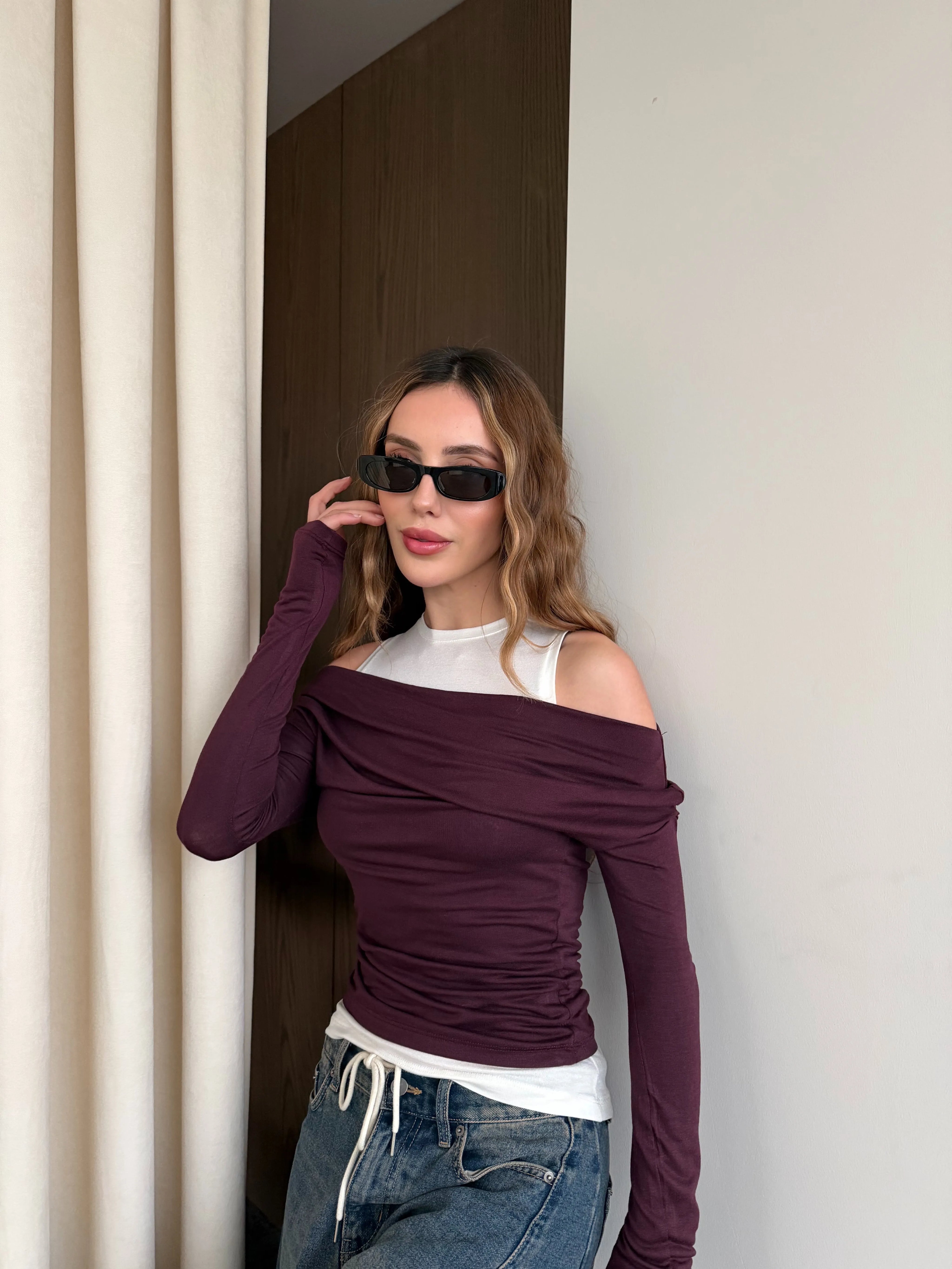 - Mürdüm Beyaz Atletli Kayık Yaka Bluz - 0780