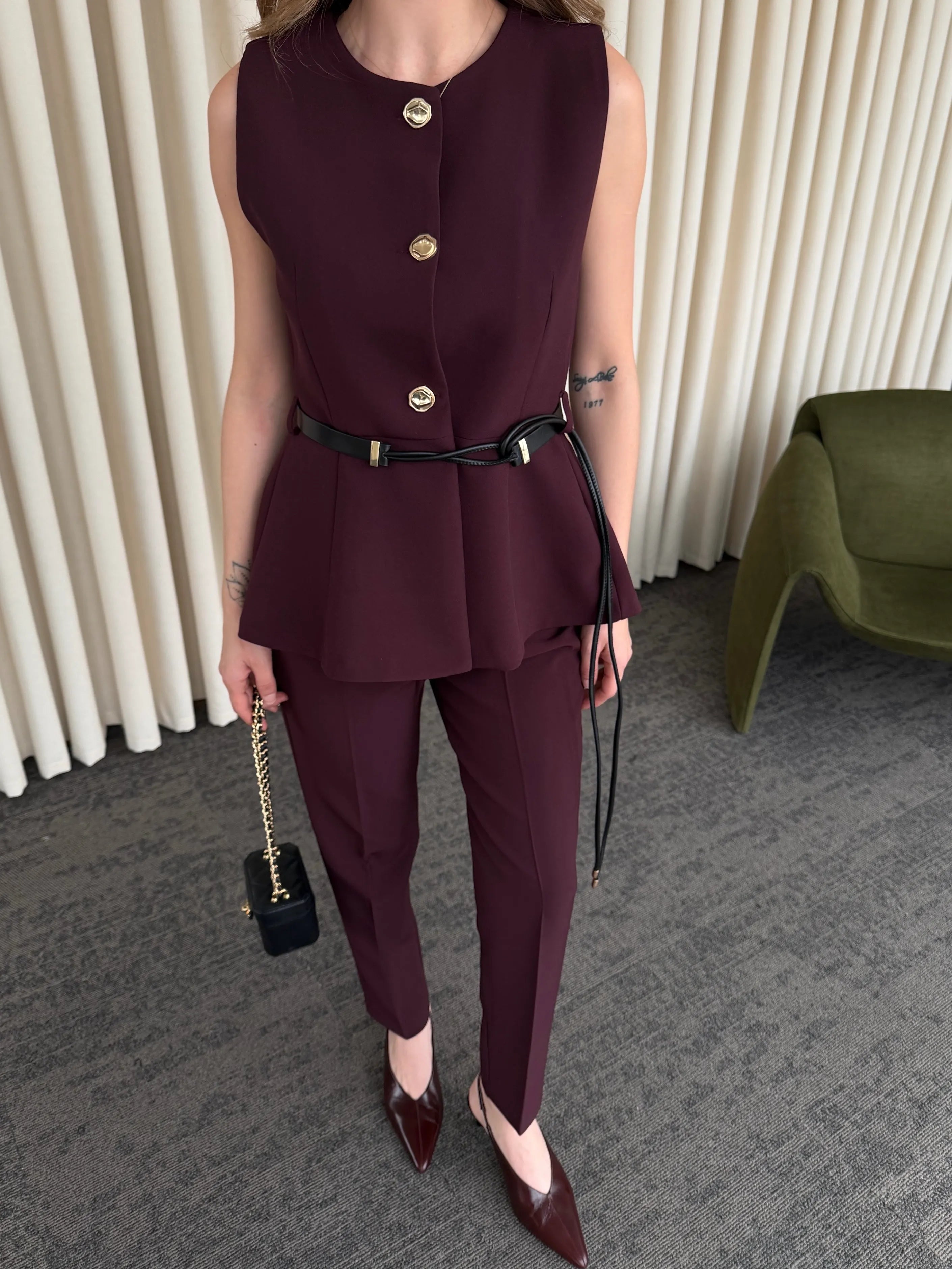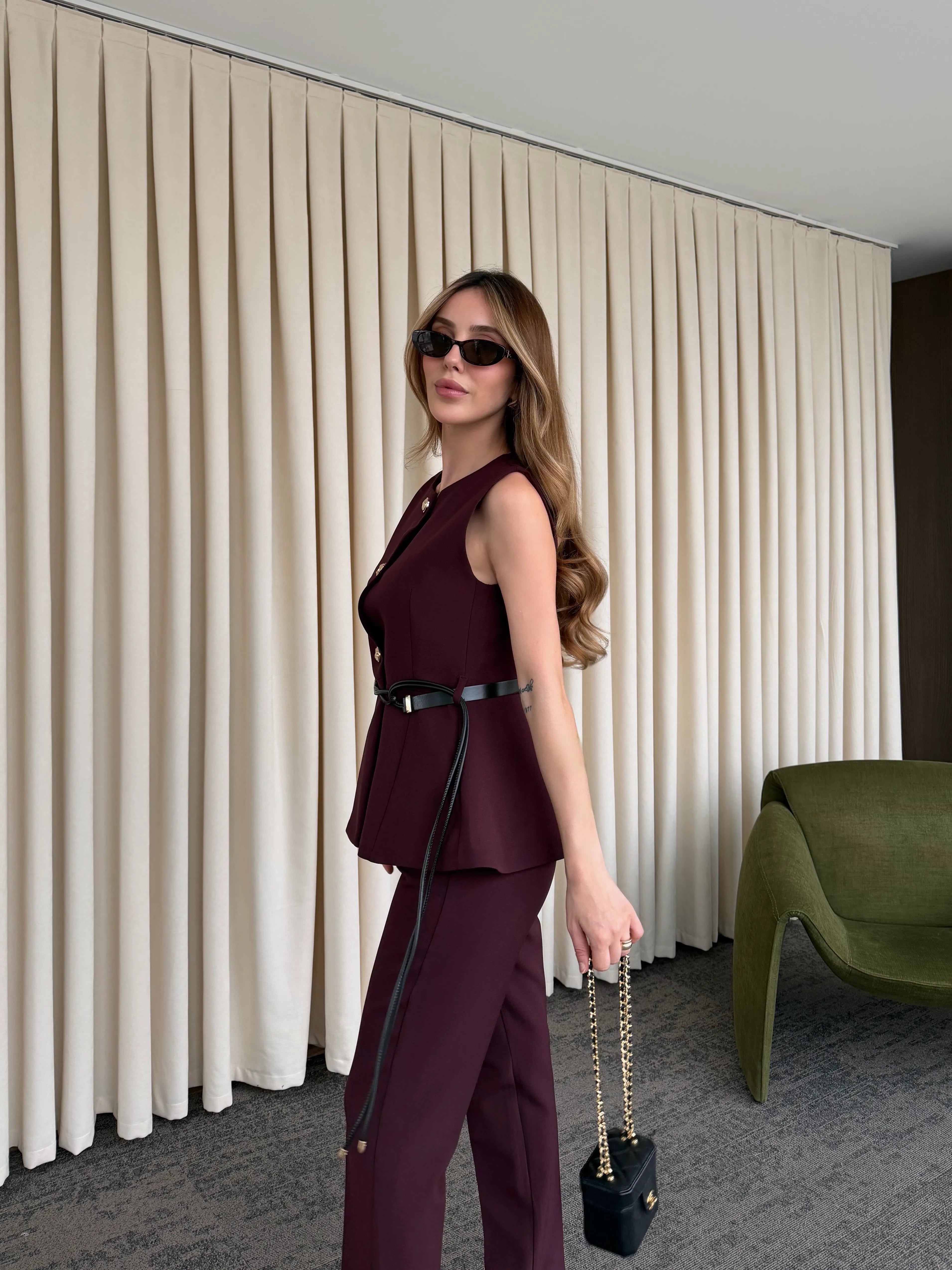 Mürdüm Kemerli Düğmeli Yelek - 9682