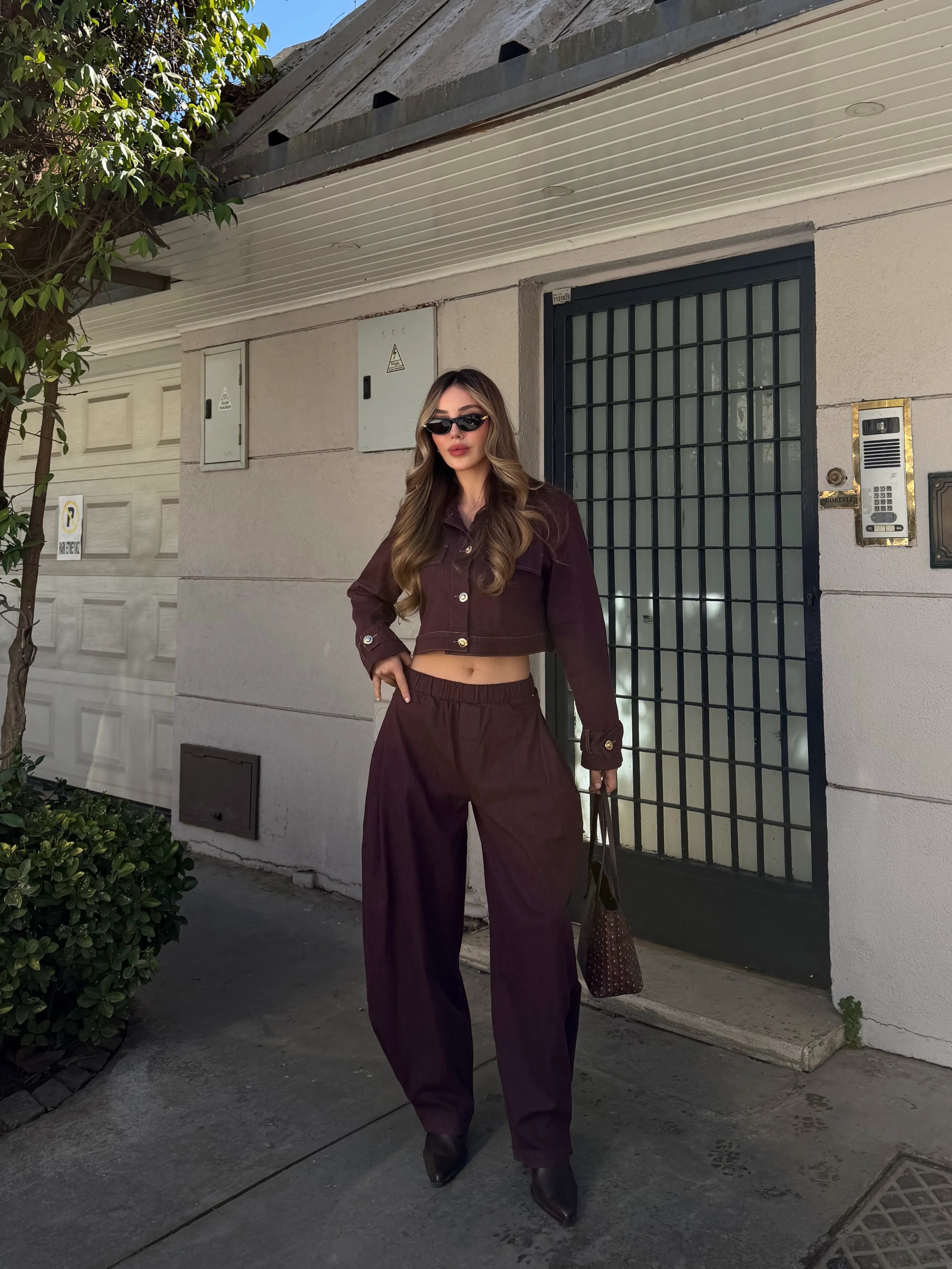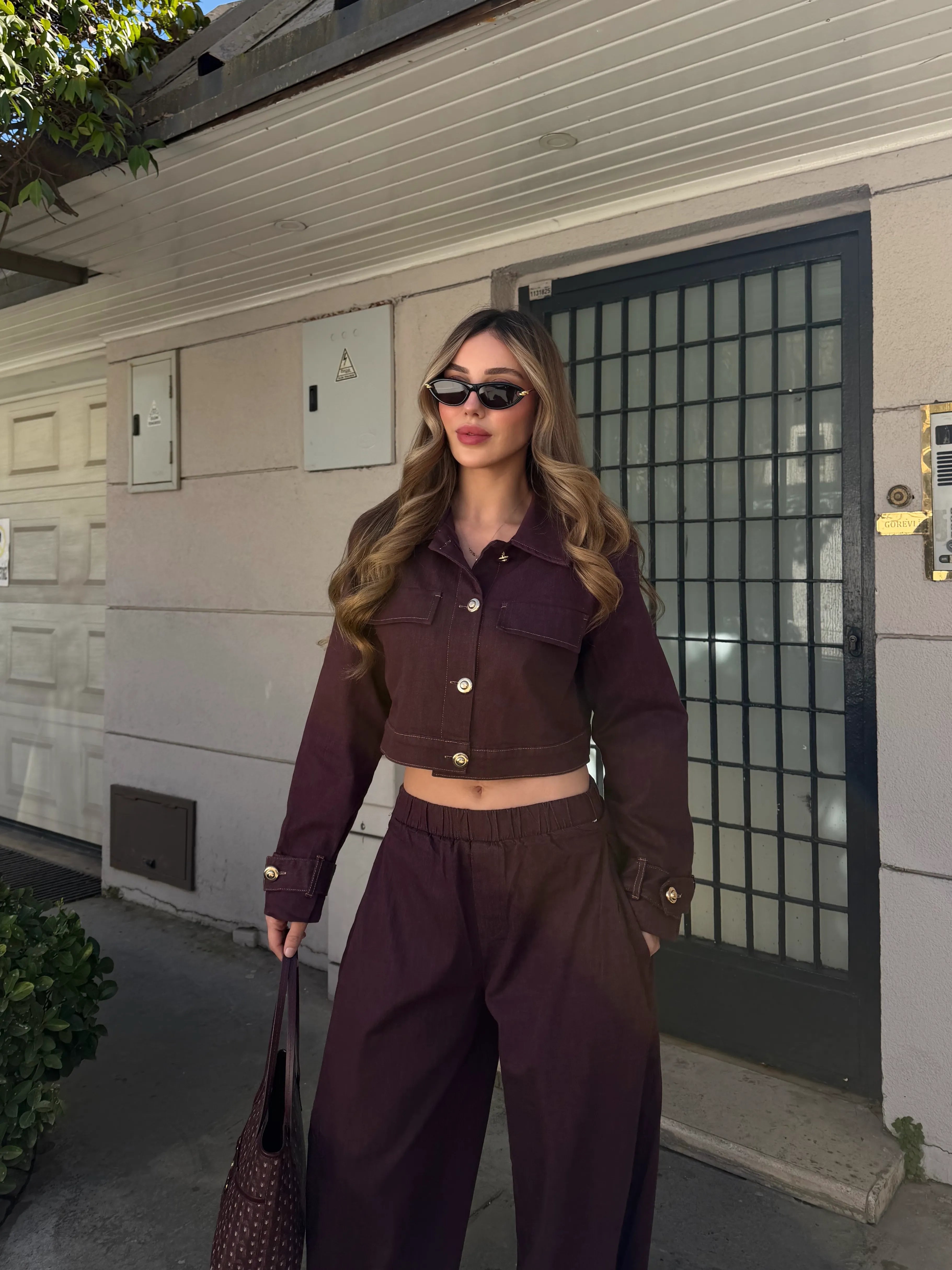 Modern tasarım anlayışının en seçkin örneklerinden biri olan bu set, derin mürdüm tonu ve yapısal formuyla gardırobunuzun temel parçası olmaya aday. Şehir hayatının dinamizmine uygun, hem ofis şıklığında hem de akşam etkinliklerinde tercih edilebilir.