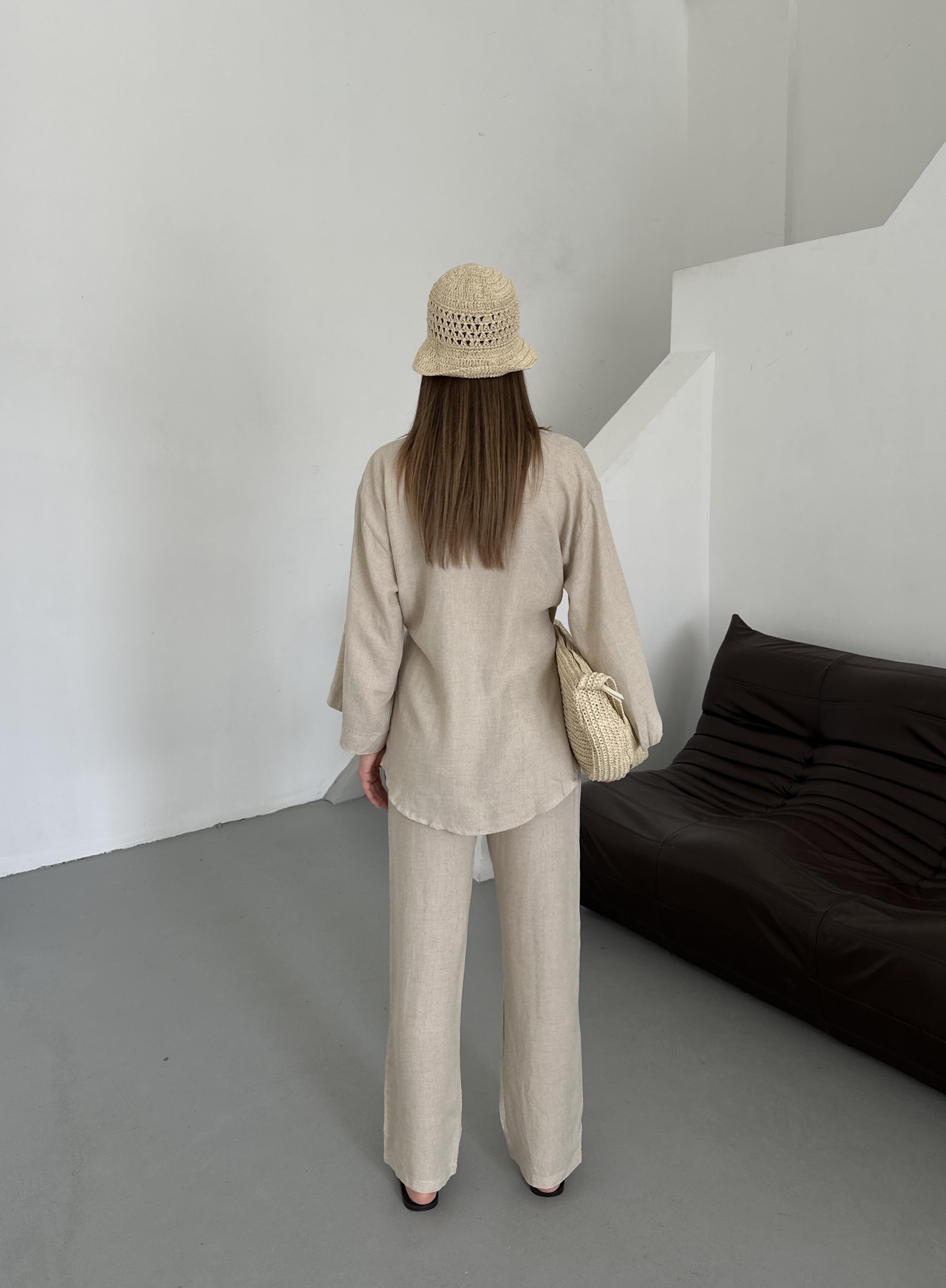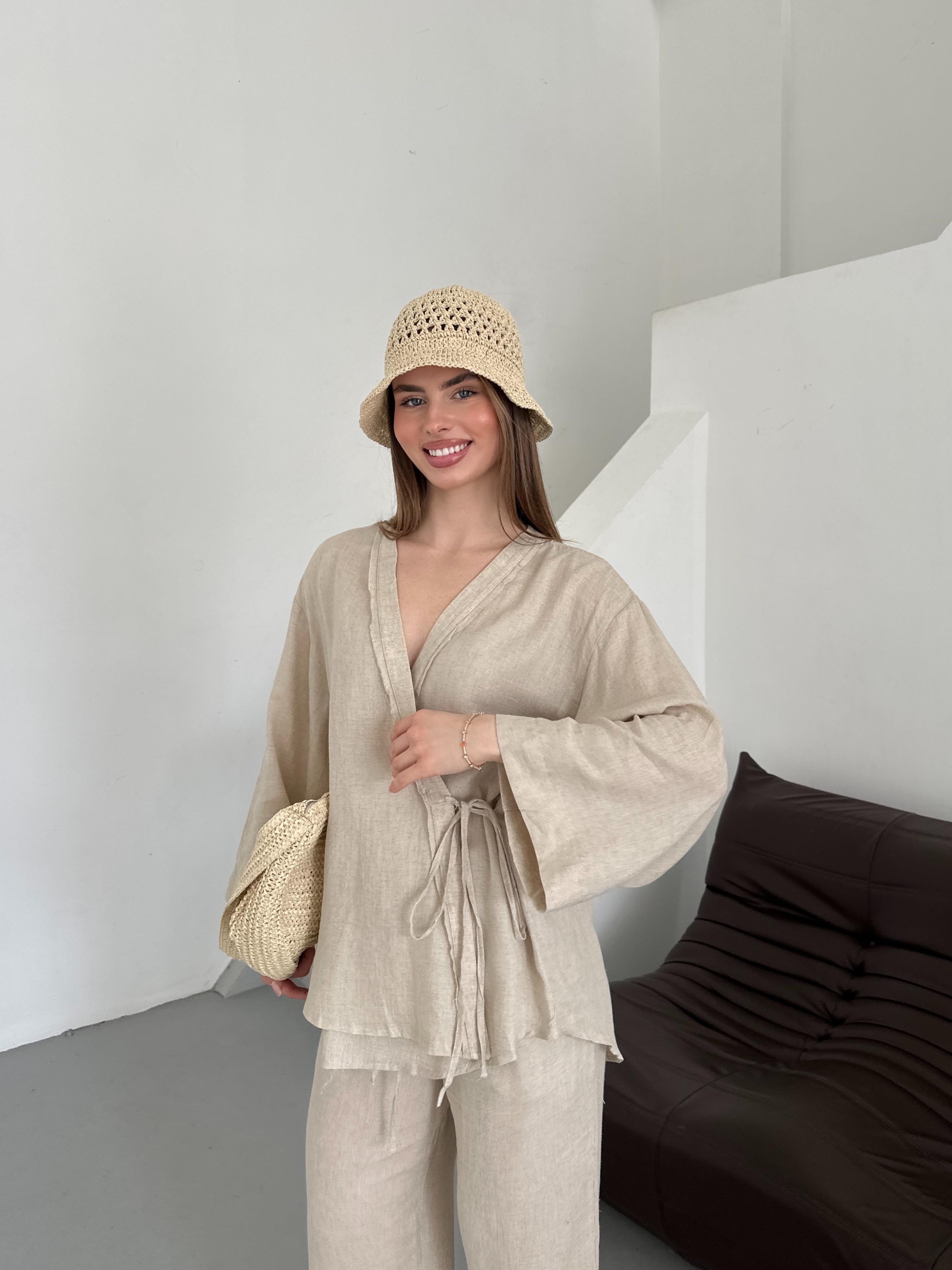 - Natural Detaylı Yan Bağlamalı Keten Kumaş Kimono Takım