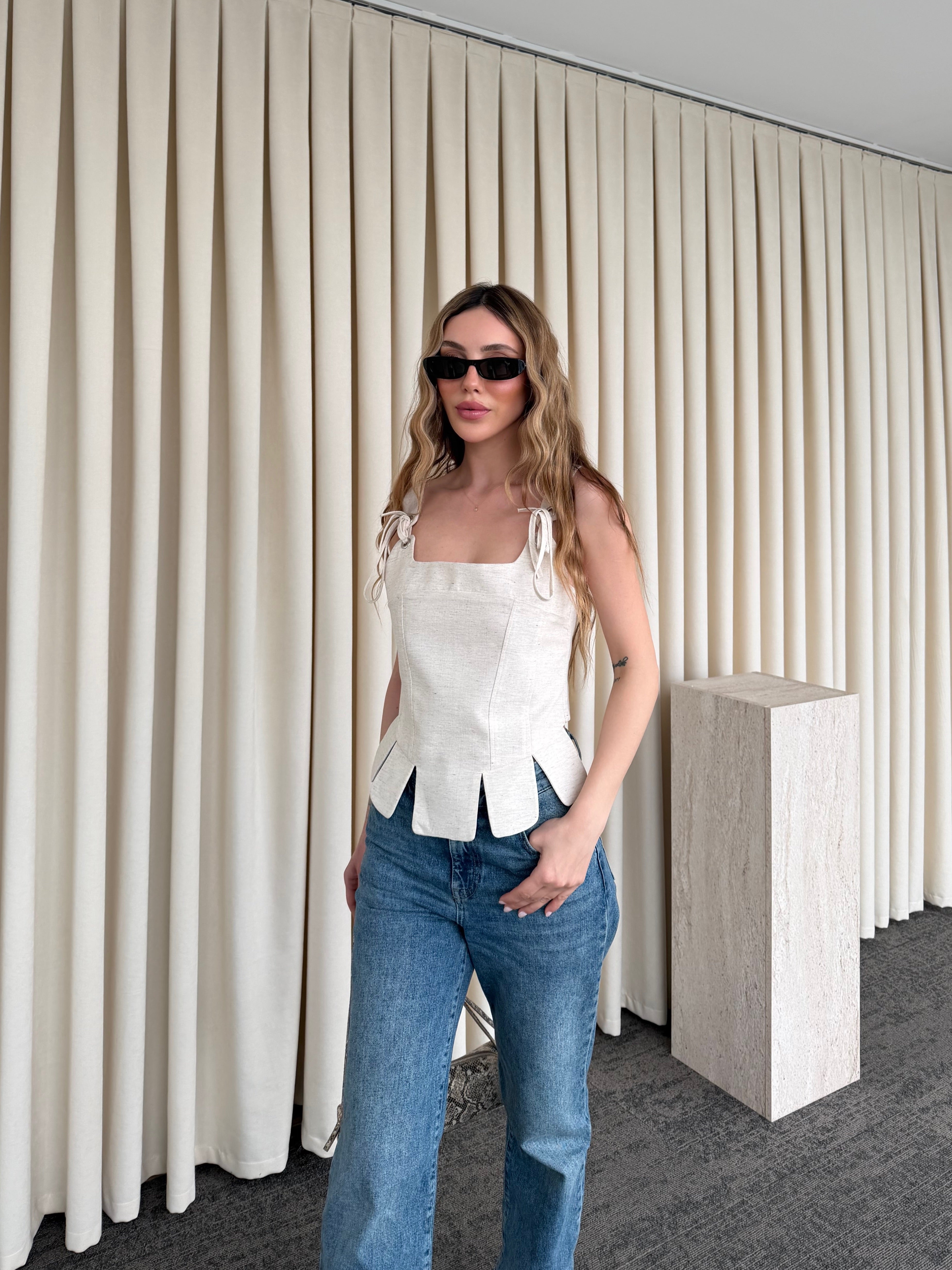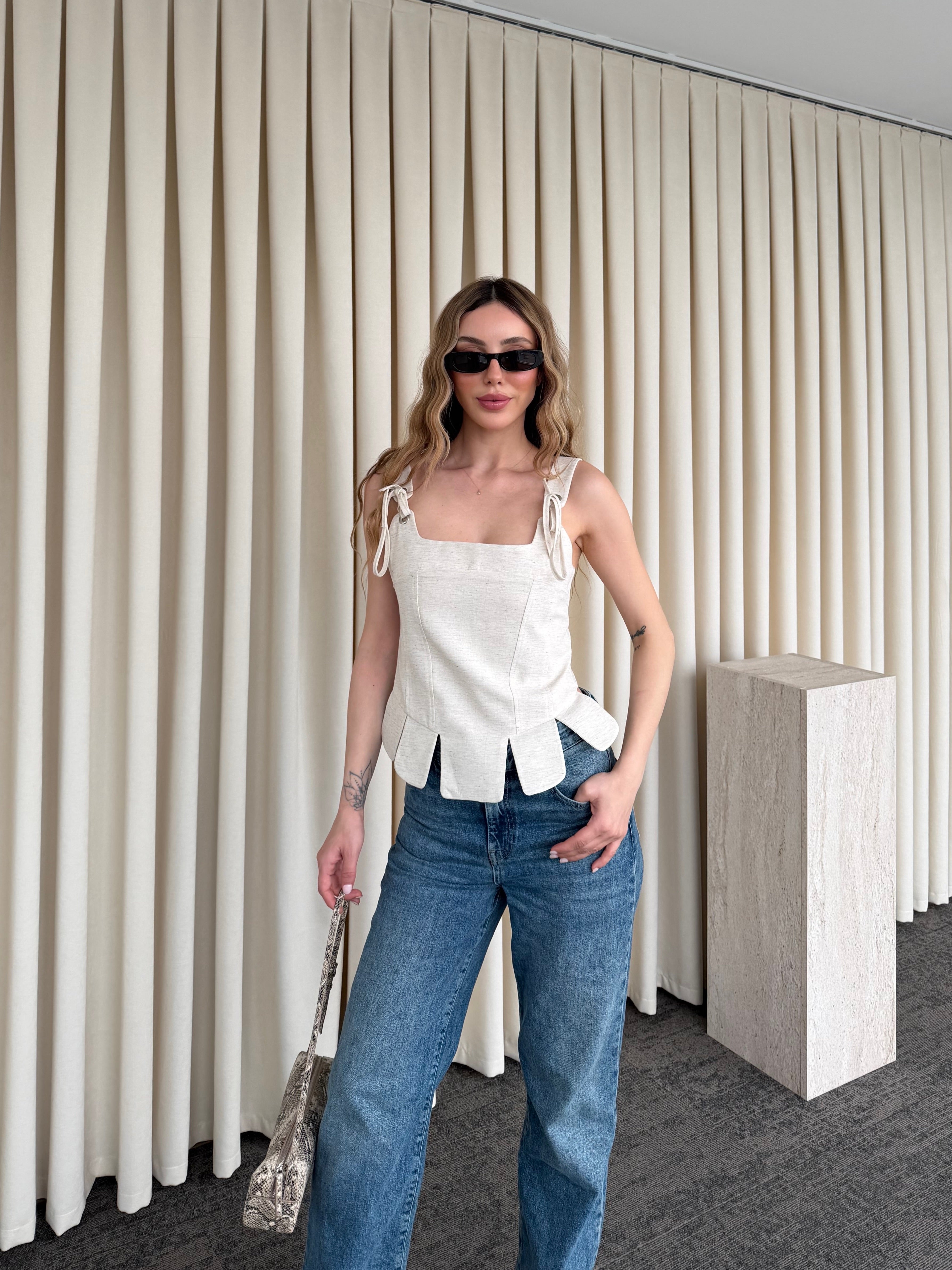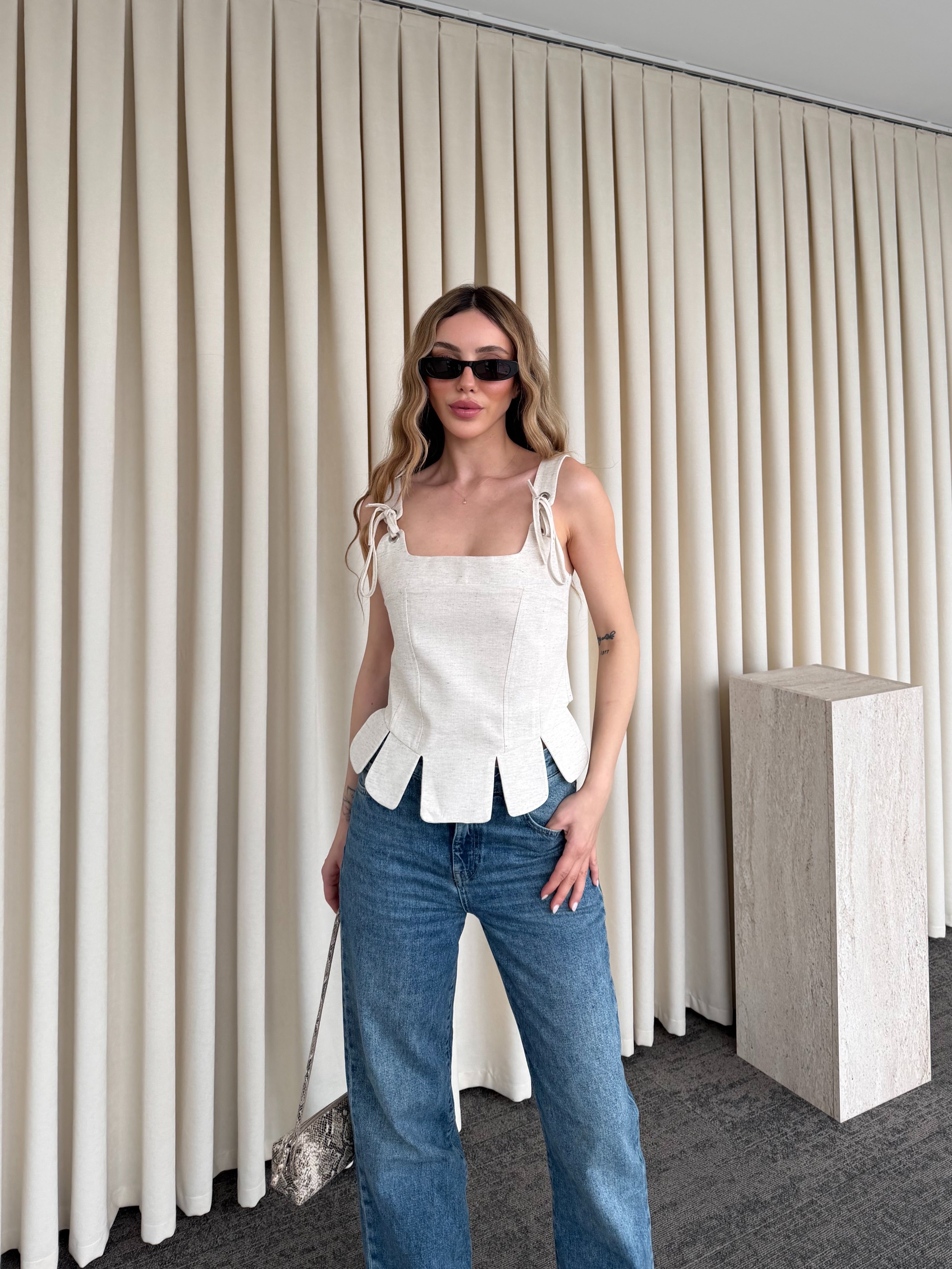 Zarif detayların modern yorumuyla tasarlanan bu bluz, sade şıklığın en etkileyici halini sunuyor. Omuzlardaki bağcık detayları feminen bir dokunuş katarken, yapılandırılmış formu vücuda kusursuz bir şekilde oturur. Alt kısmındaki hareketli kesim, tasarıma dinamizm kazandırarak klasik çizgiyi özgün bir stile dönüştürür.
