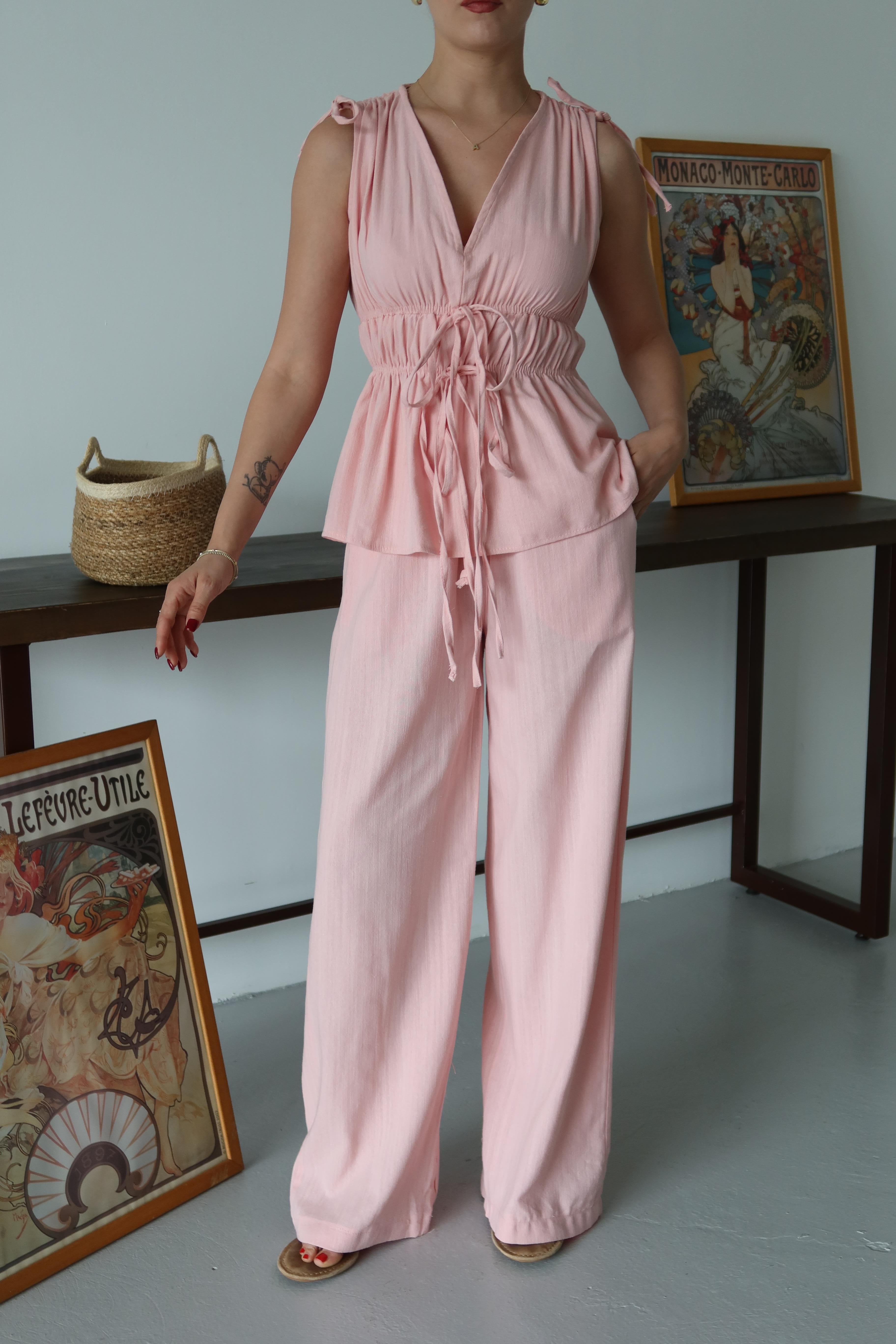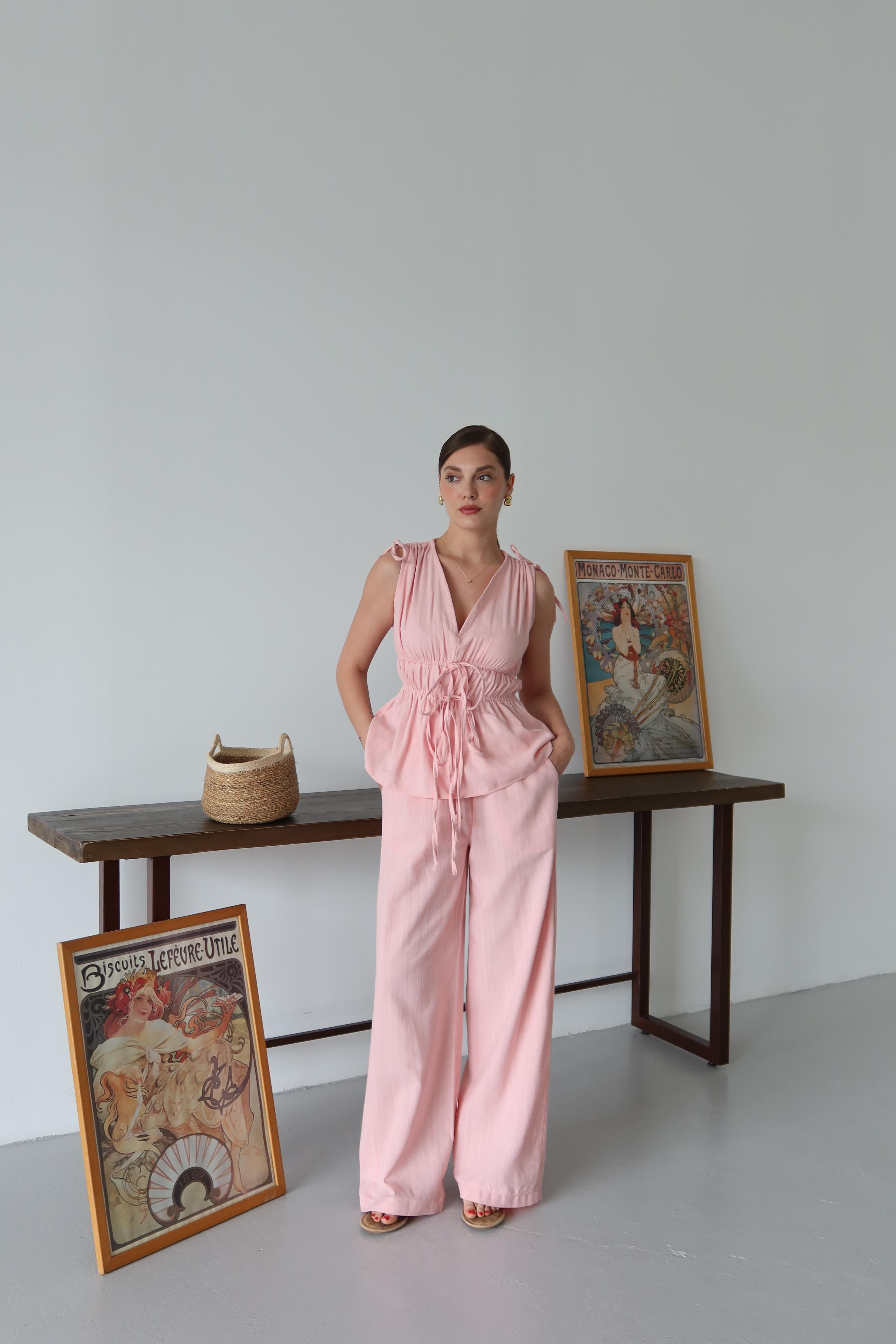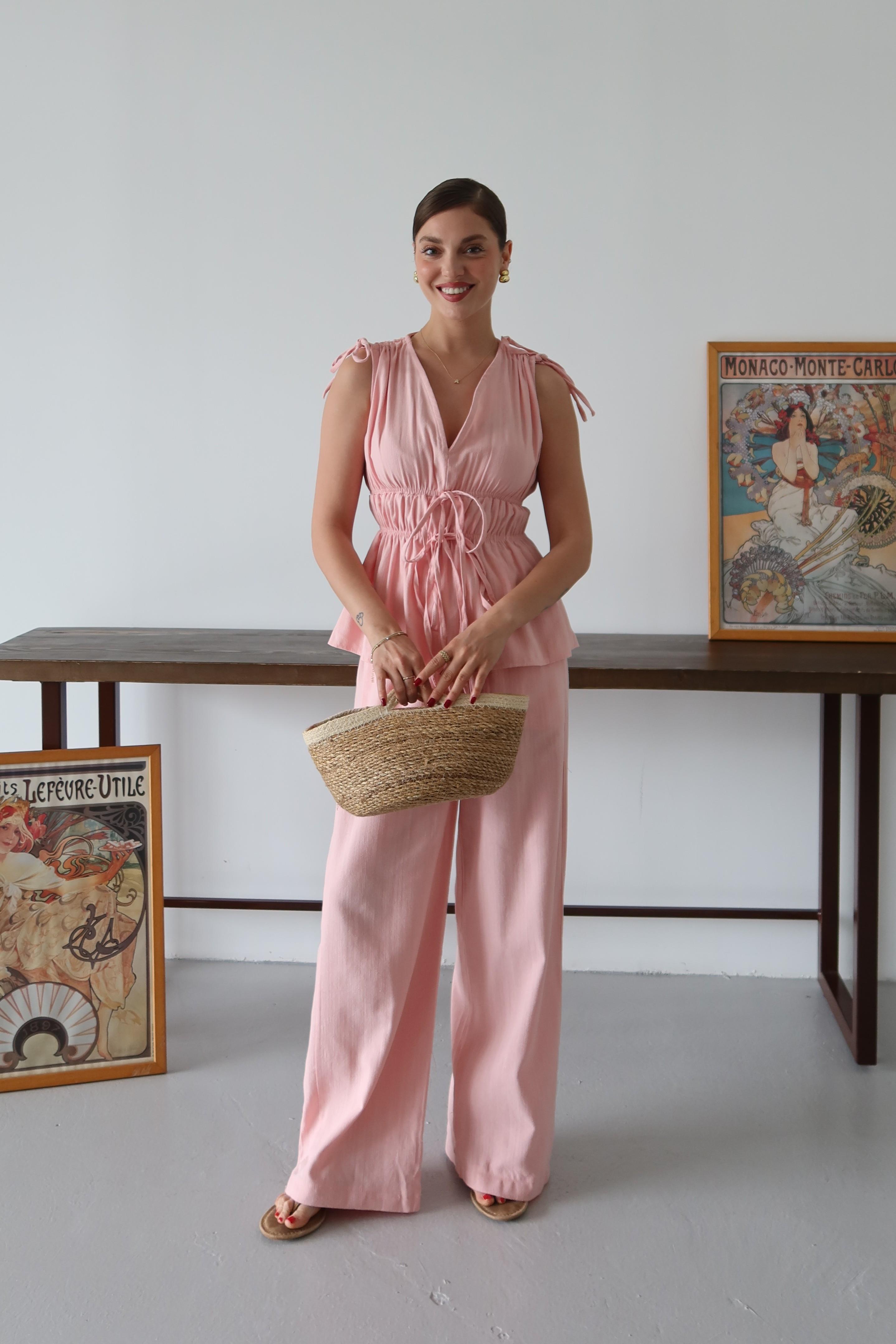 Pembe %100 Pamuk Omuz Bel Büzgülü Bluz Pantolon Takım