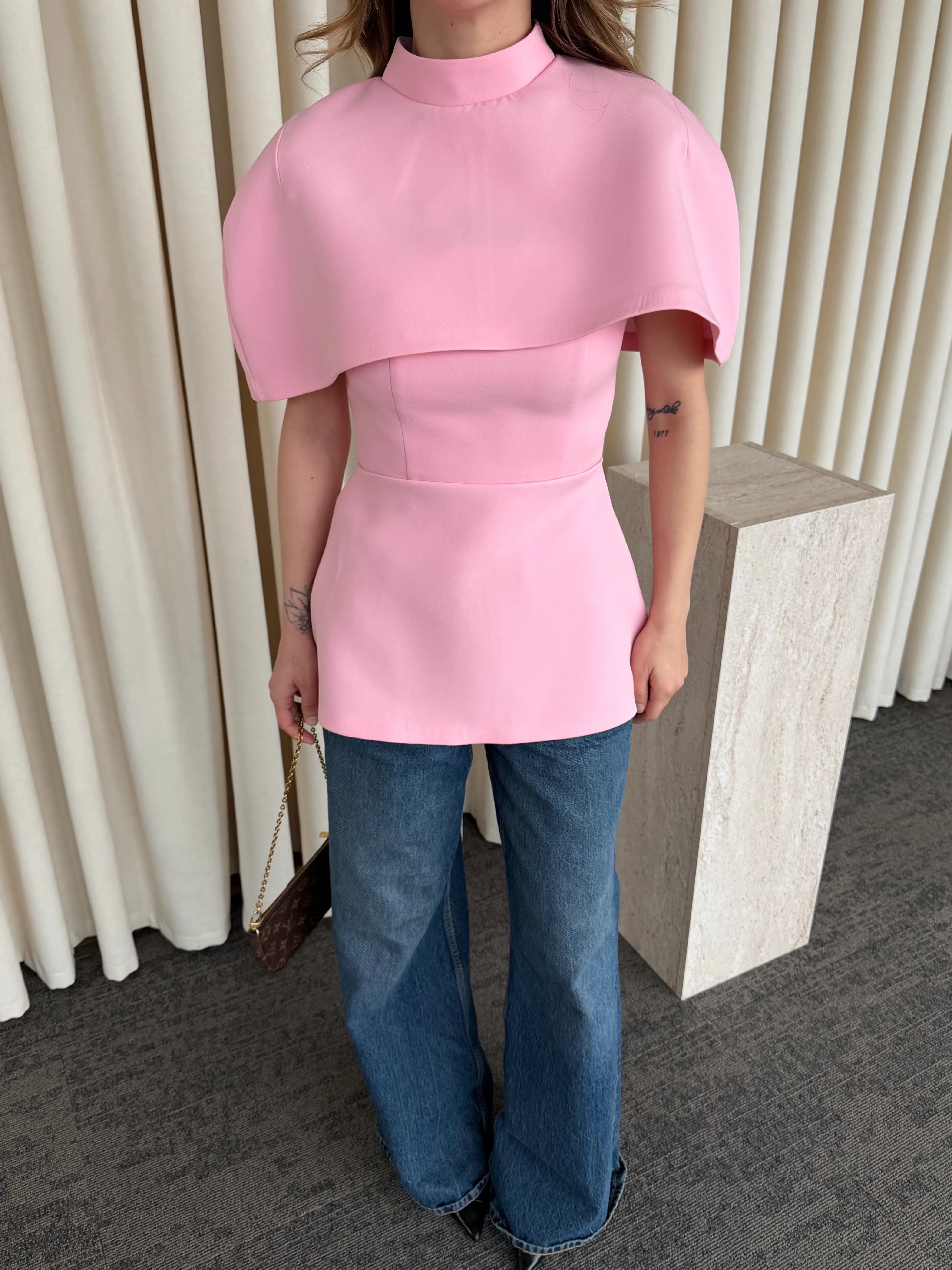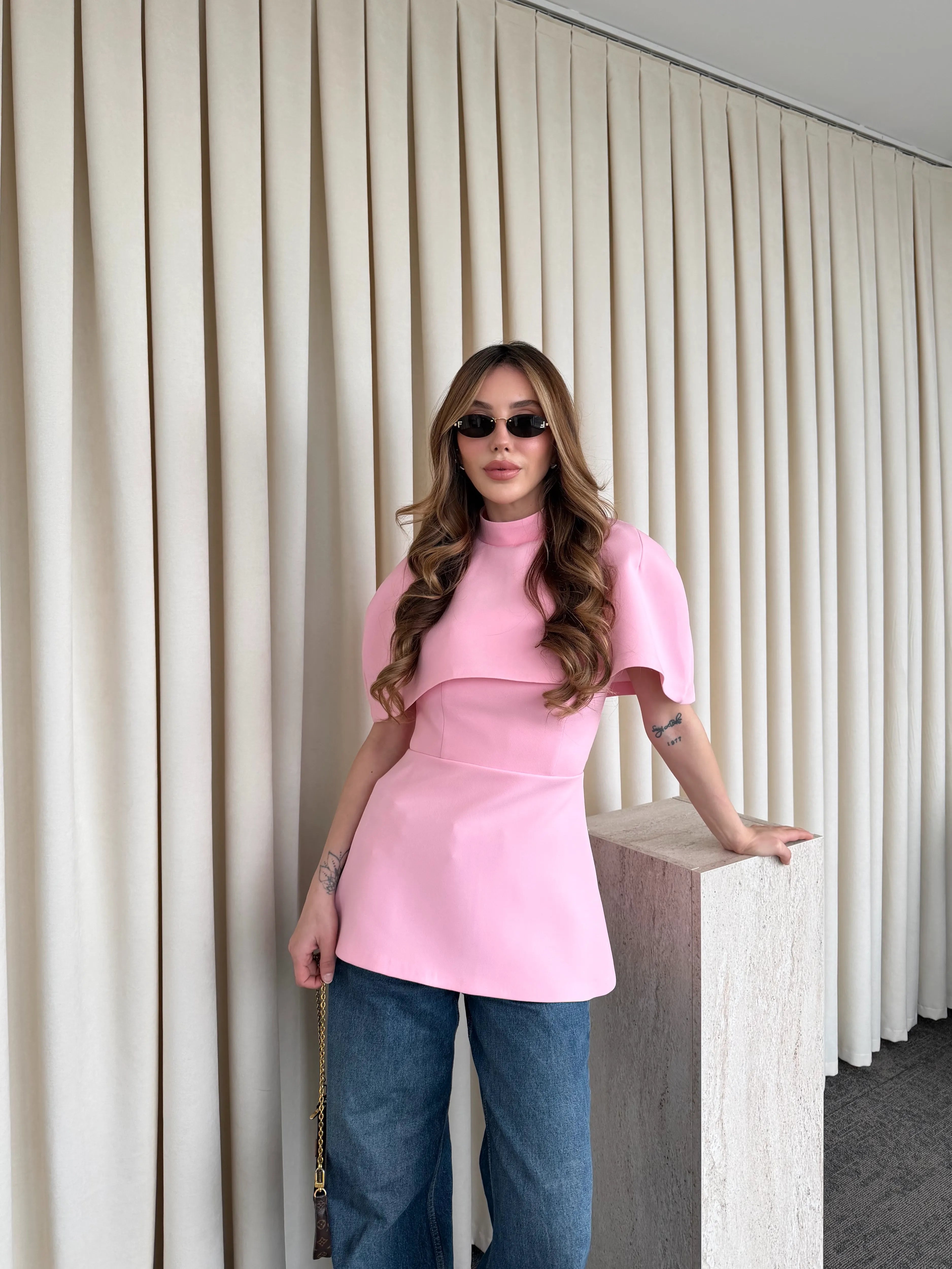 Modern kesimi ve güçlü siluetiyle öne çıkan bu bluz, stiline net bir duruş kazandırır. Omuzları hacimli gösteren pelerin formu ve sade yaka detayı, tasarıma karakterli bir hava katar. Bel hizasında dengeli şekilde oturan yapısı sayesinde hem pantolon hem eteklerle kolayca kombinlenir.