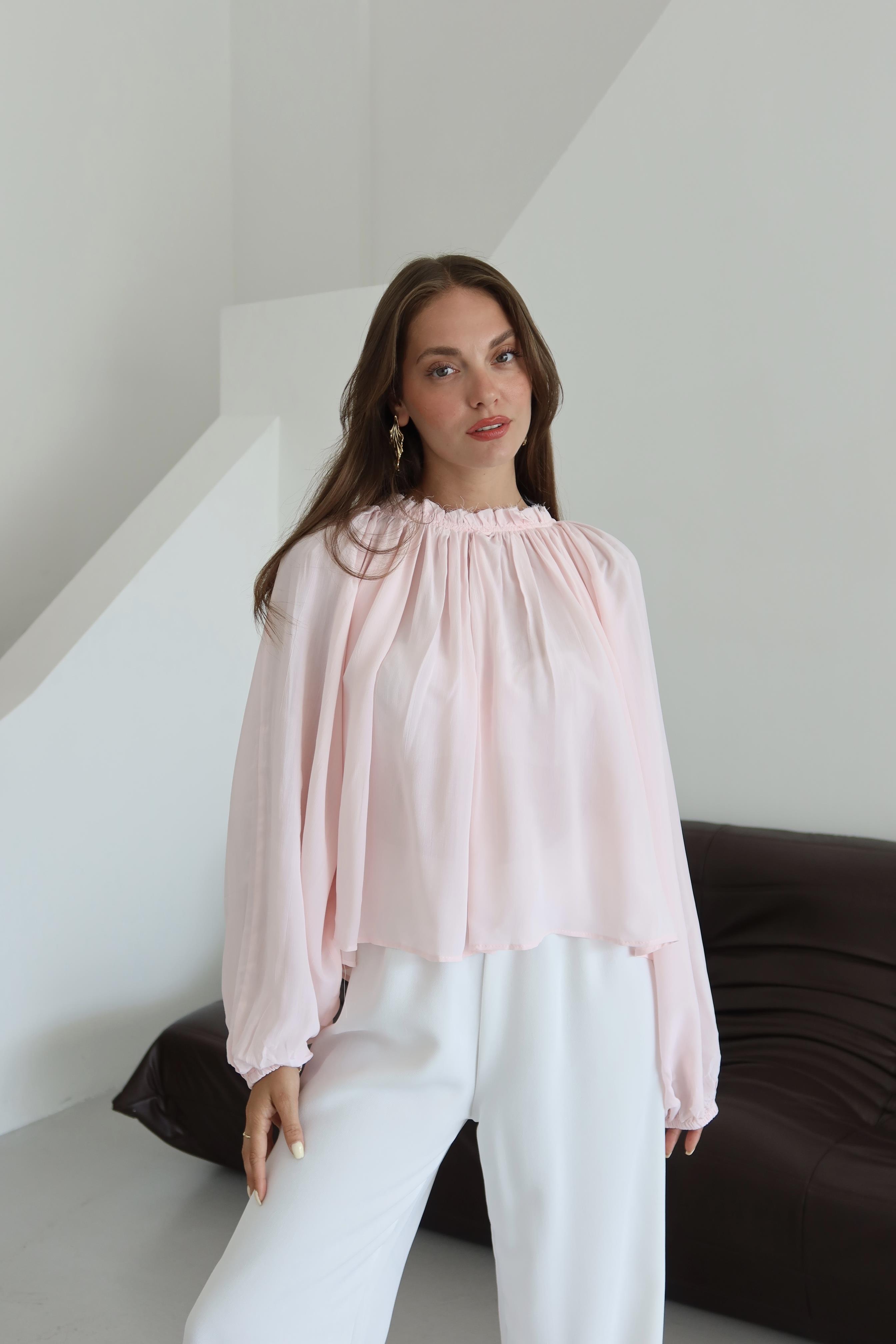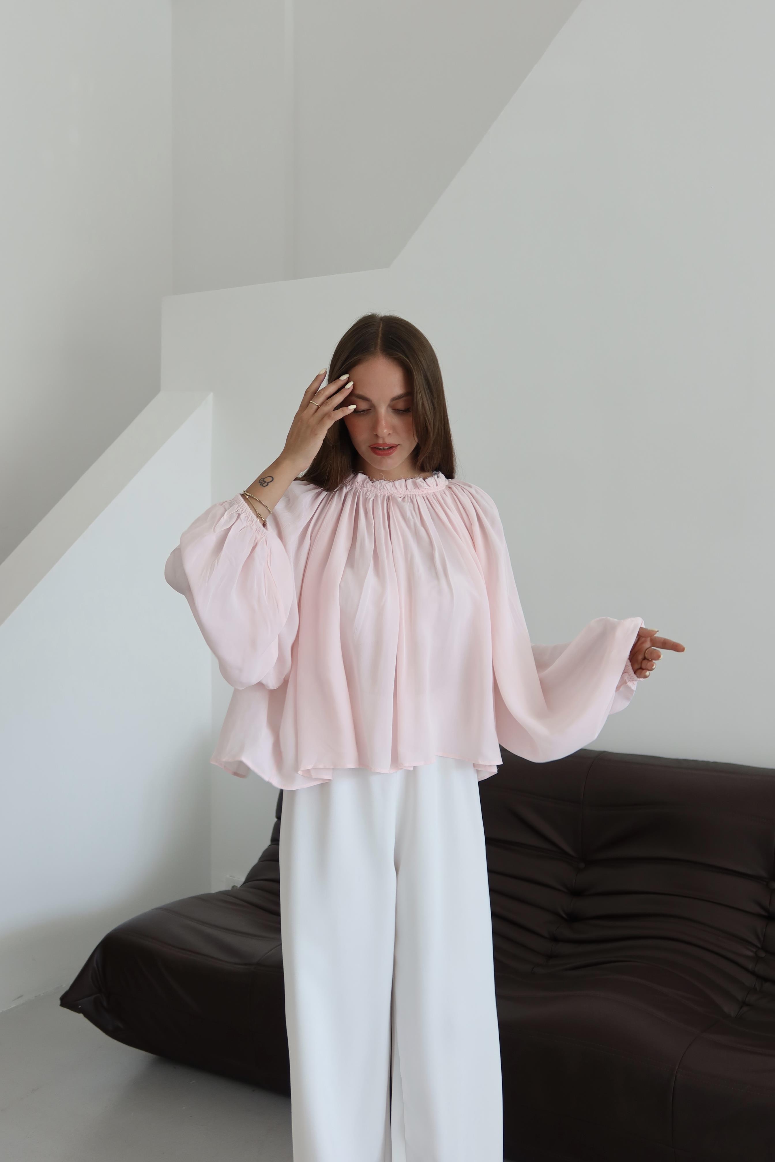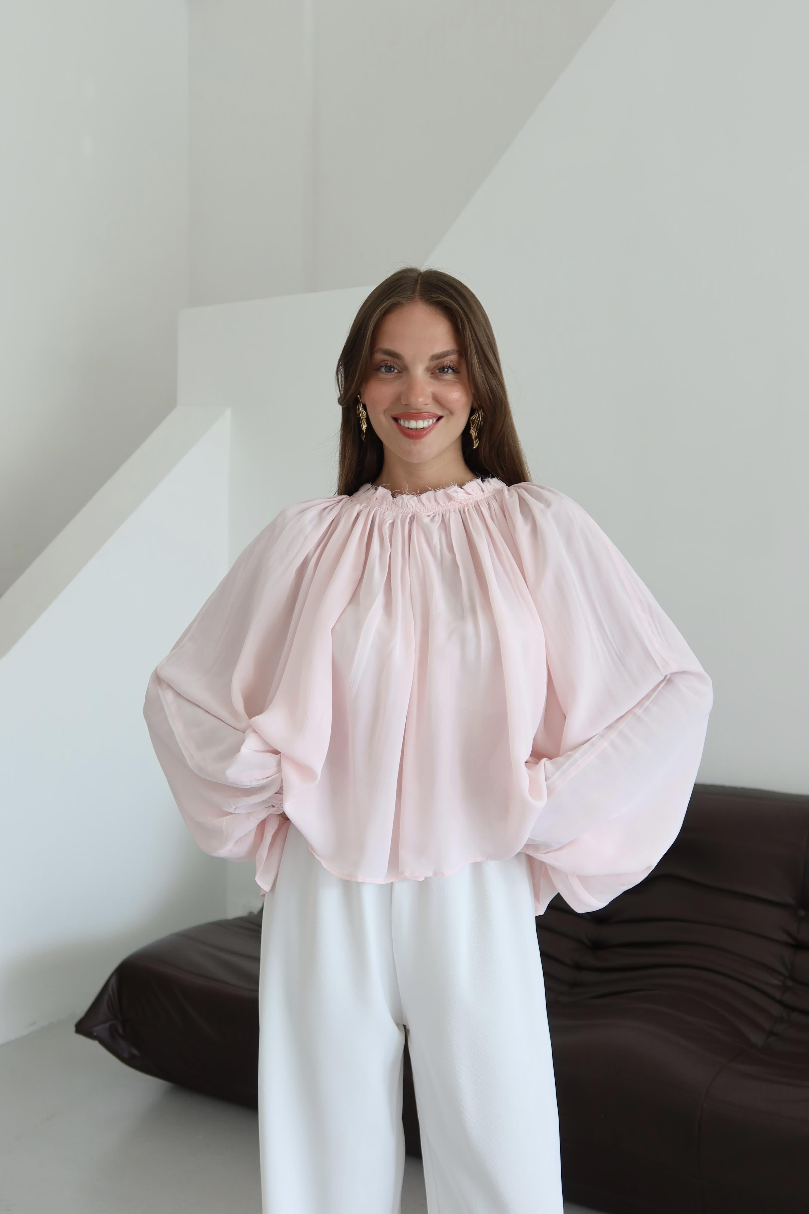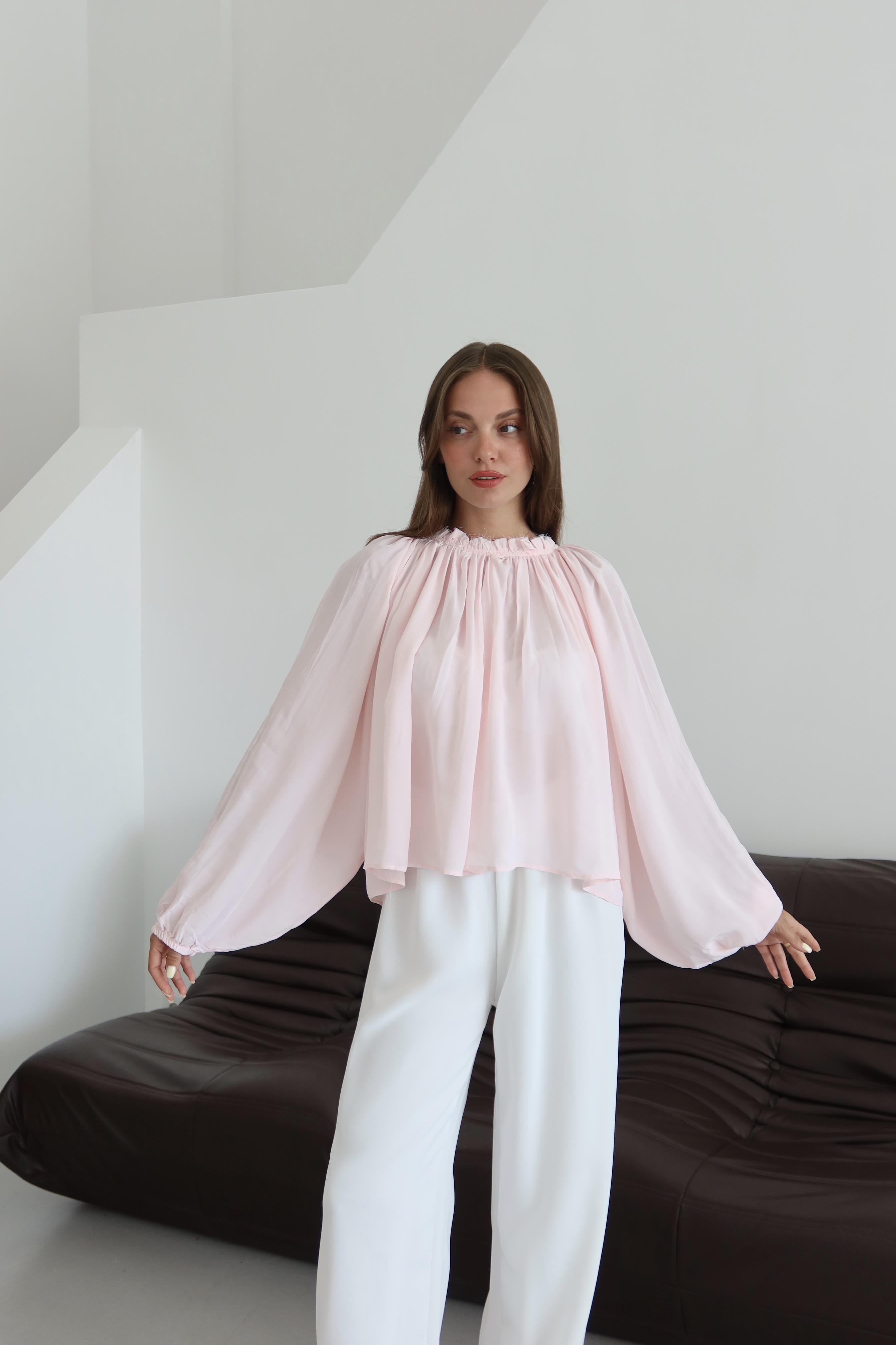Pembe Yakası Büzgülü Yarasa Kol Bluz