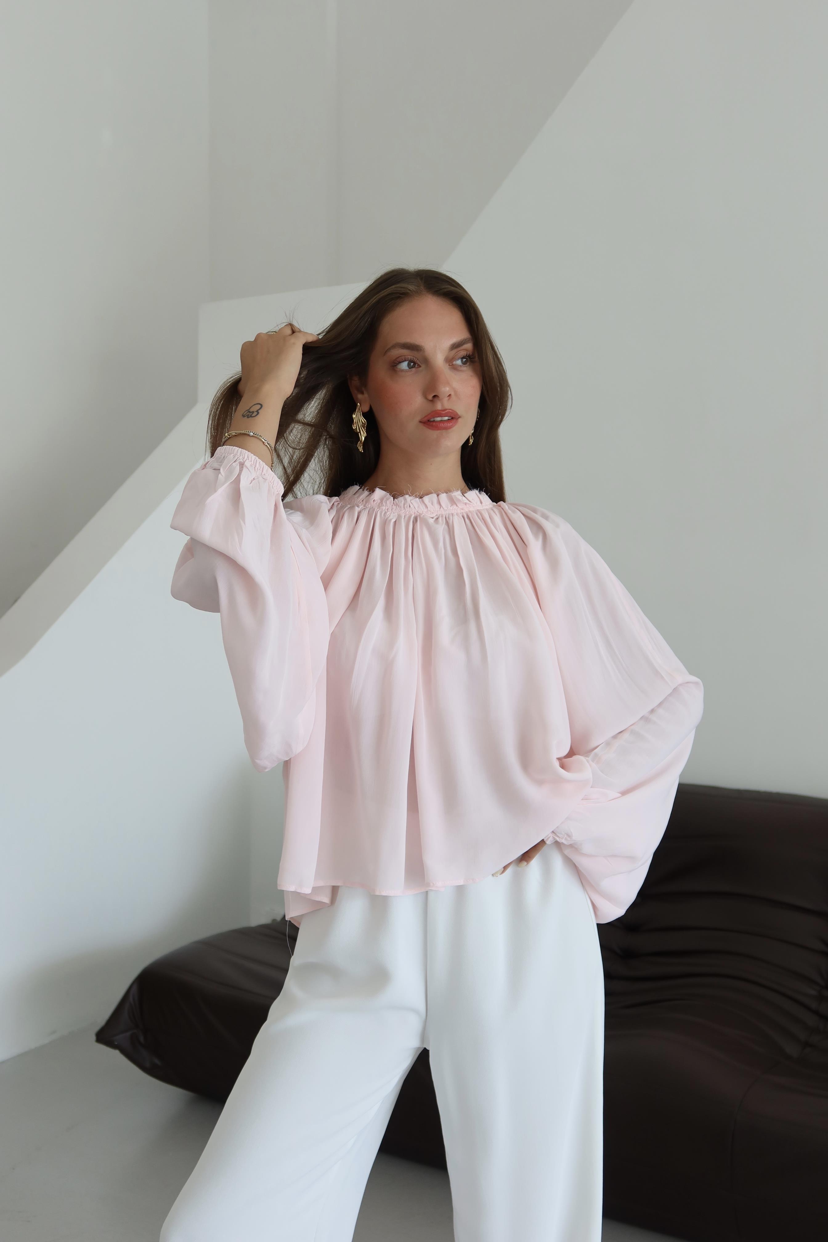 - Pembe Yakası Büzgülü Yarasa Kol Bluz