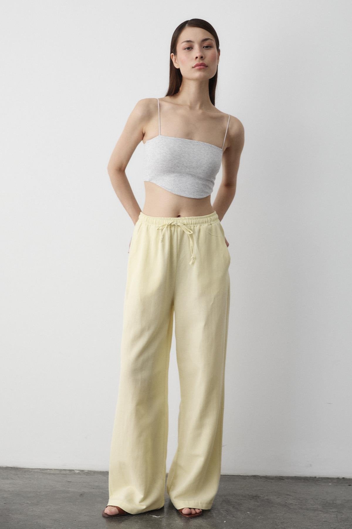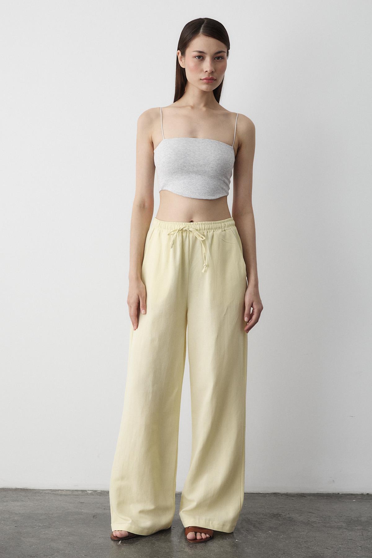- Sarı Beli Lastikli Pamuklu Keten Pantolon