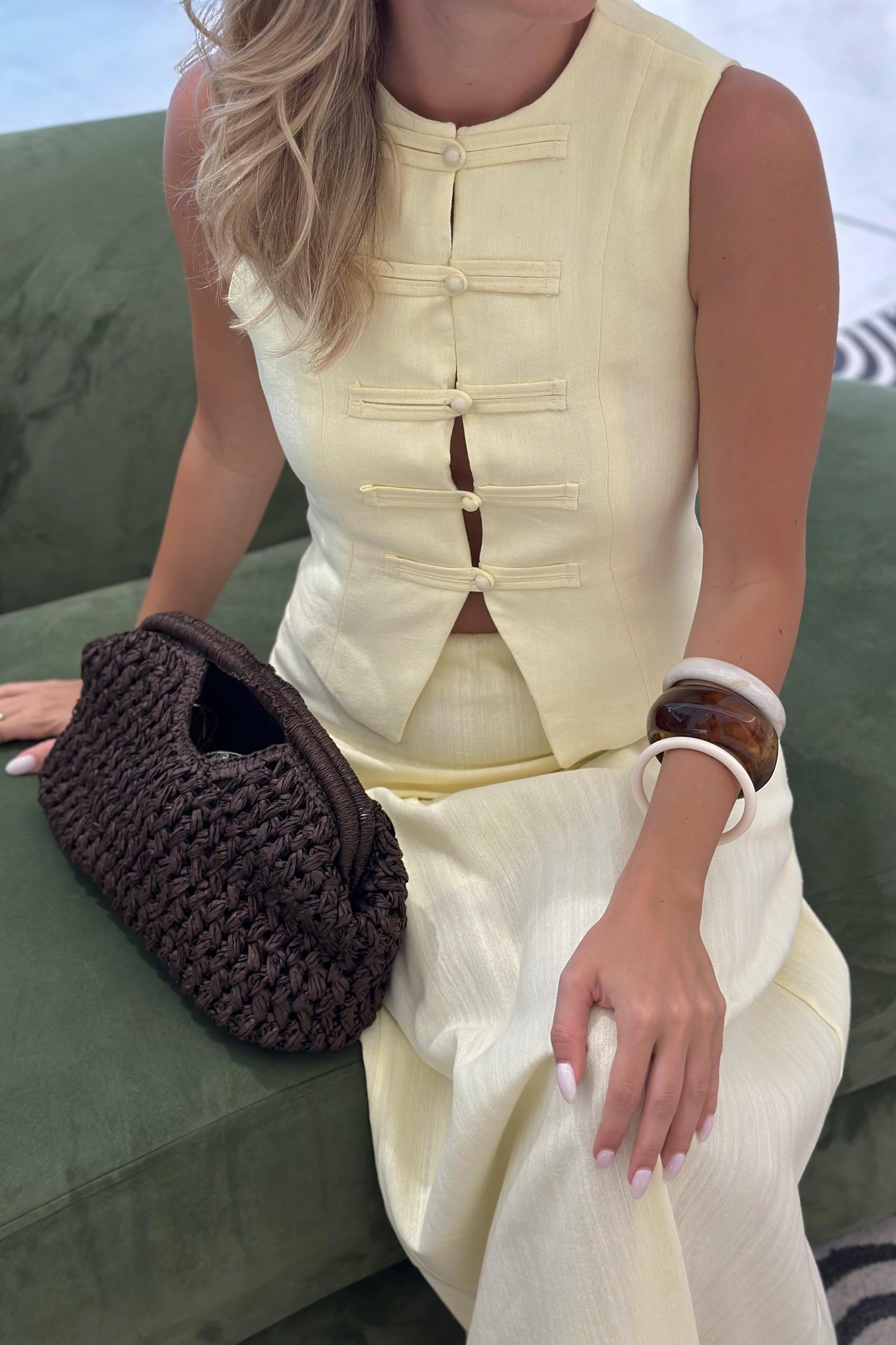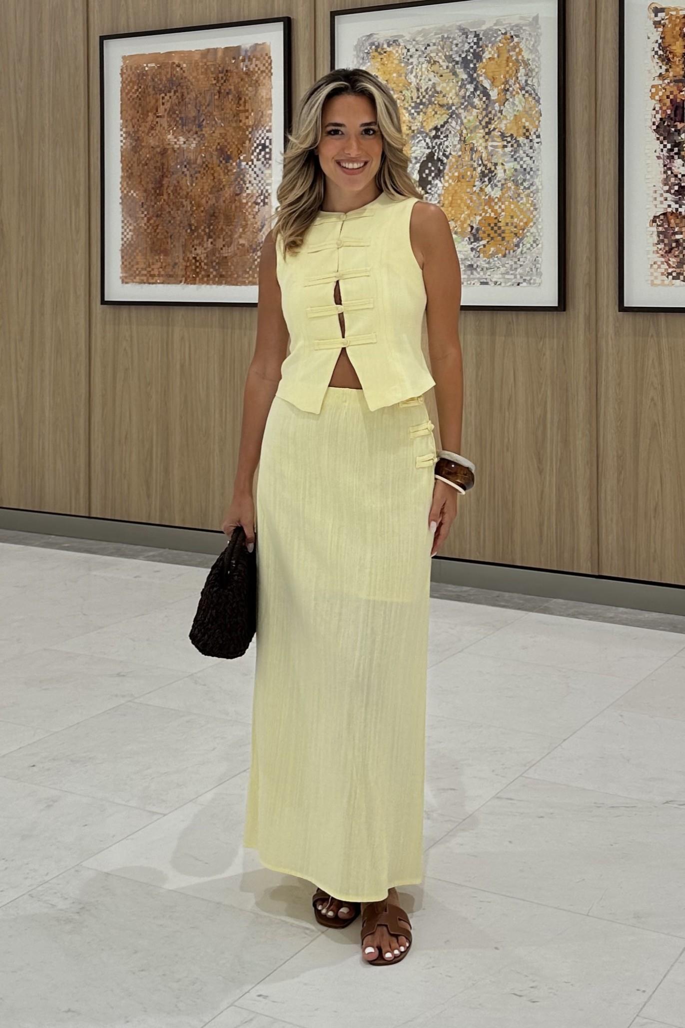 - Sarı Brit Detaylı Yelek Etek Takım