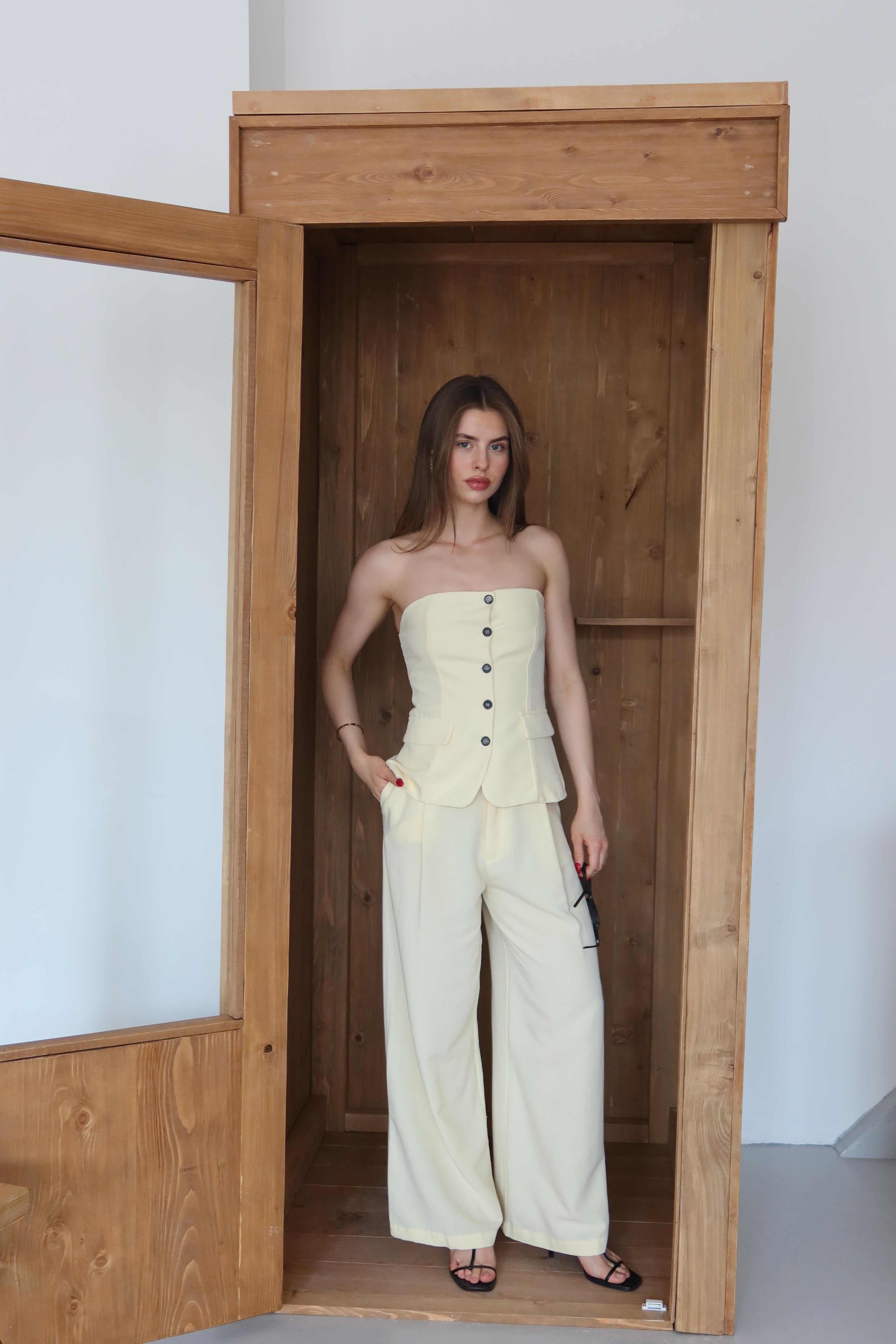 - Sarı Straplez Bol Paça Pantolon Takım