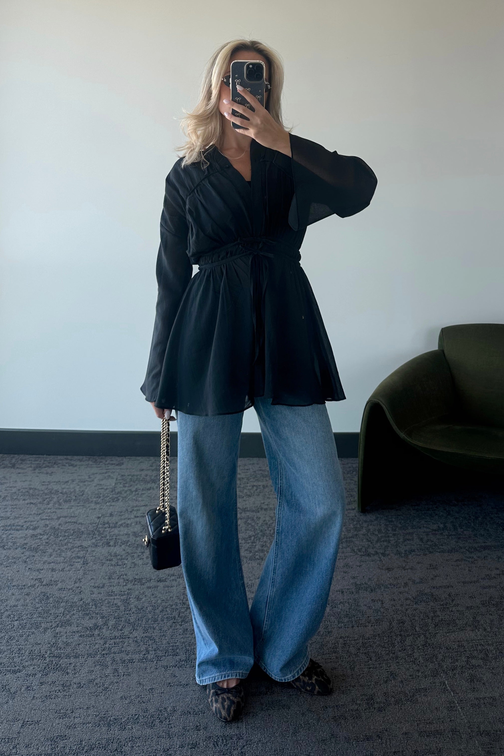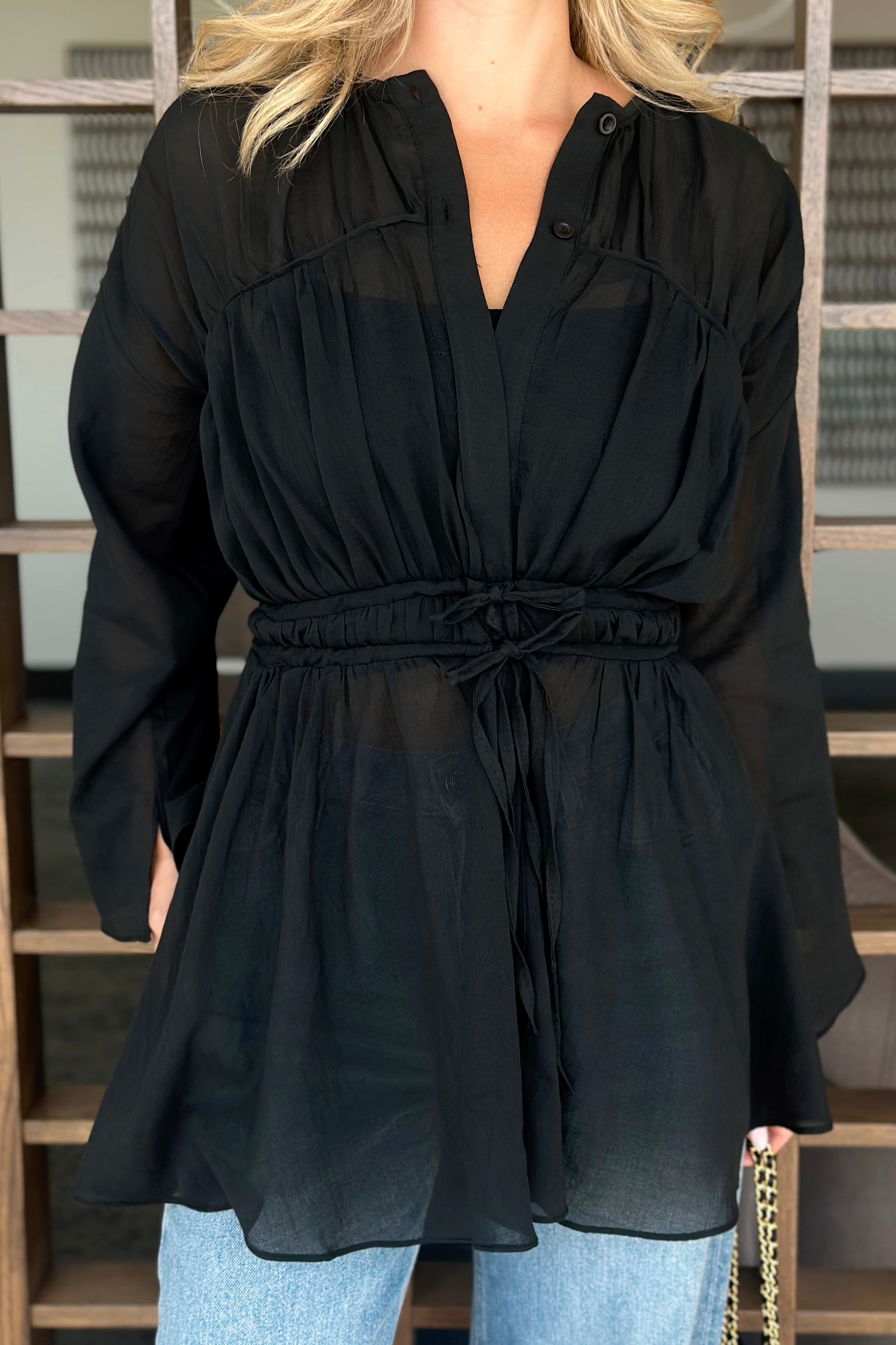 - Siyah Bel Detaylı Vual Keten Gömlek