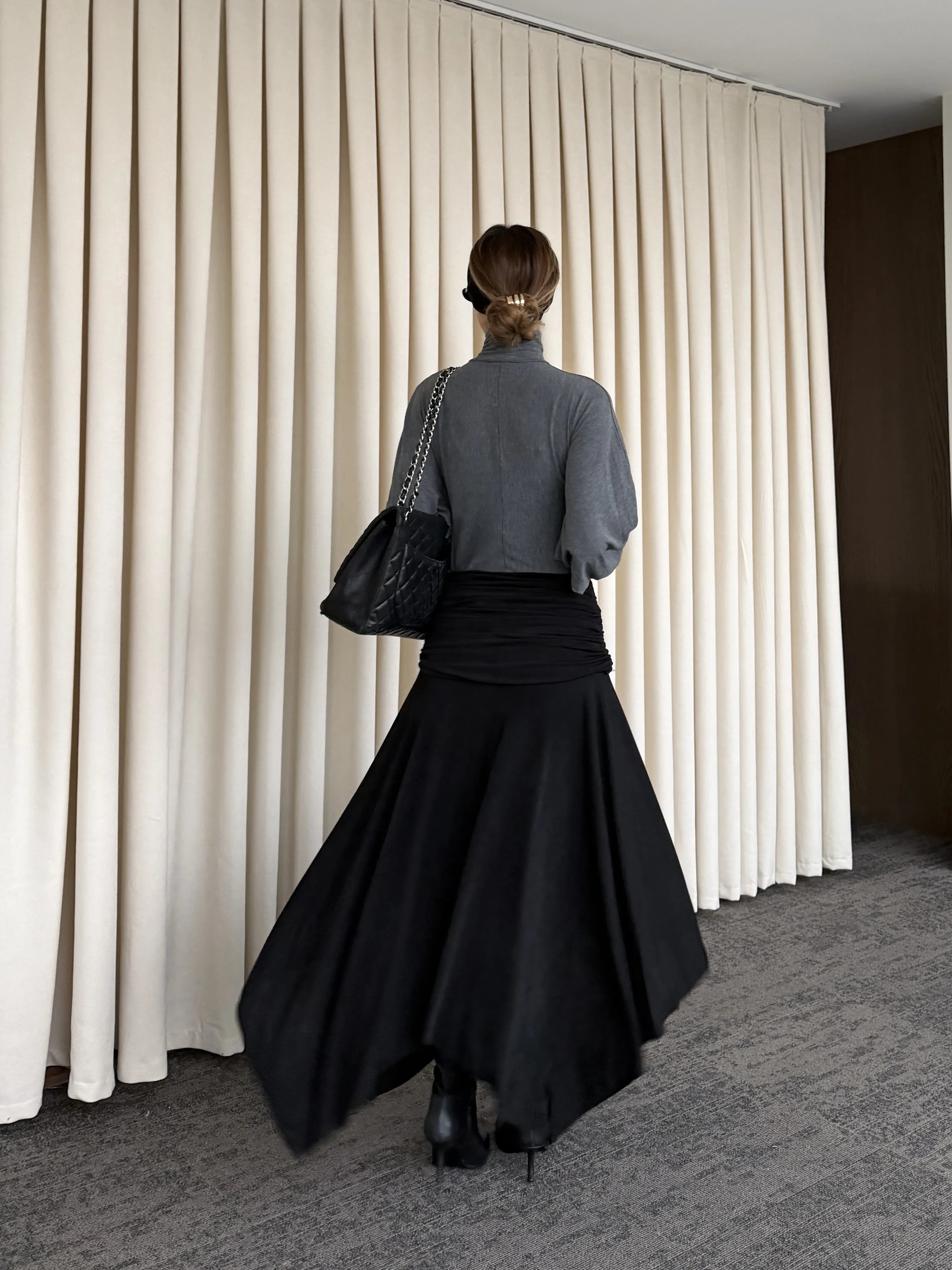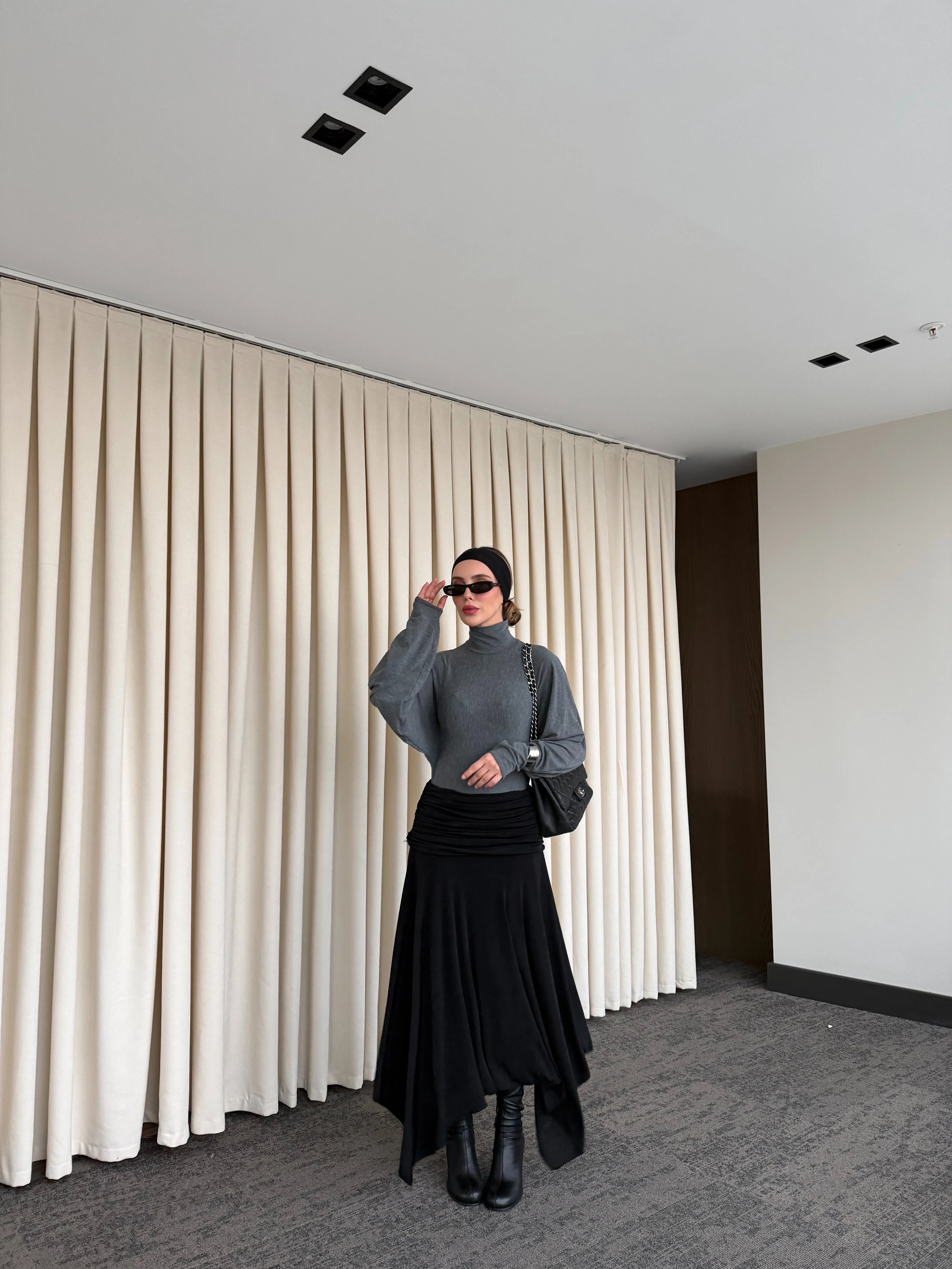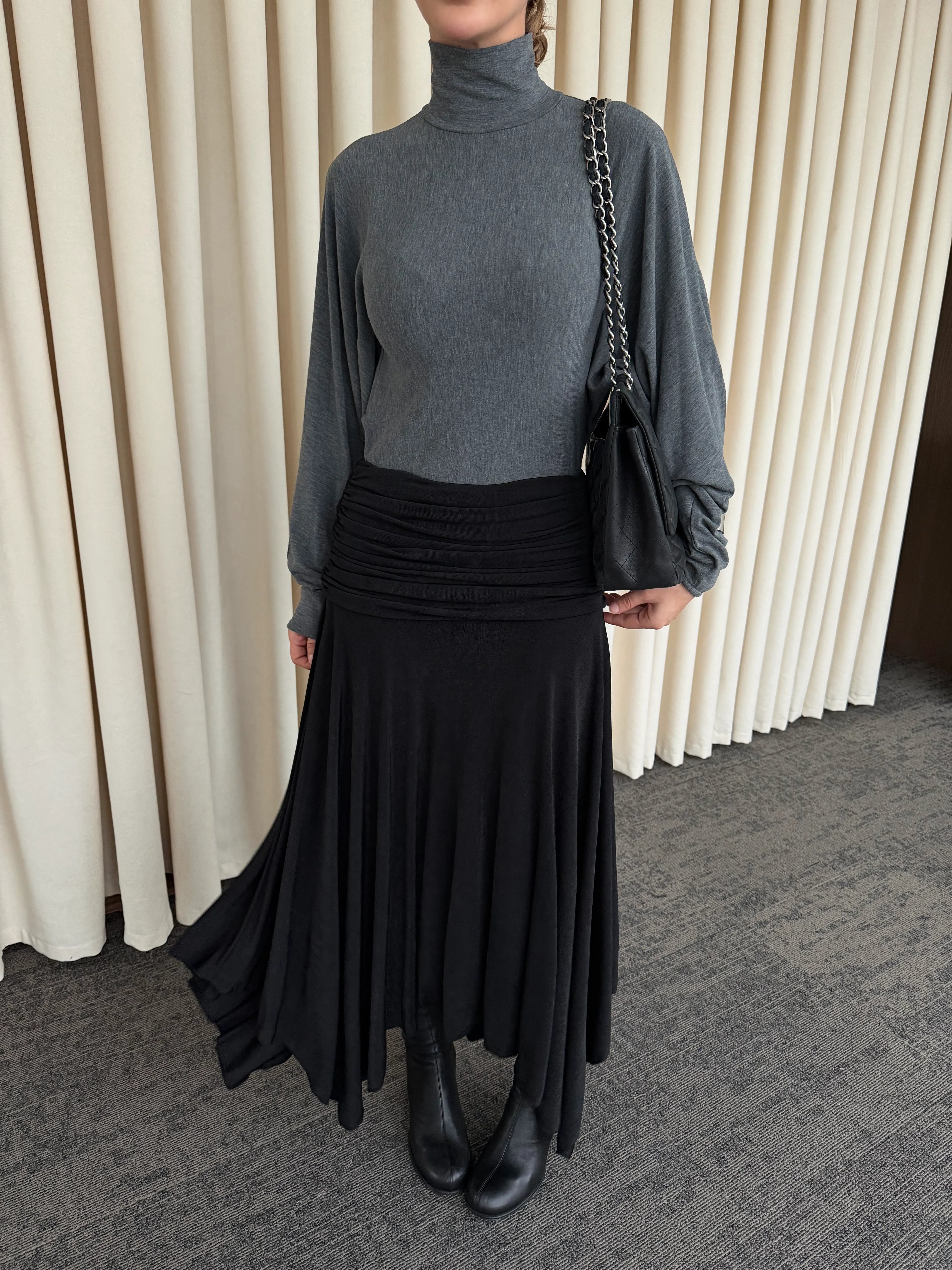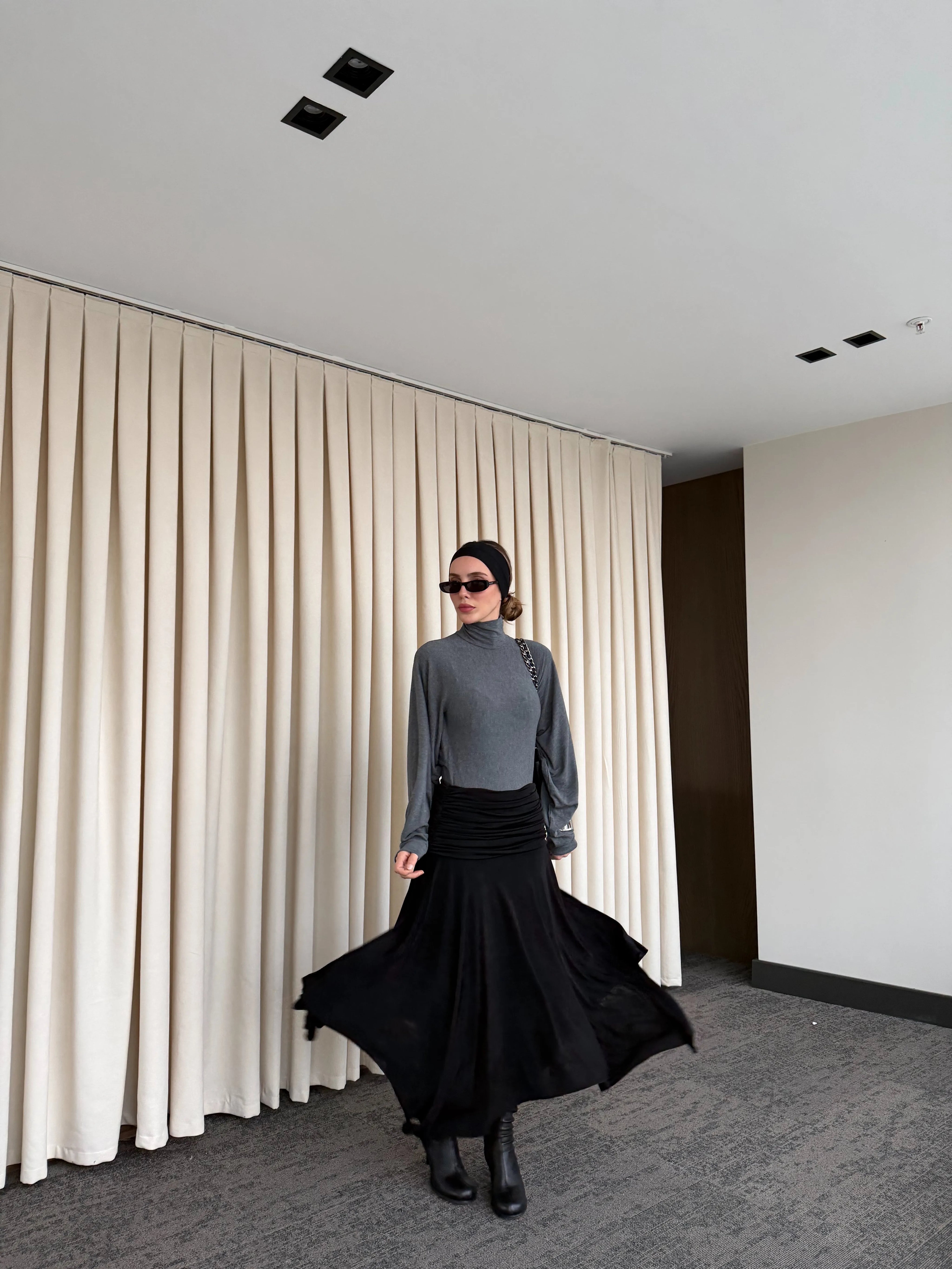 - Siyah Büzgü Kemerli Etek - 3366