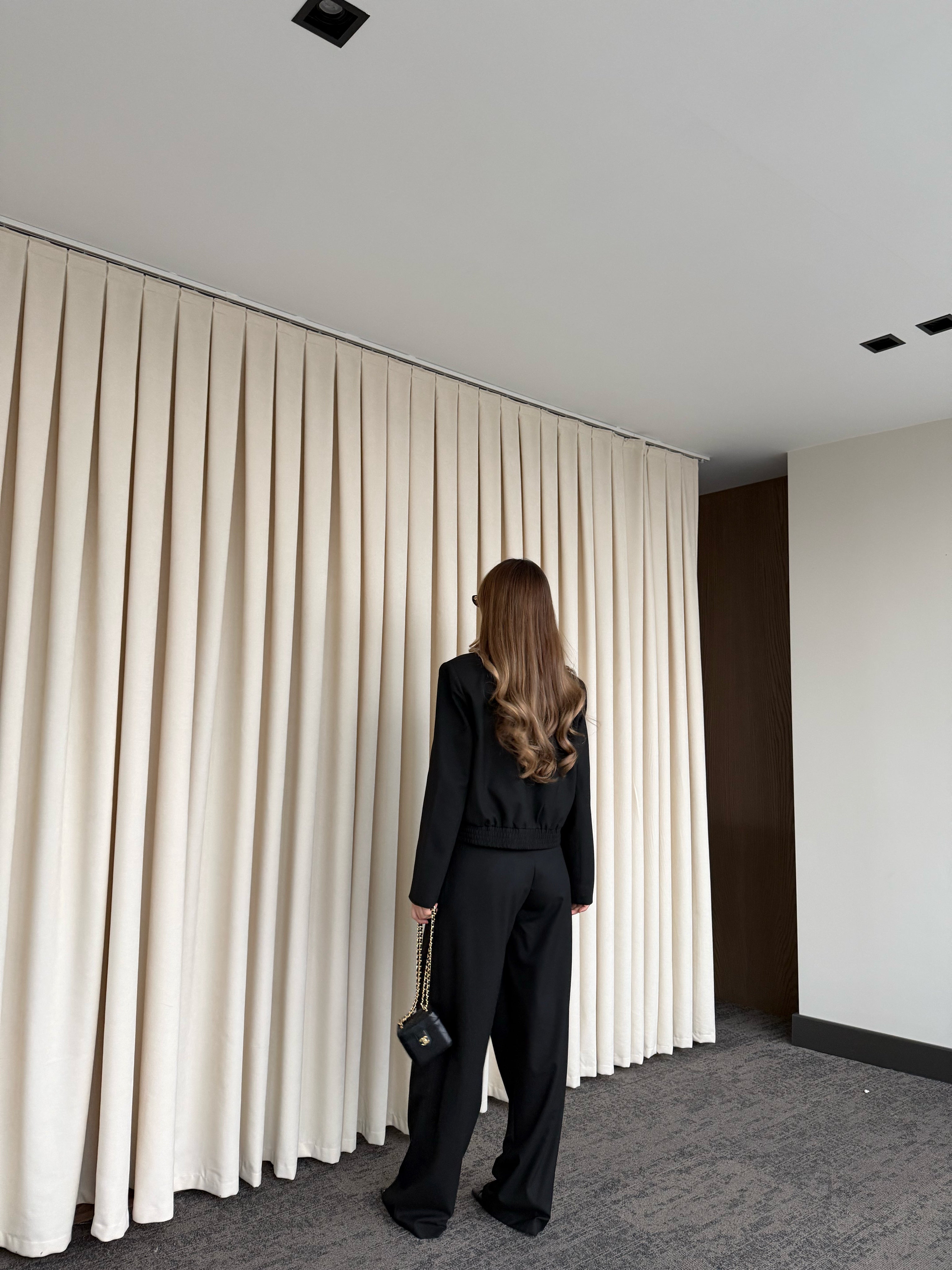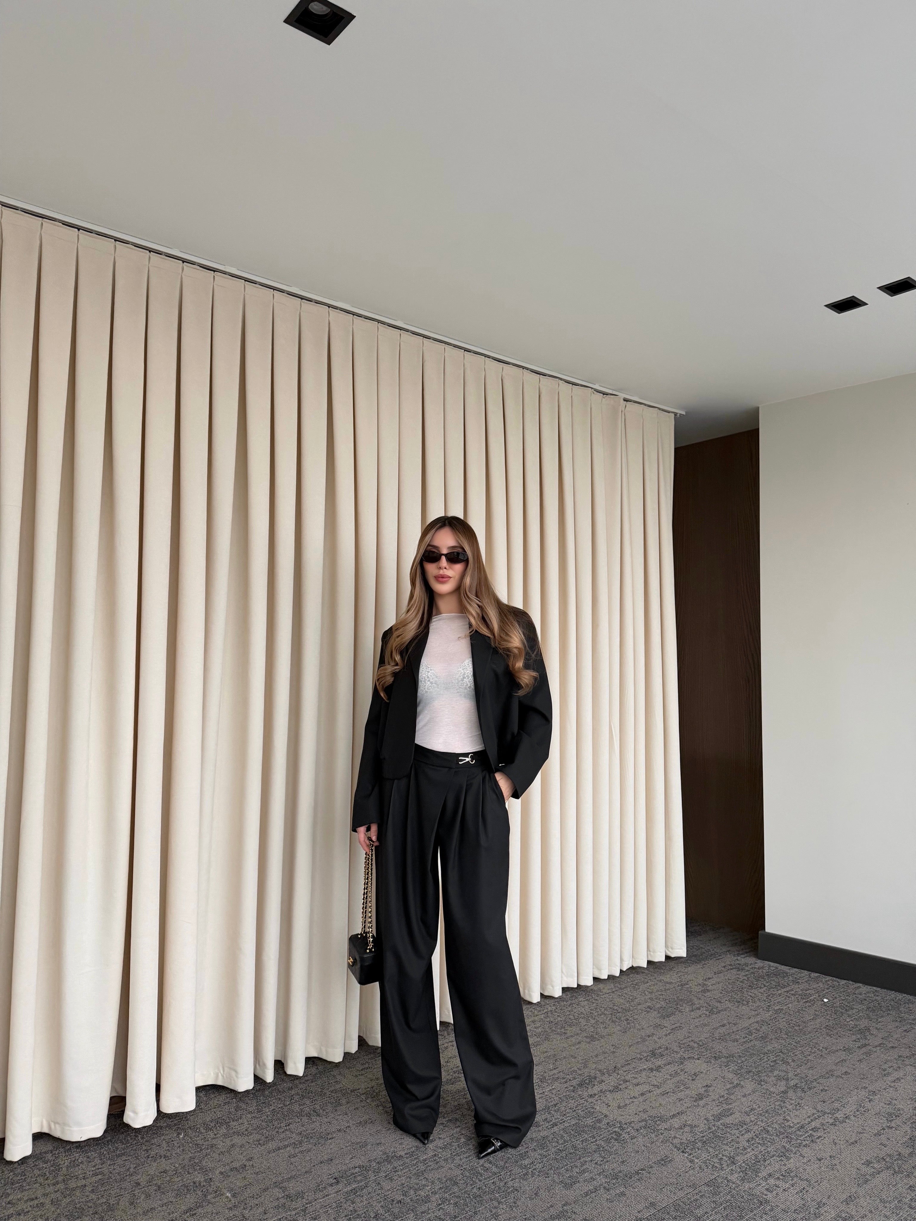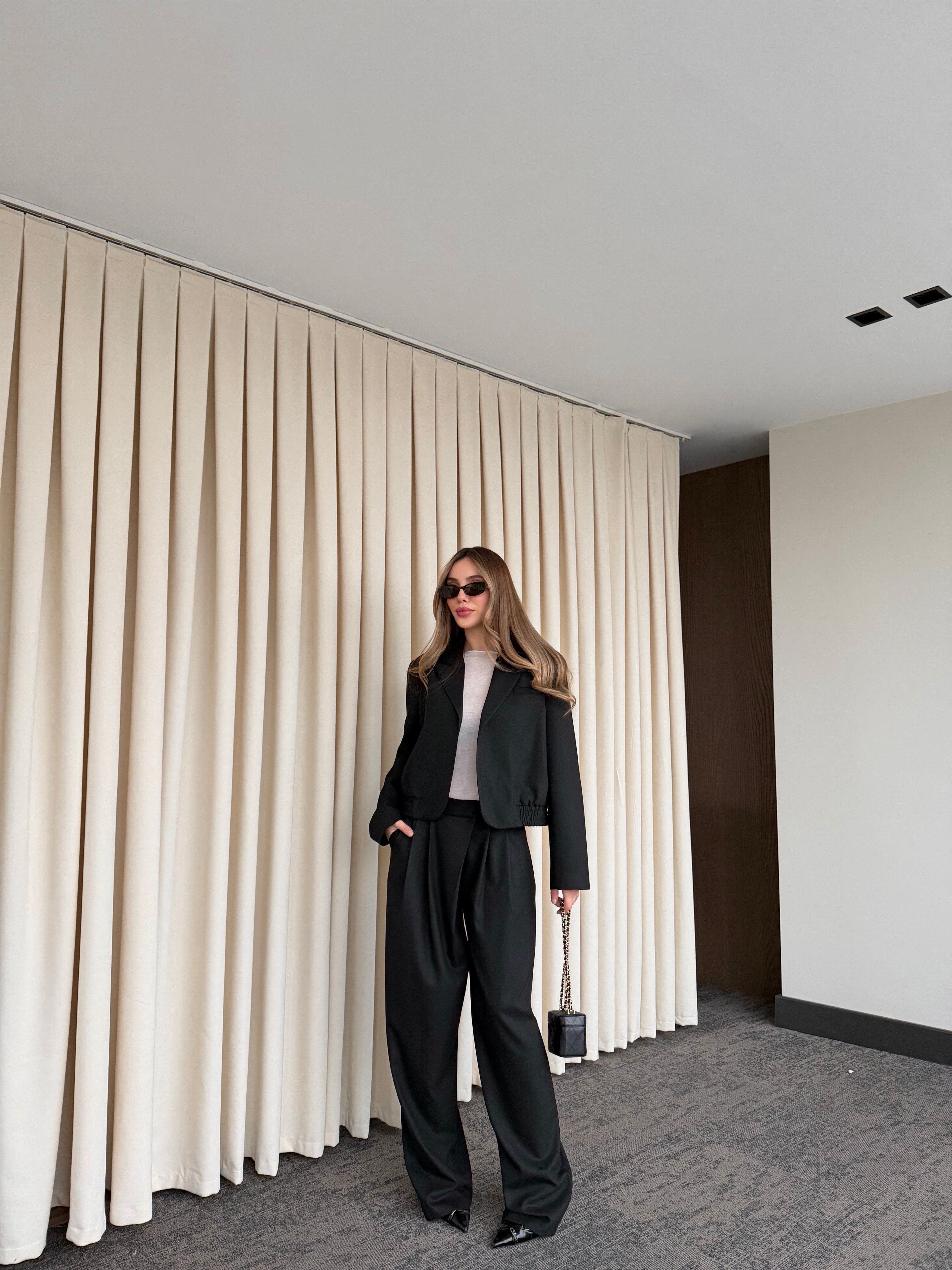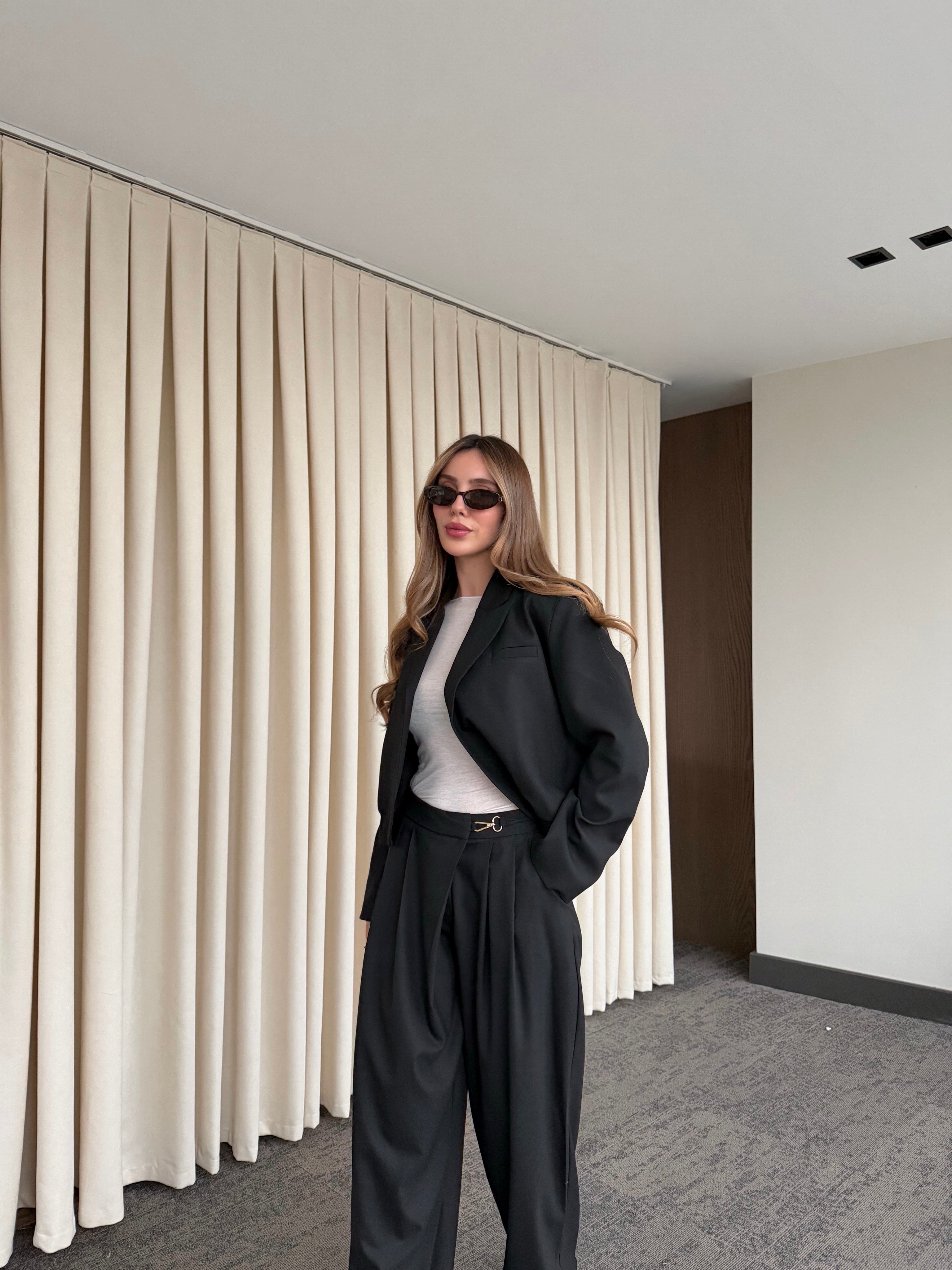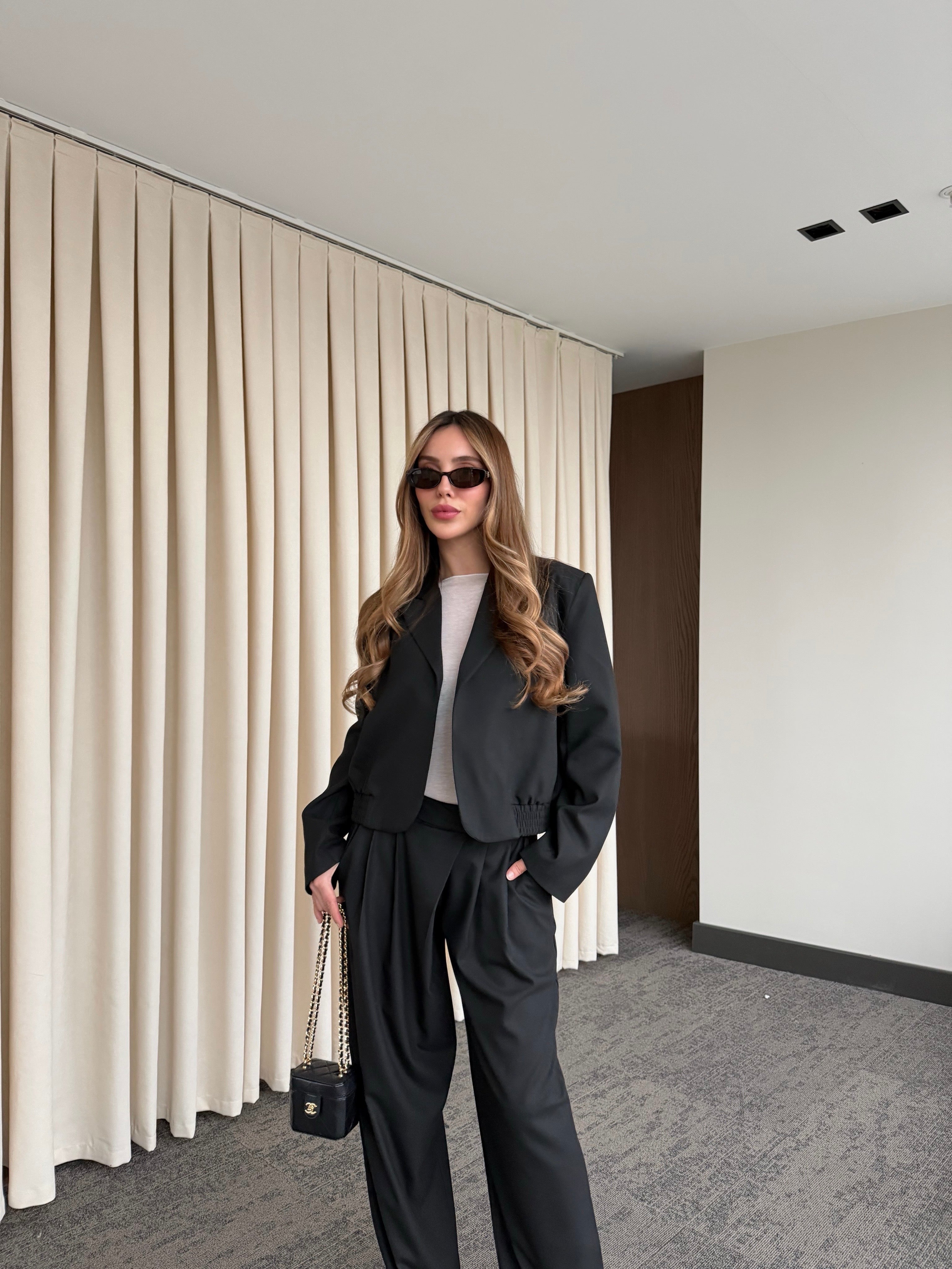 - Siyah Crop Ceket Pantolon Takım - 9689