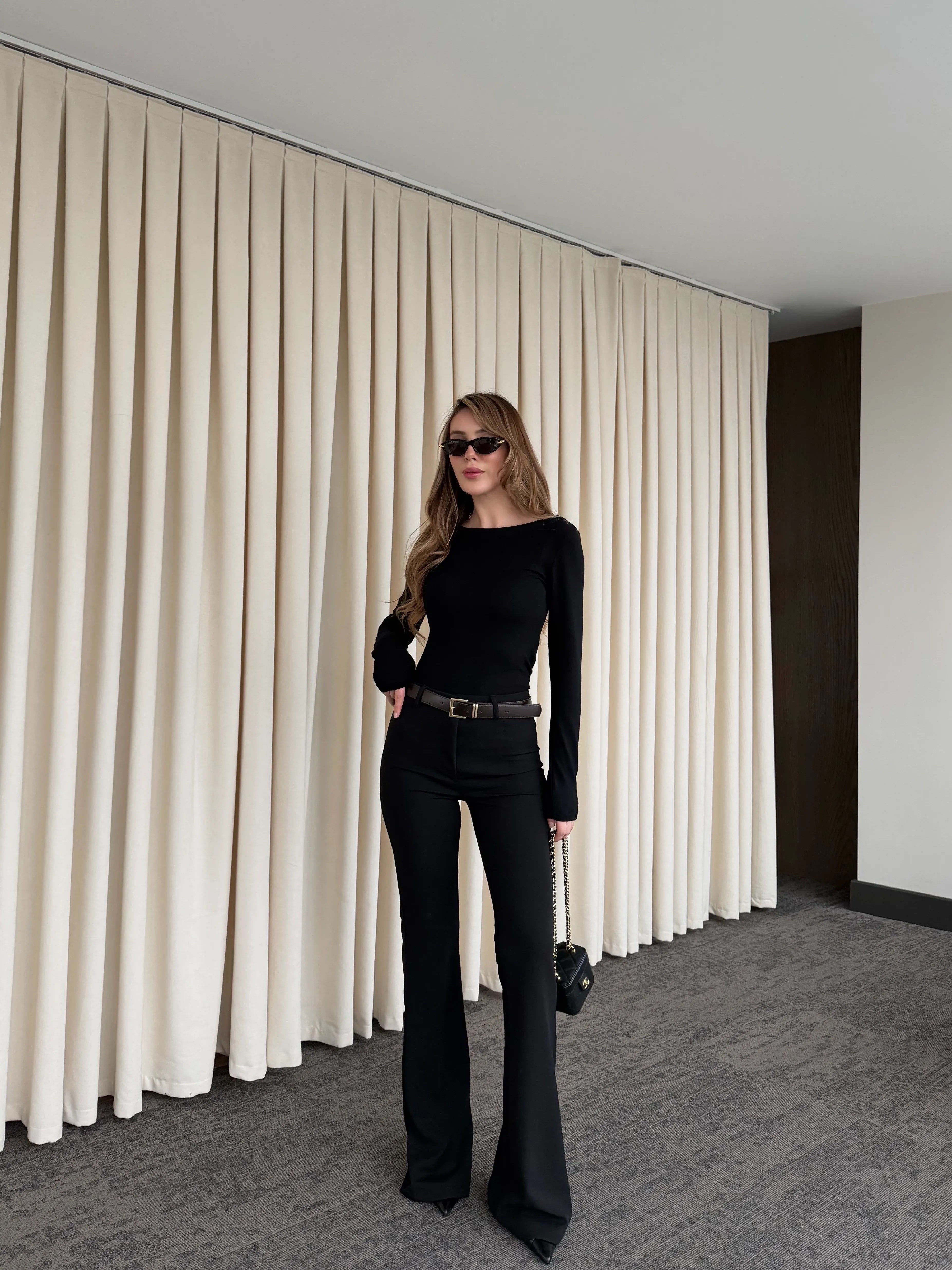 Siyah Flore Kemerli Pantolon - 1741