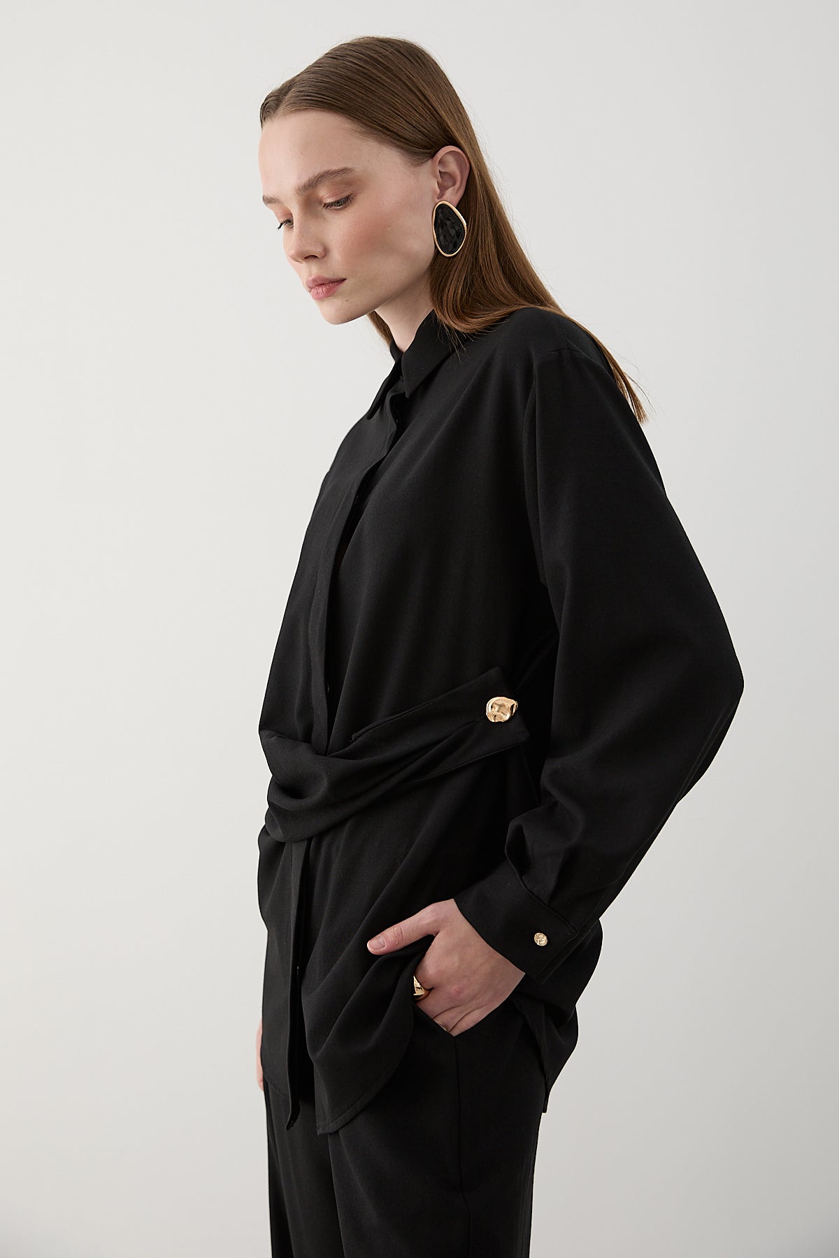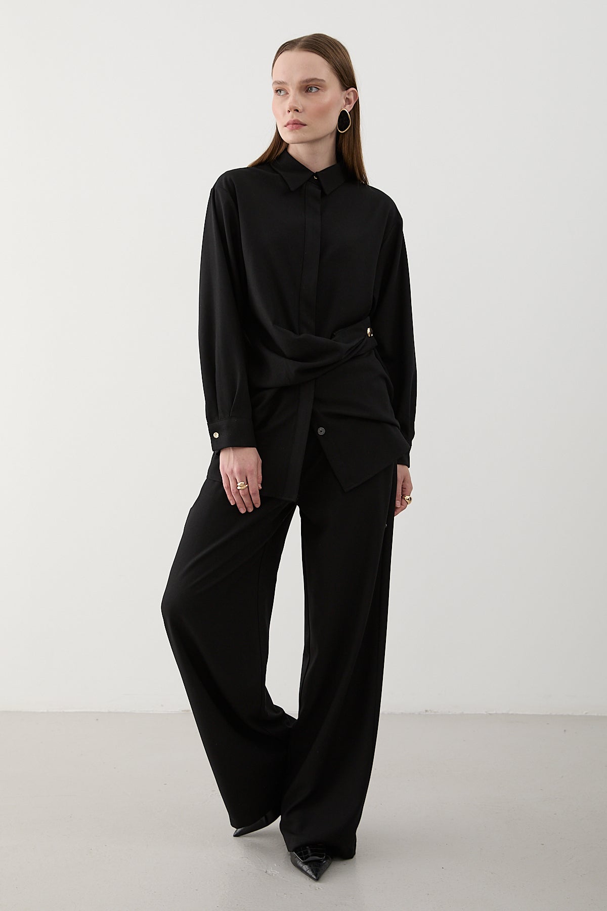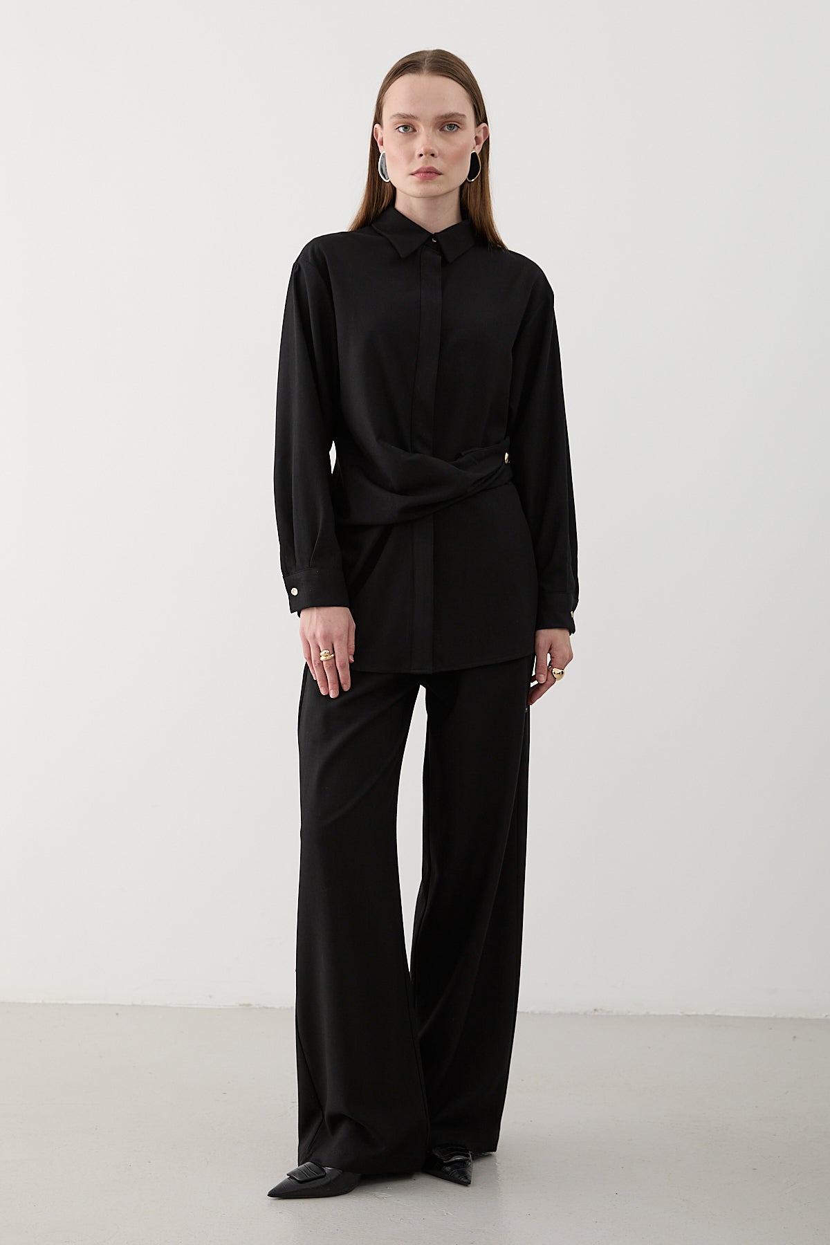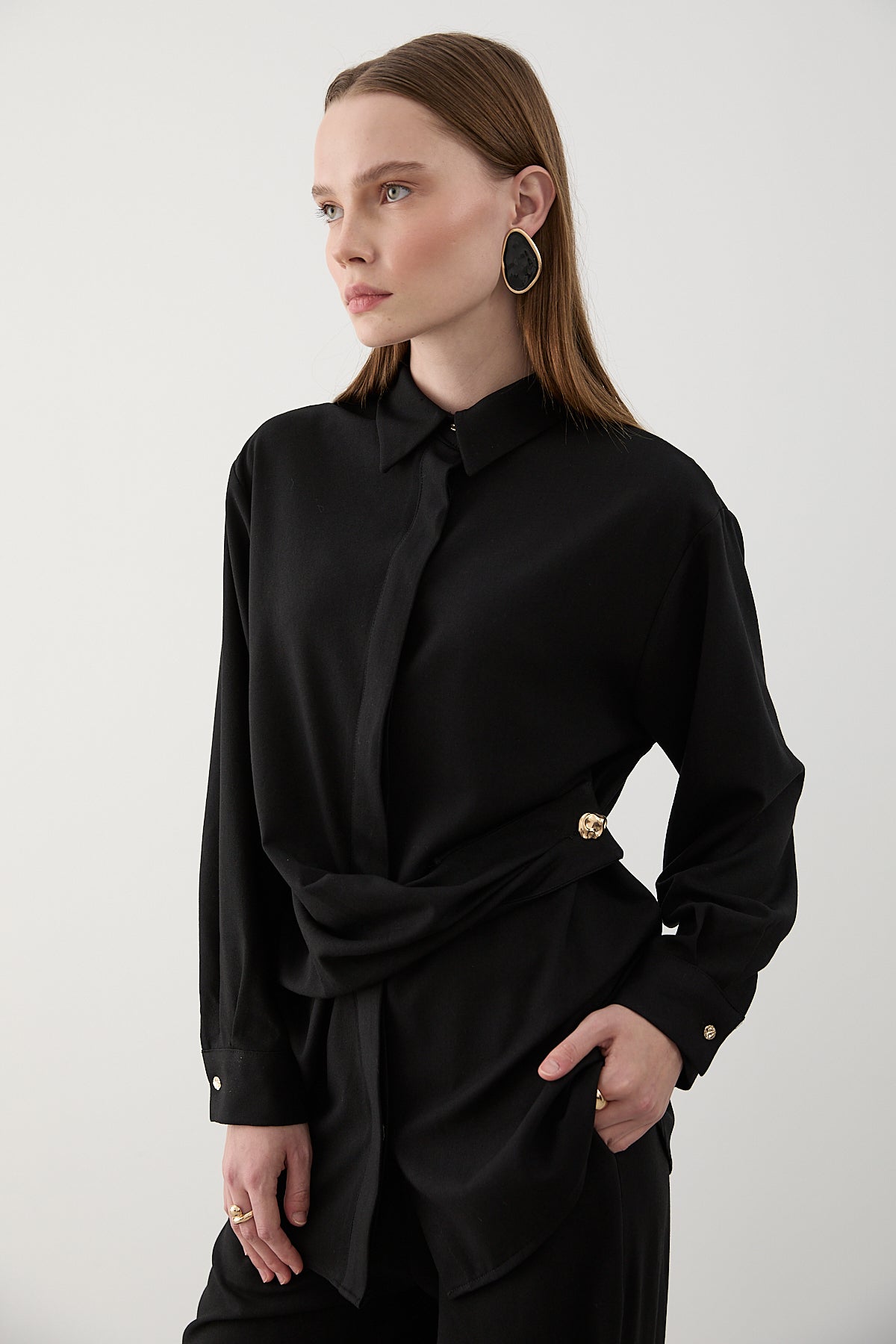 - Siyah Gold Aksesuar Düğmeli Gömlek Pantolon Takım - 8856