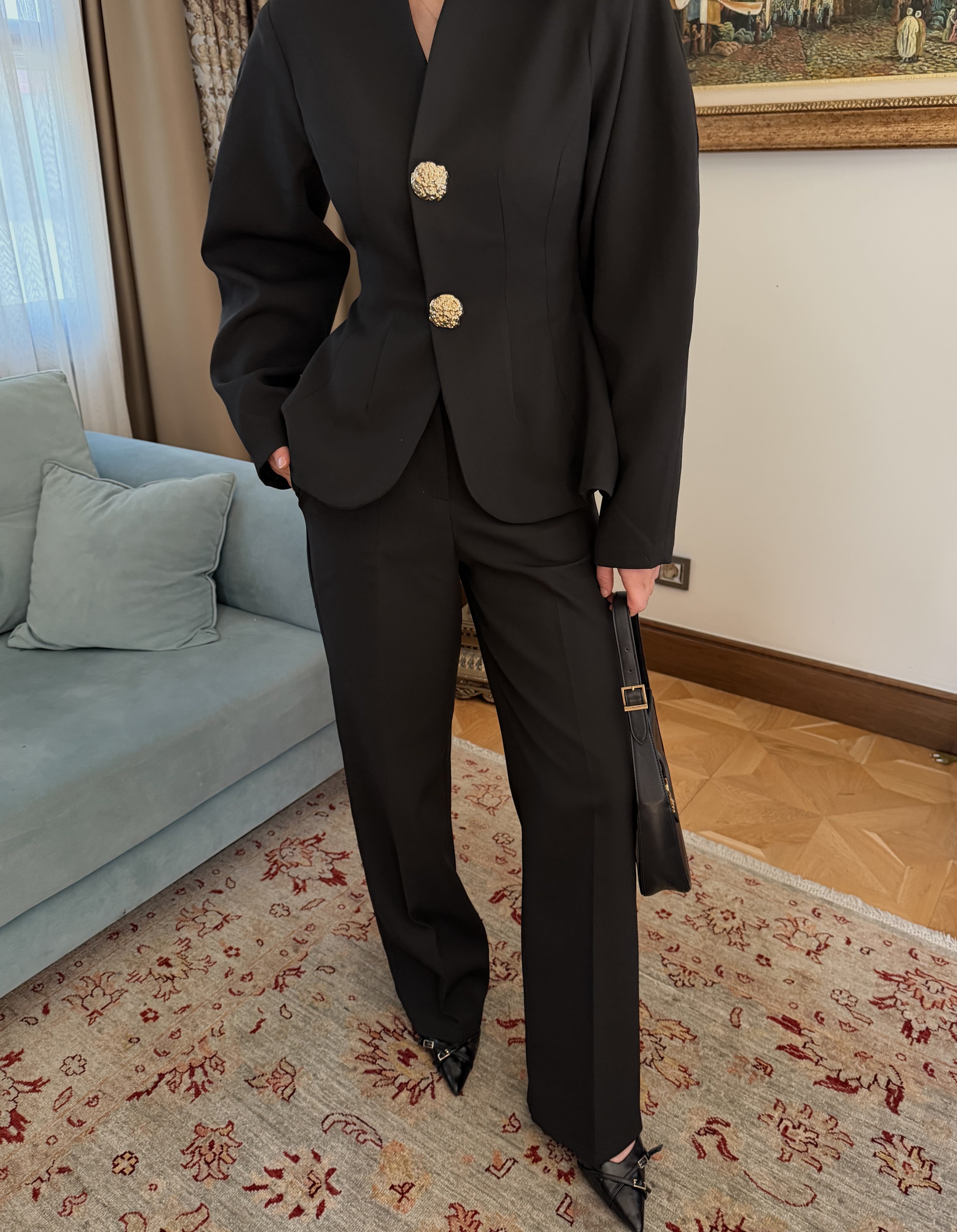 - Siyah Gold Düğme Detaylı Belden Oturtma Takım - 2025186