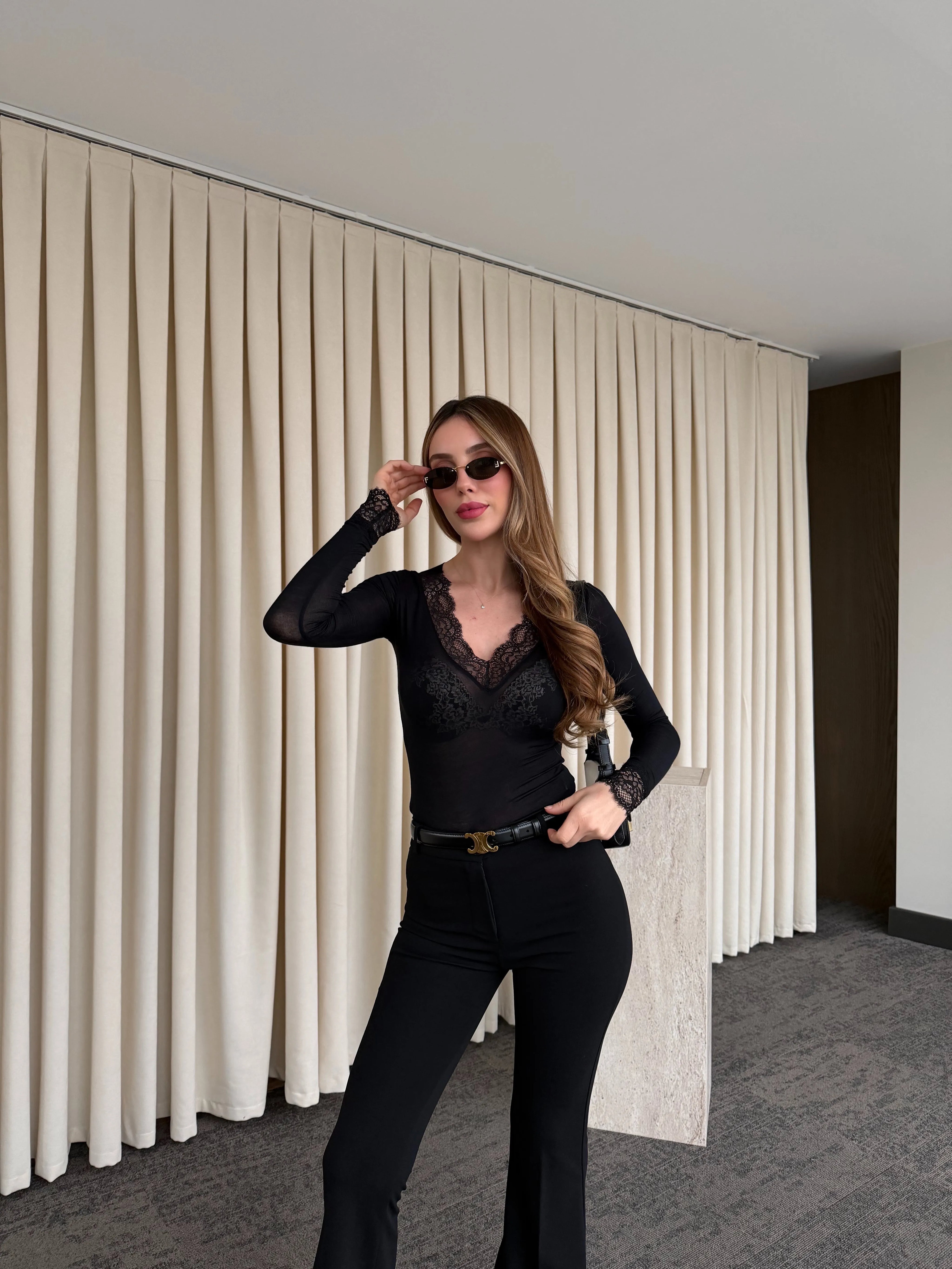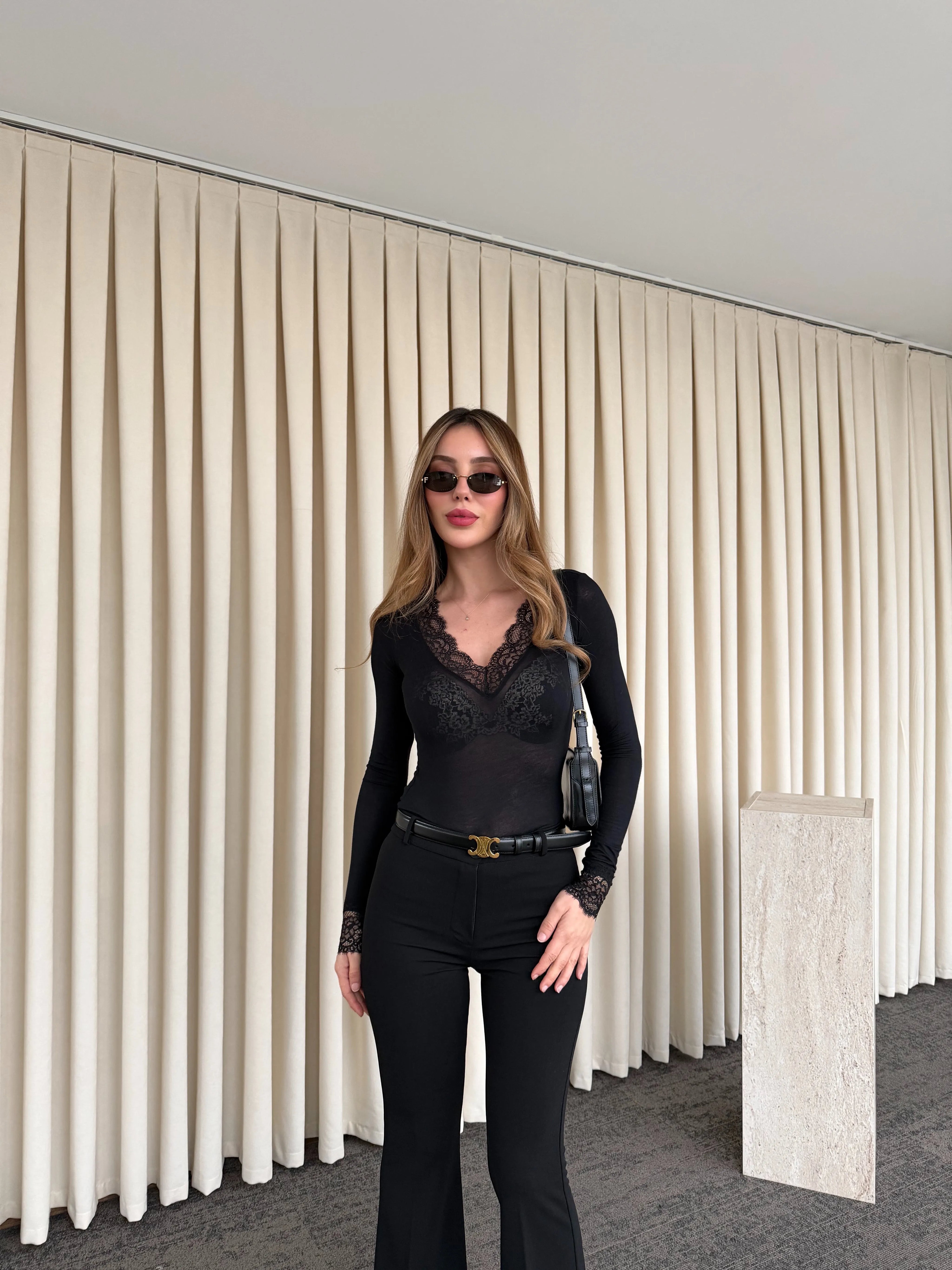 - Siyah Kaşmir Dokulu Dantel Detaylı V Yaka Bluz - 1727