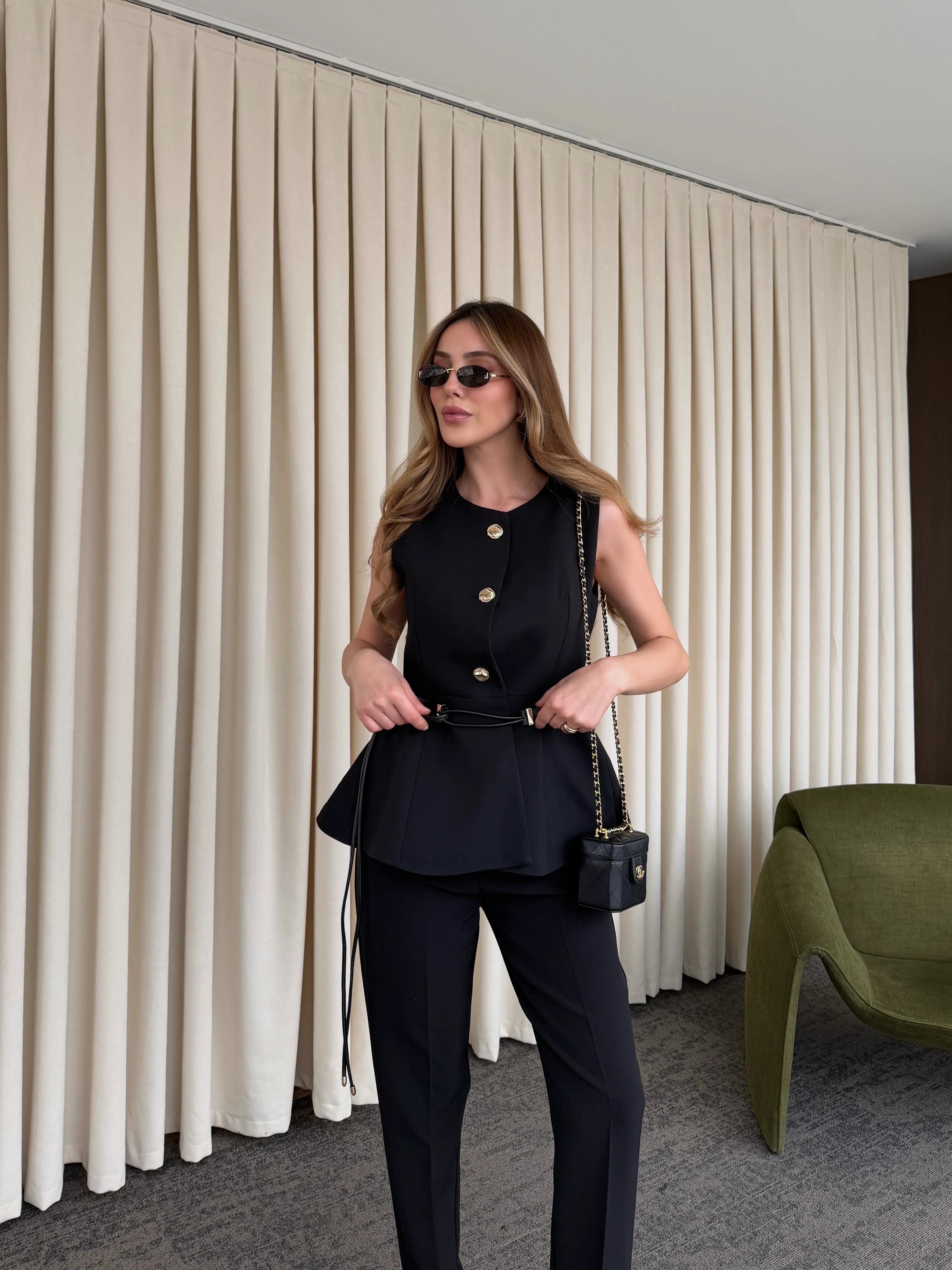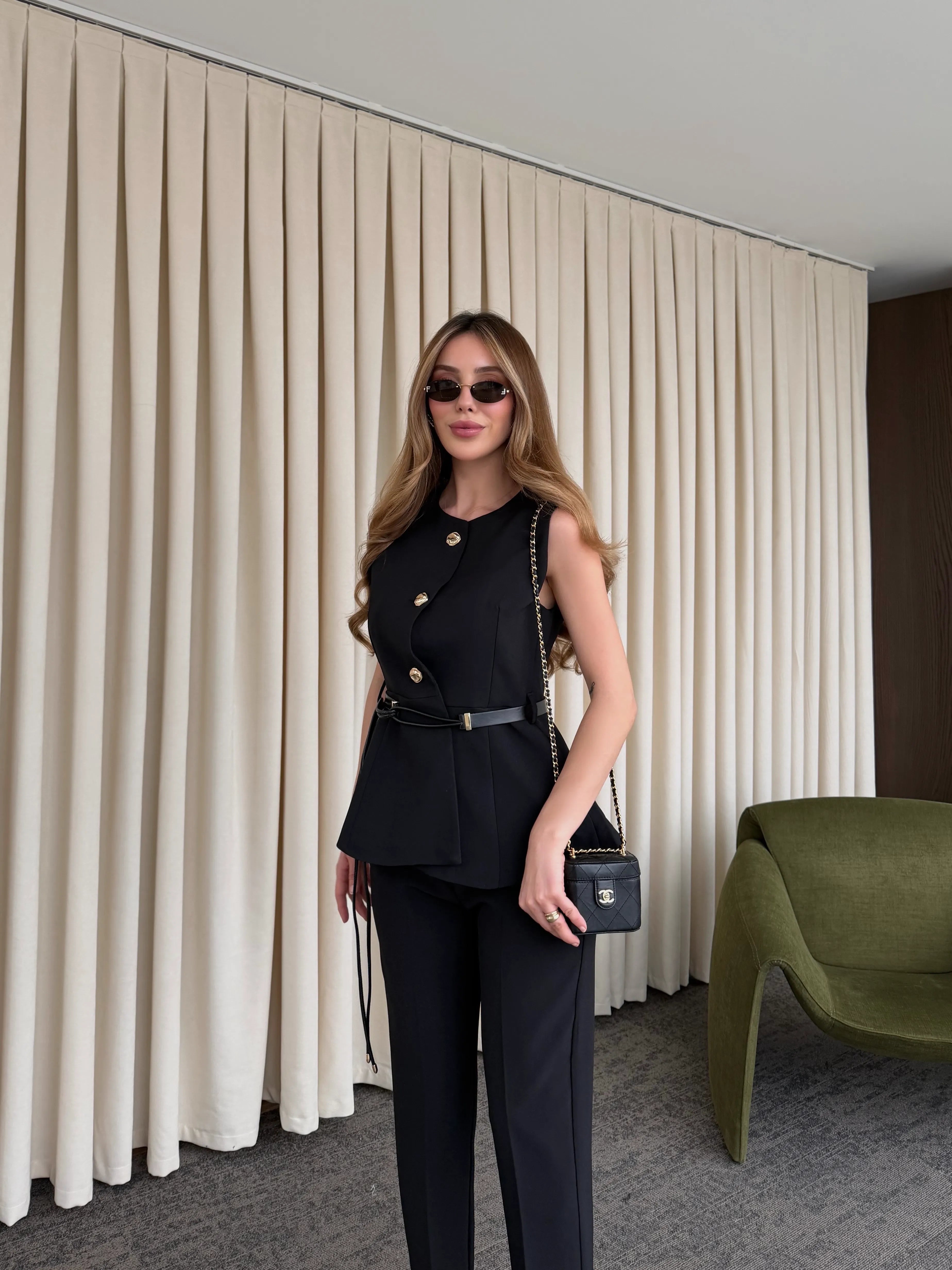 - Siyah Kemerli Düğmeli Yelek - 9682