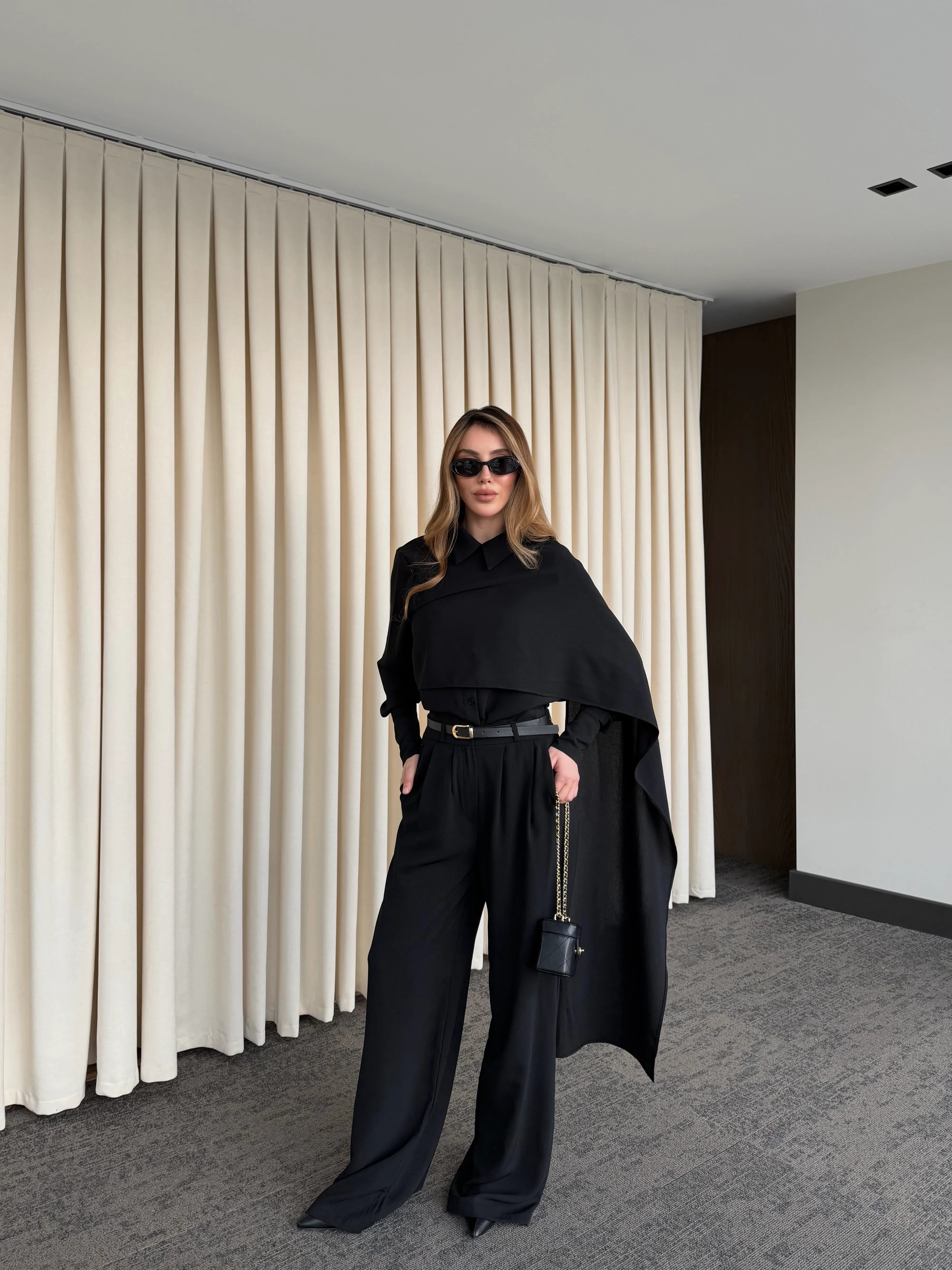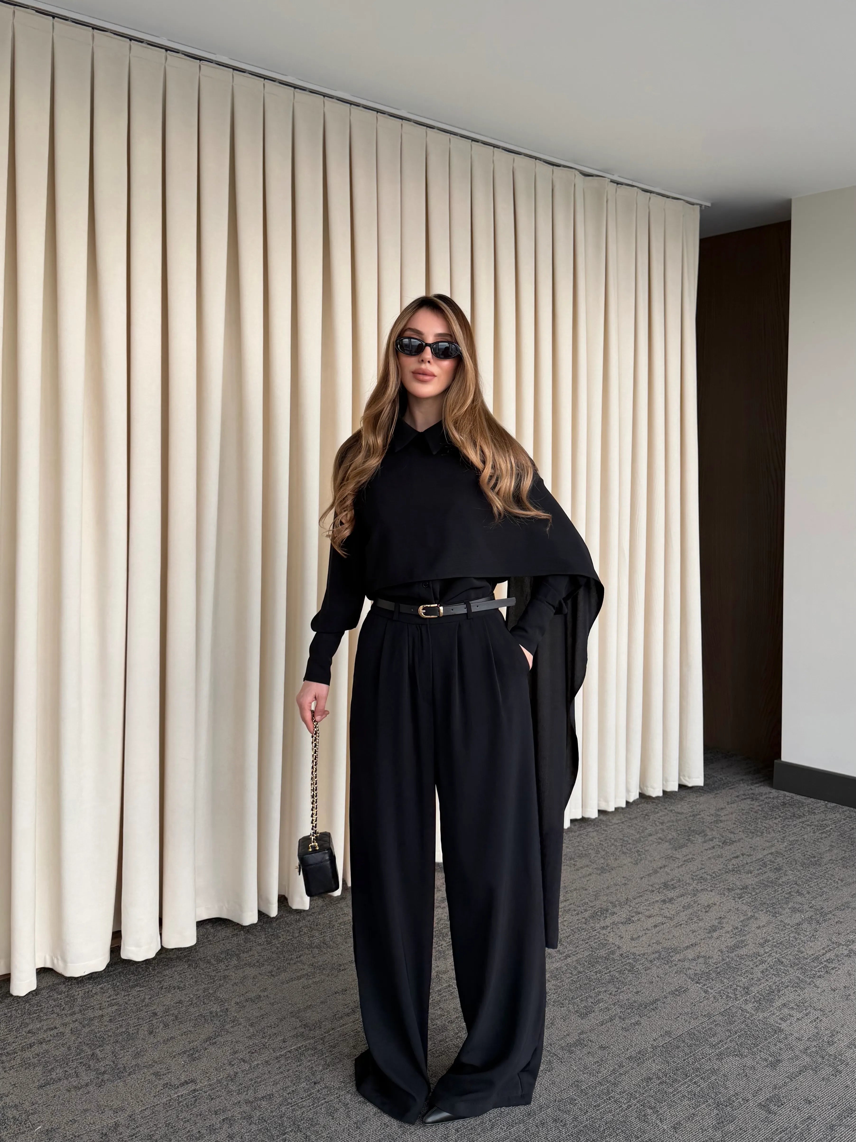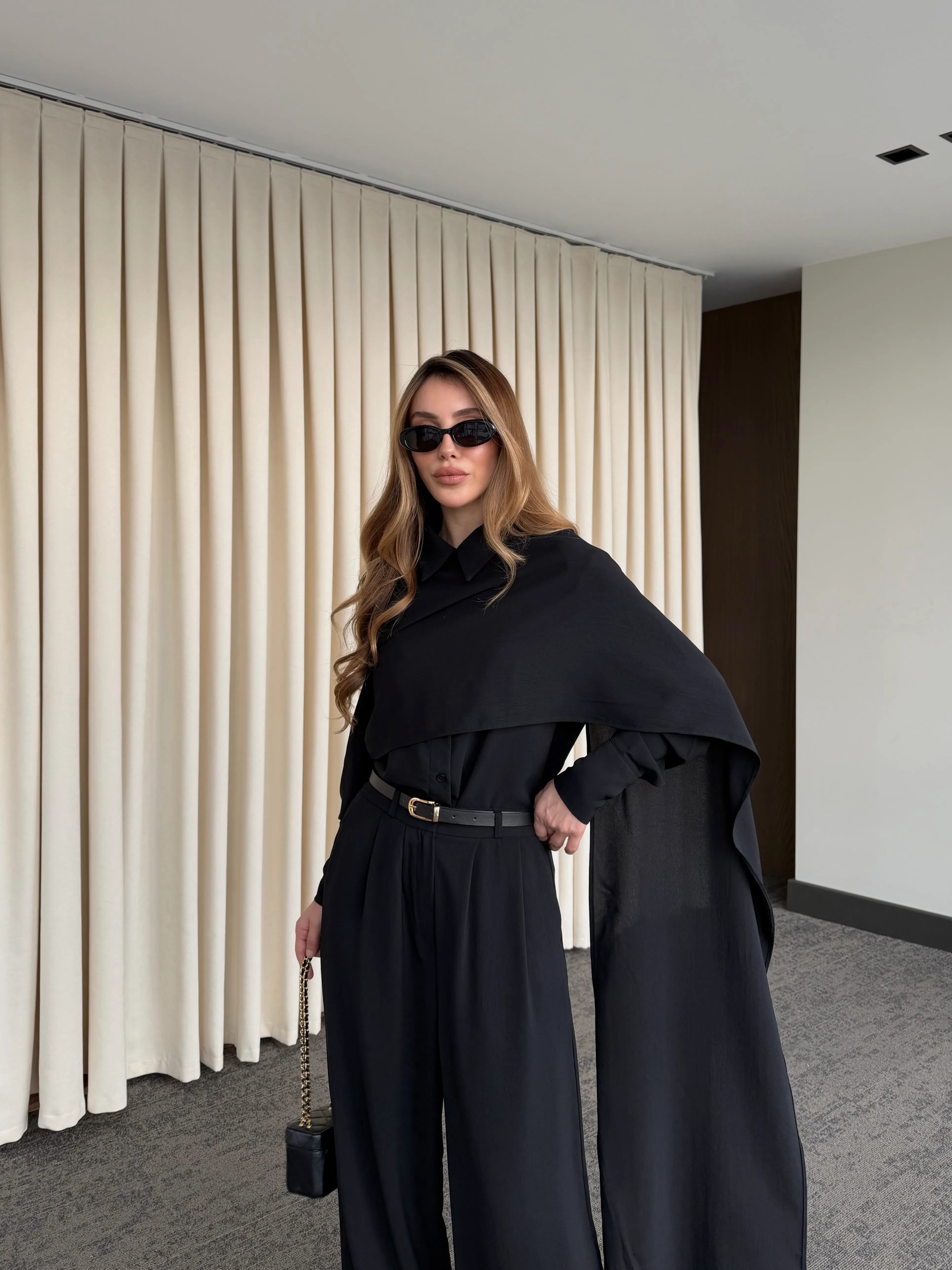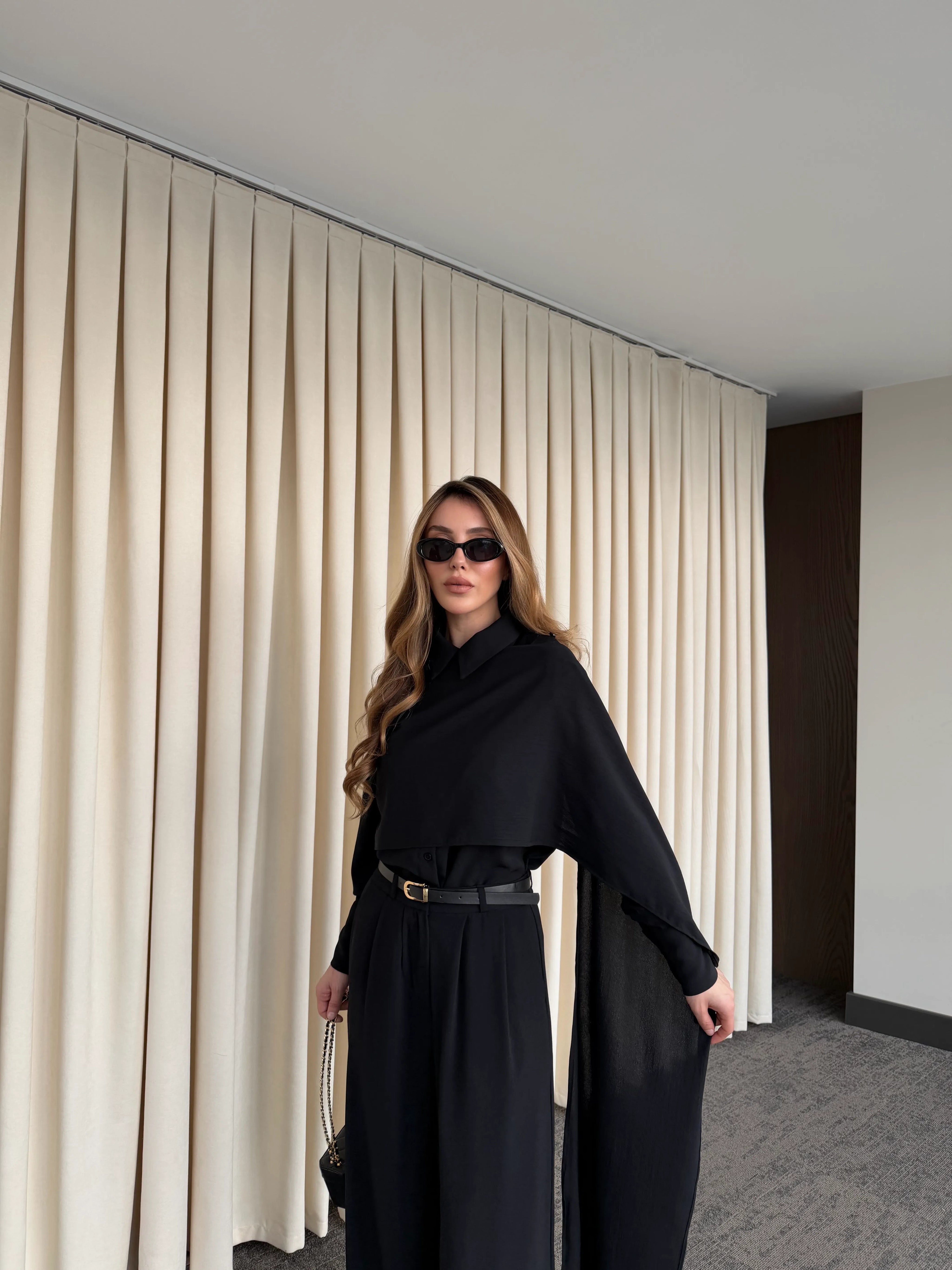 Siyah Kemerli Şal Yaka Gömlek Pantolon Takım - 8004