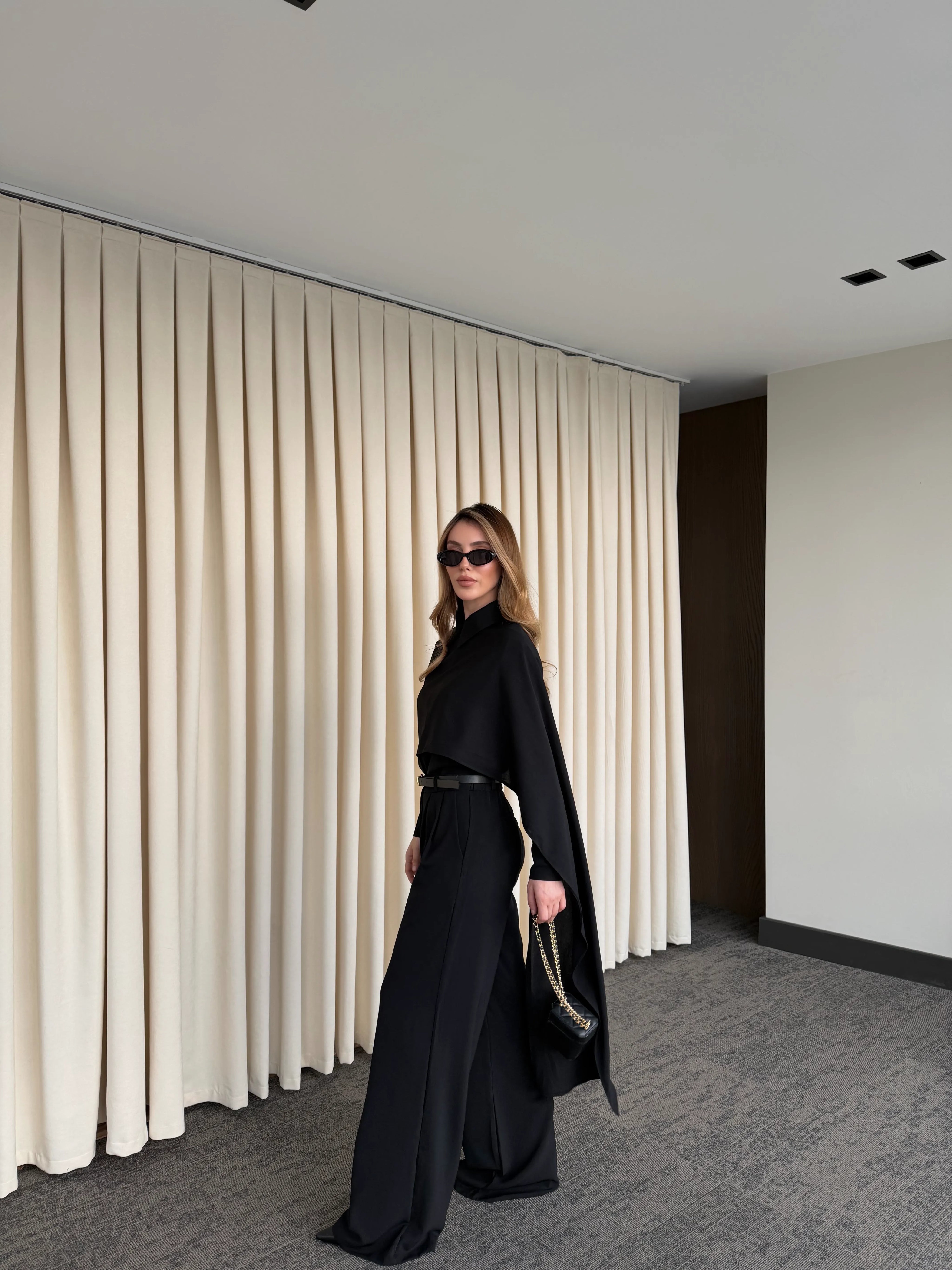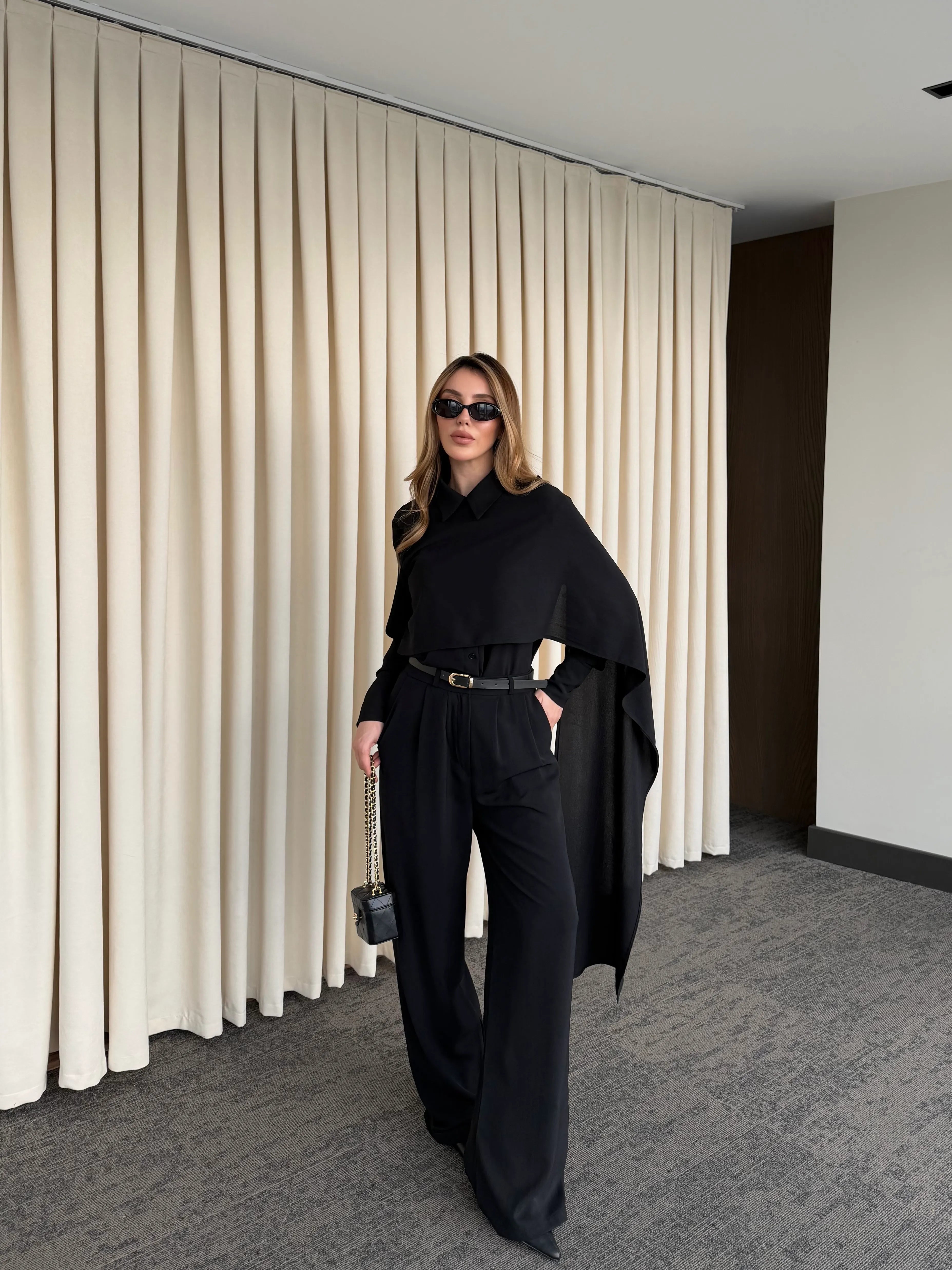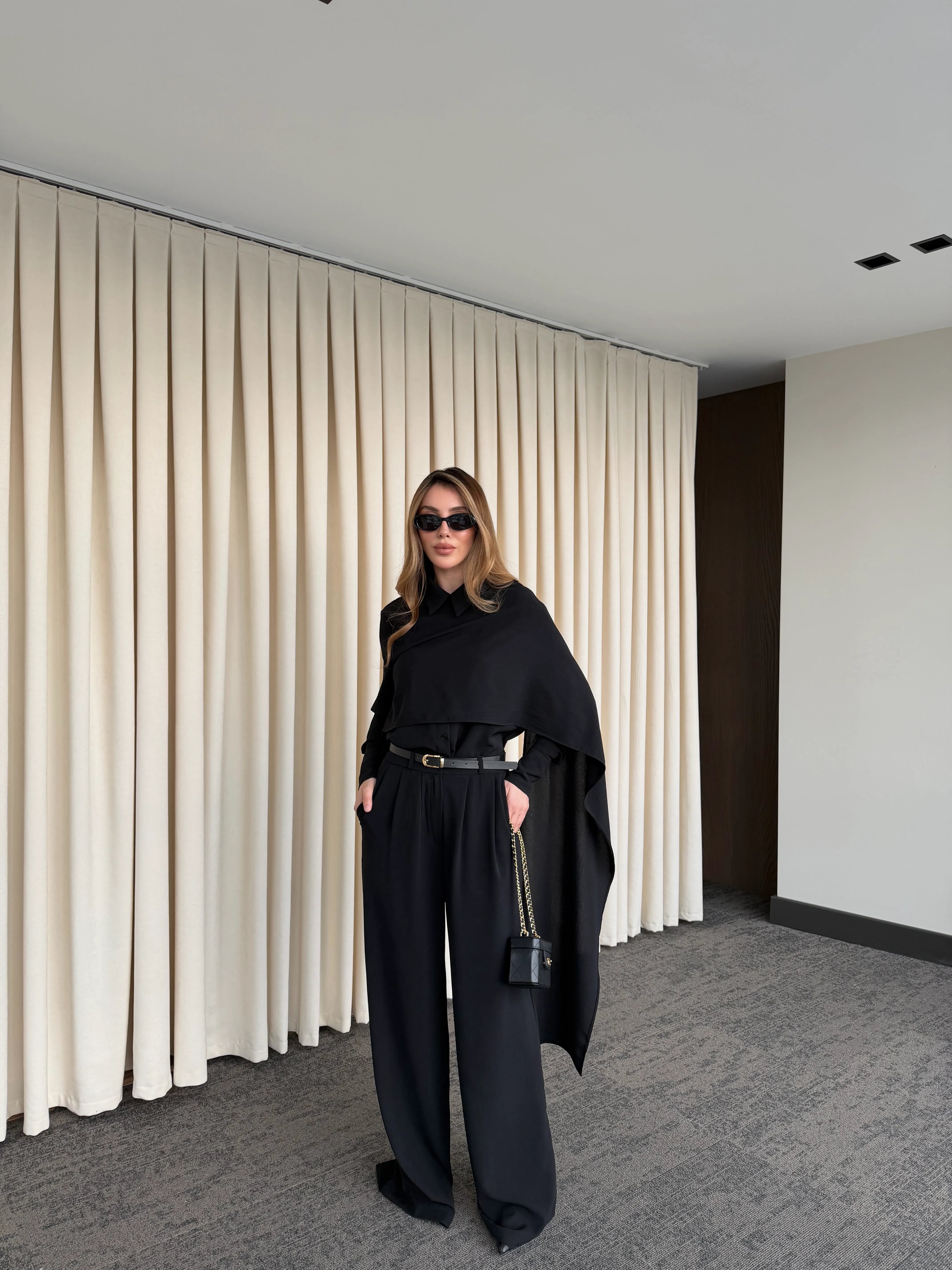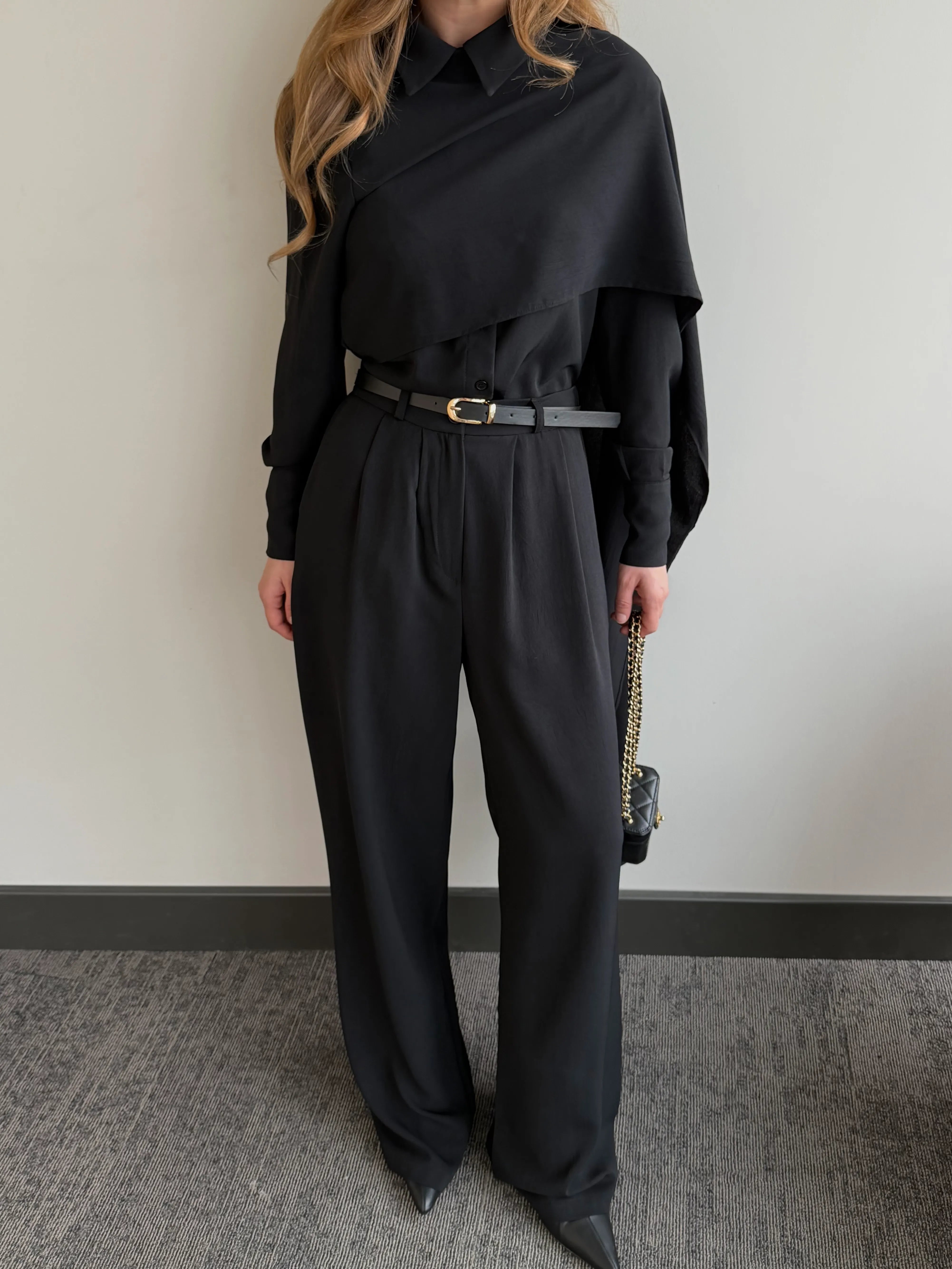 Siyah Kemerli Şal Yaka Gömlek Pantolon Takım - 8004