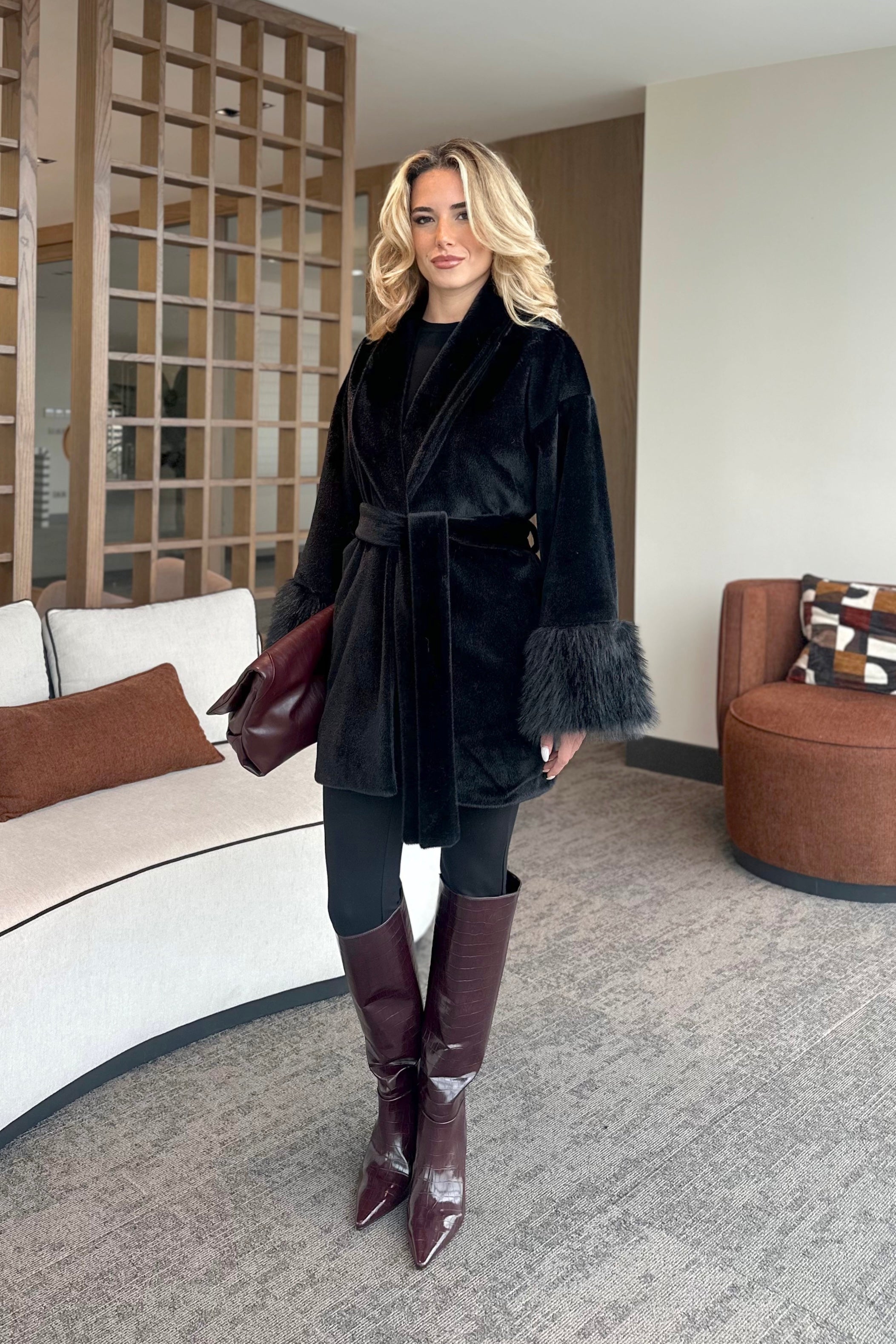 - Siyah Kolu Kürklü Kaşe Ceket - 2509