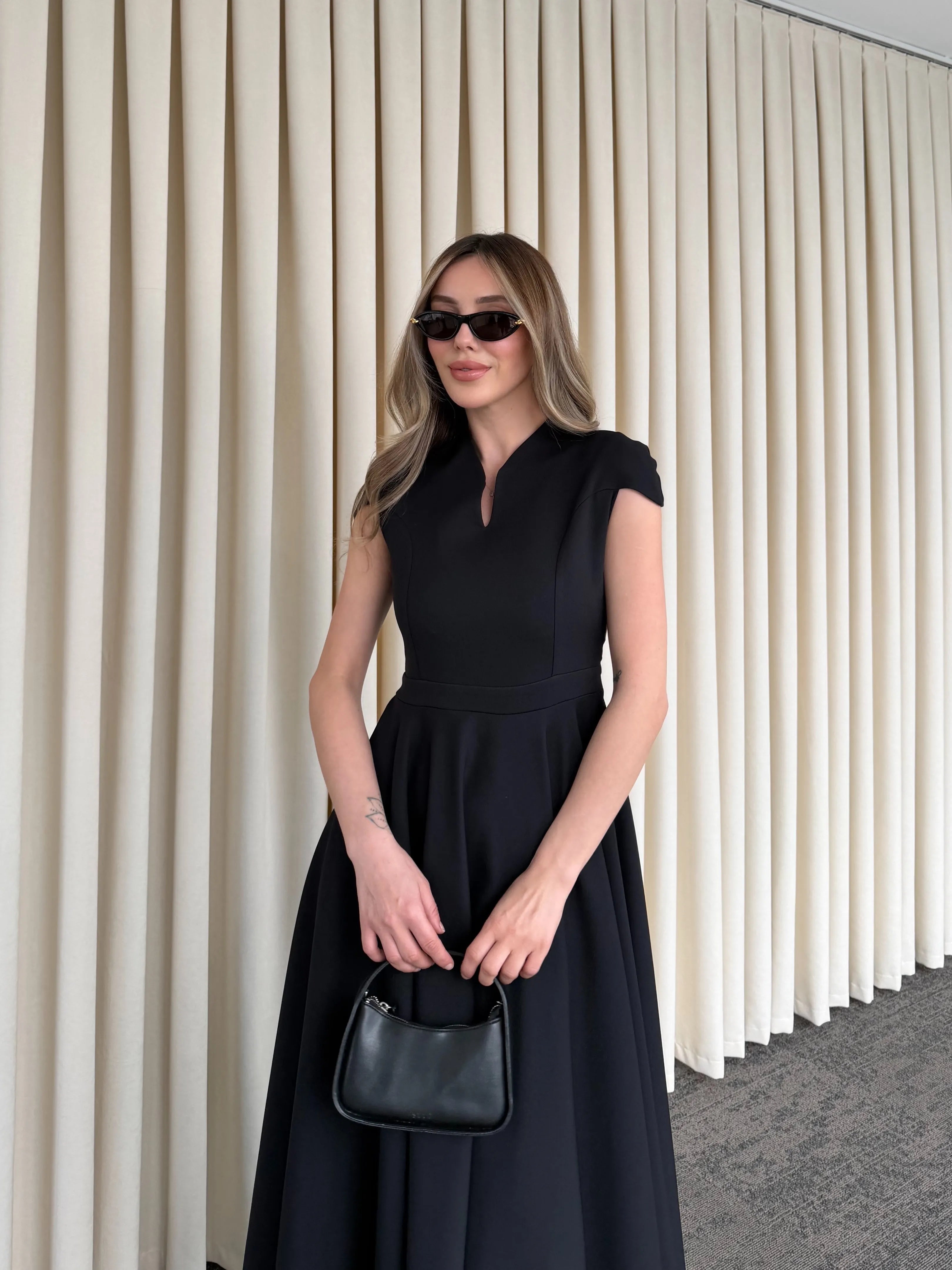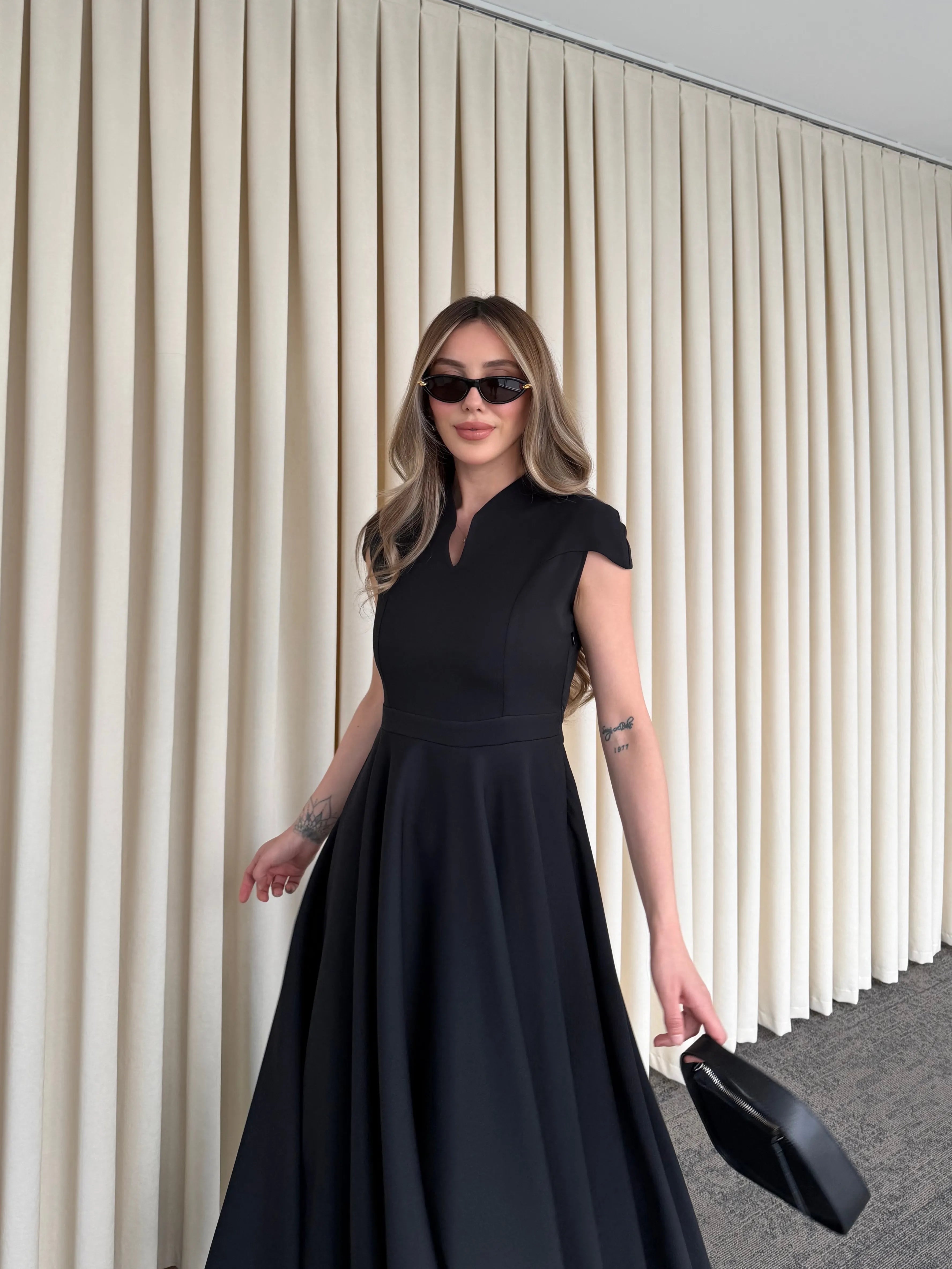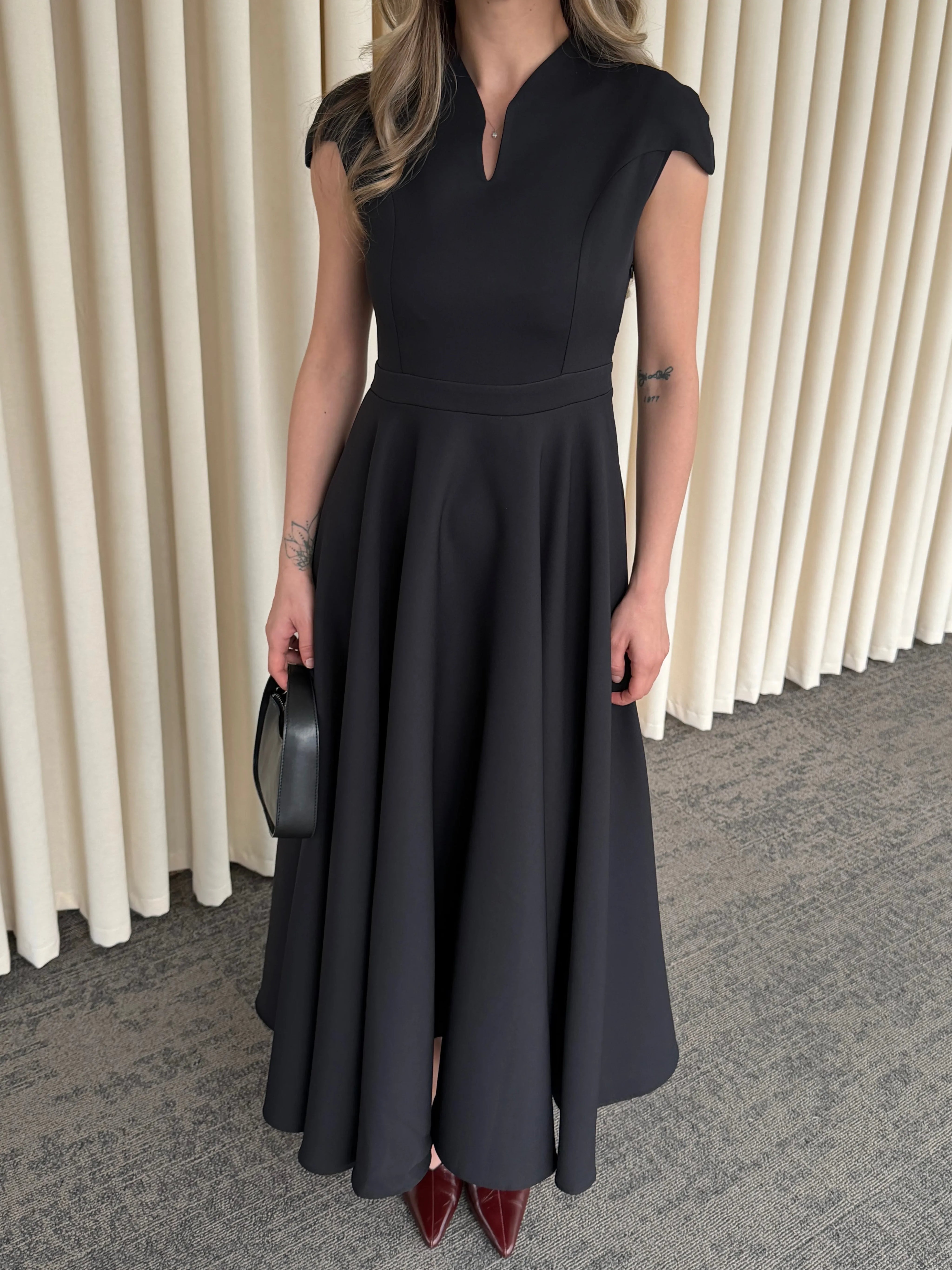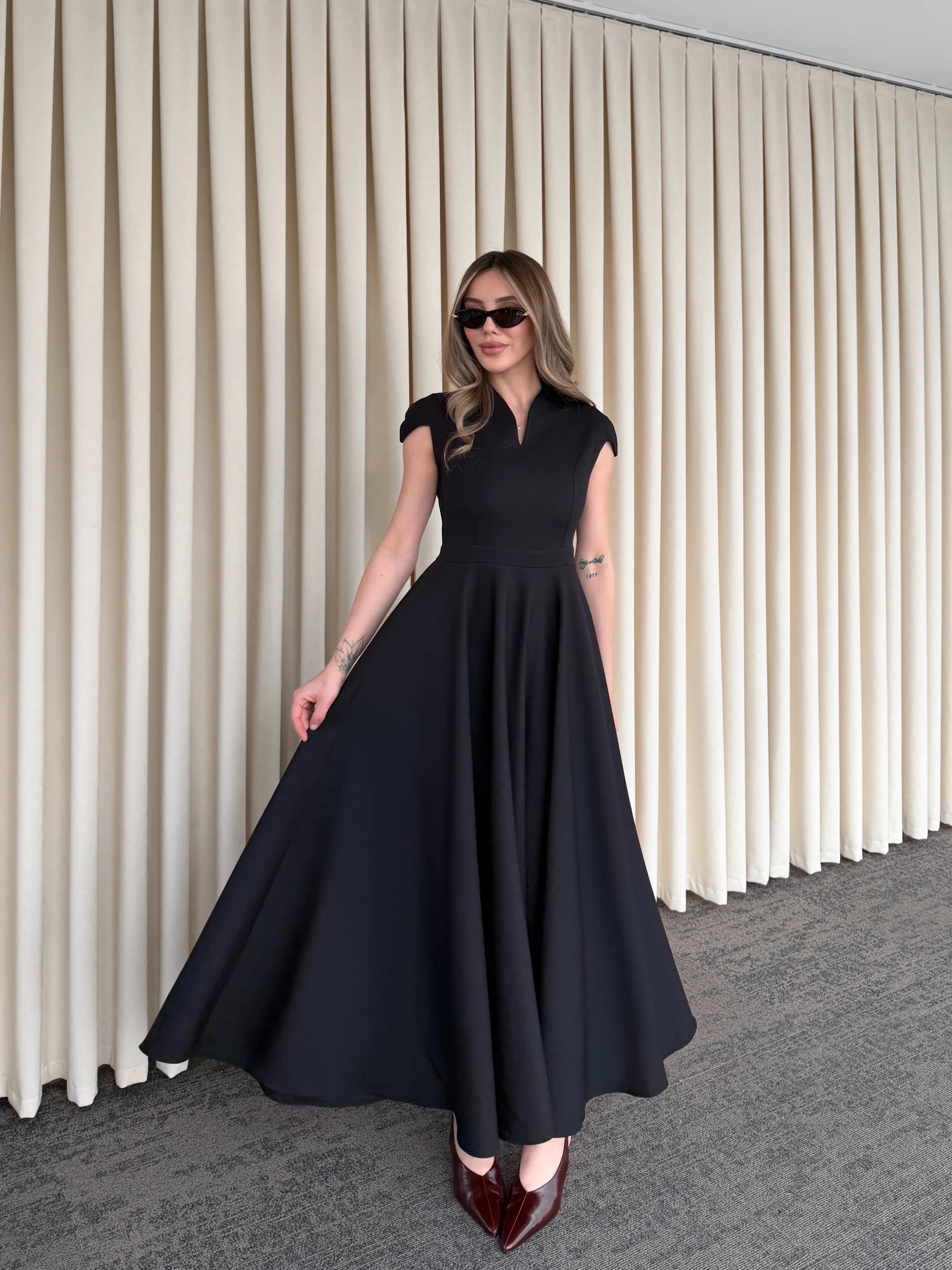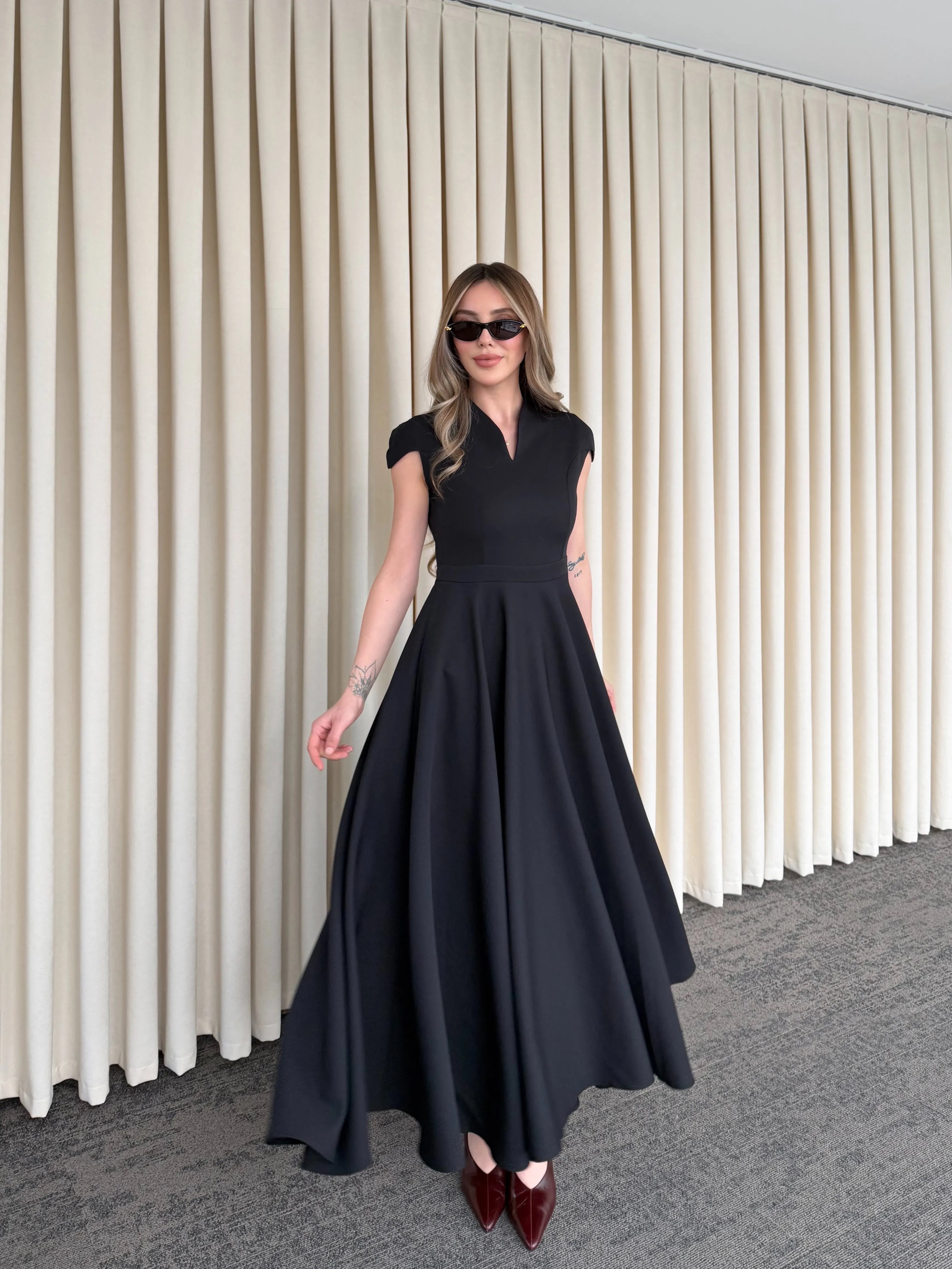 Yüksek terzilik işçiliğiyle hazırlanan bu parça, modern kadının gardırobundaki "kilit parça" olma özelliğini taşır. Gövdeye tam oturan üst kalıp ile hacimli etek yapısı arasındaki kusursuz denge, zamansız bir estetik anlayışını yansıtır.