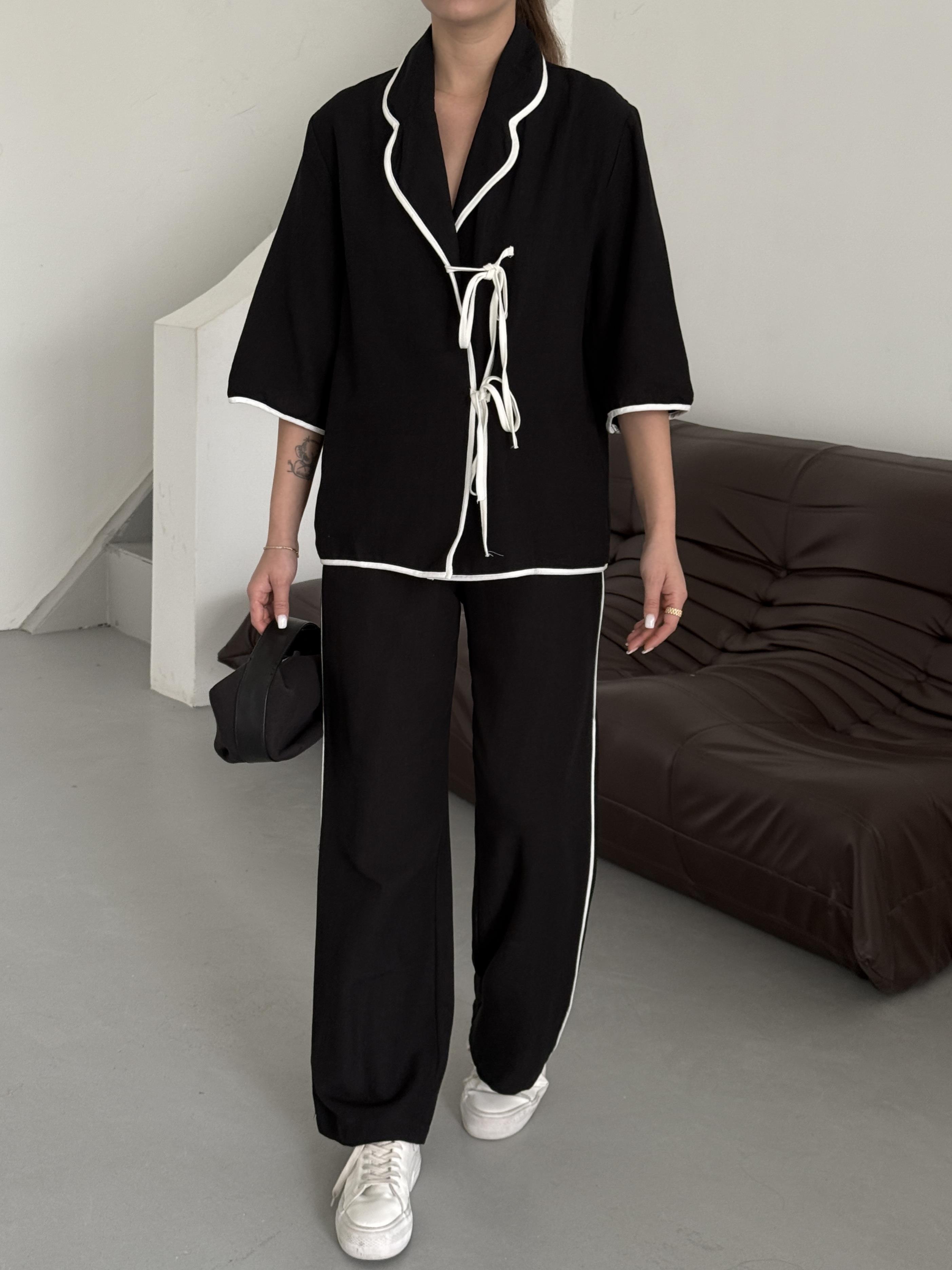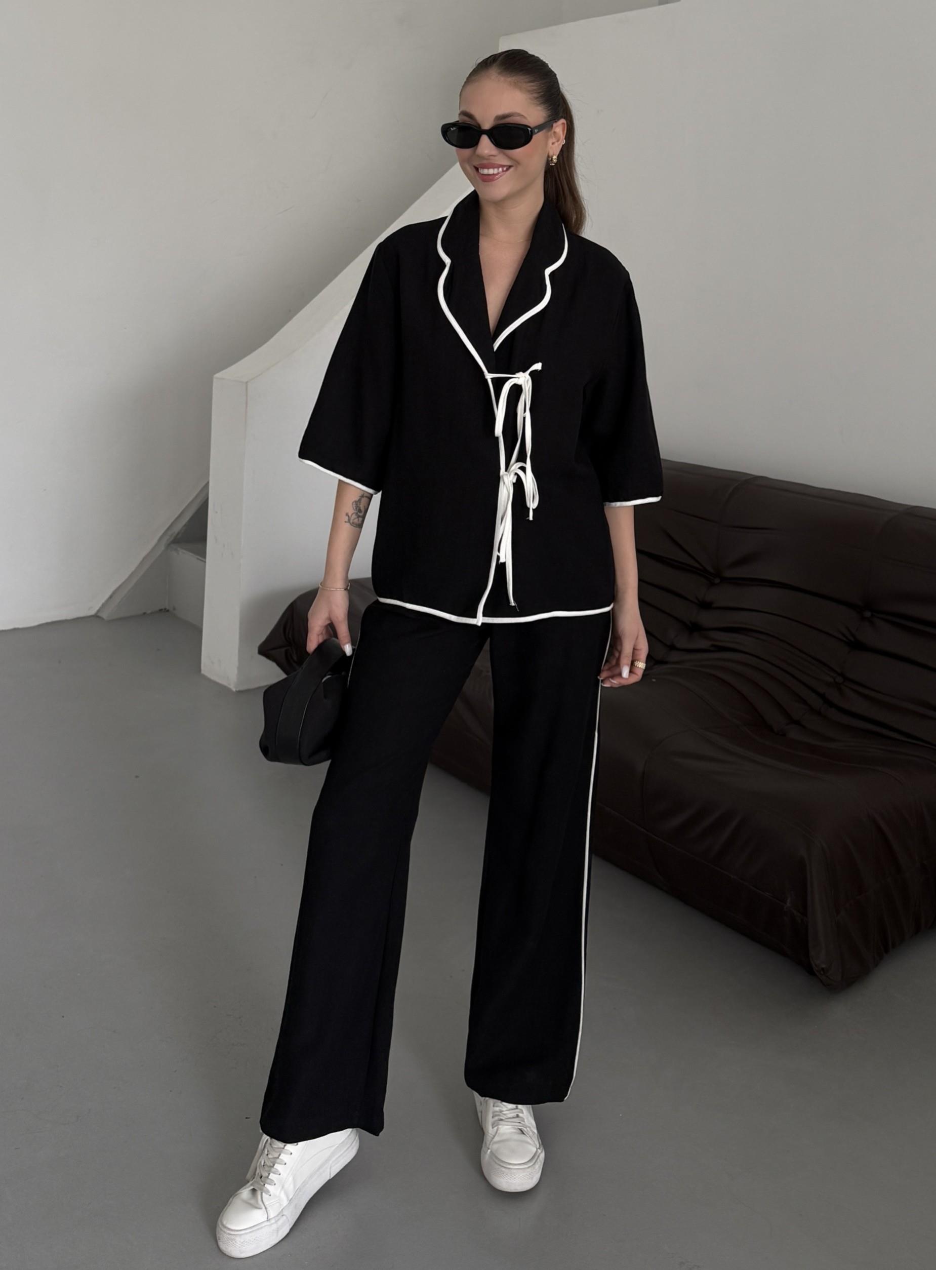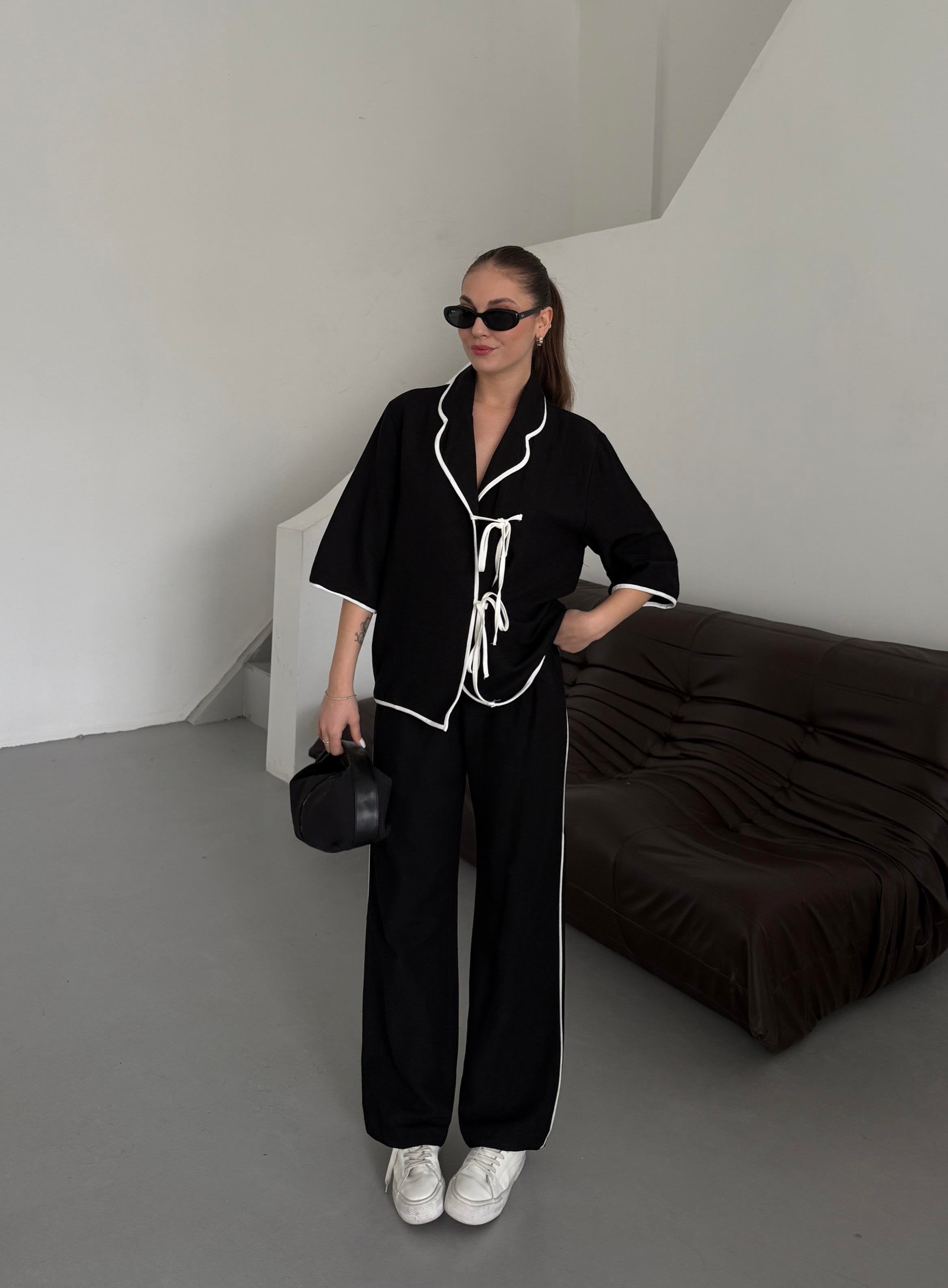 - Siyah -Natural Biyeli Bluz Pantolon Takım