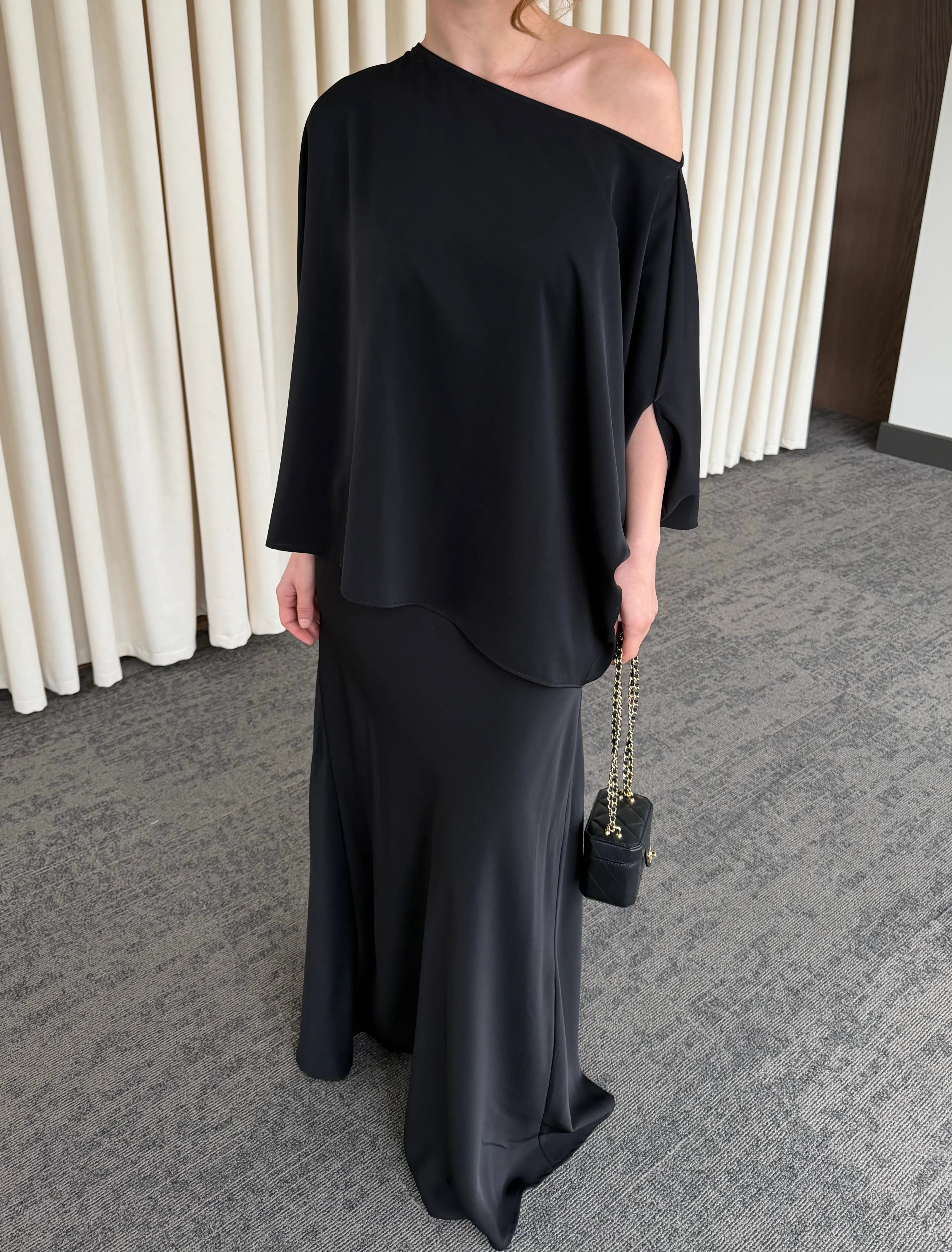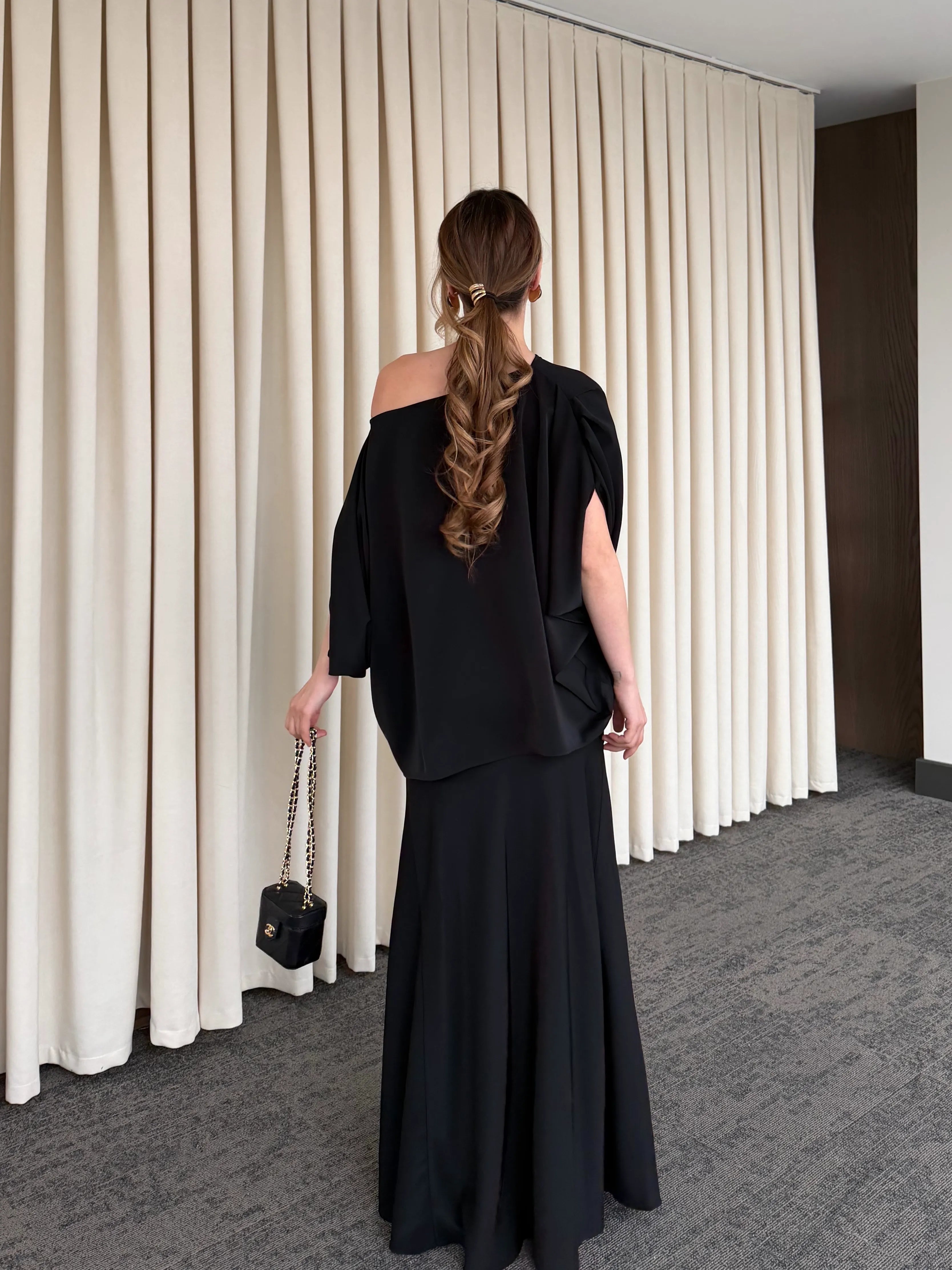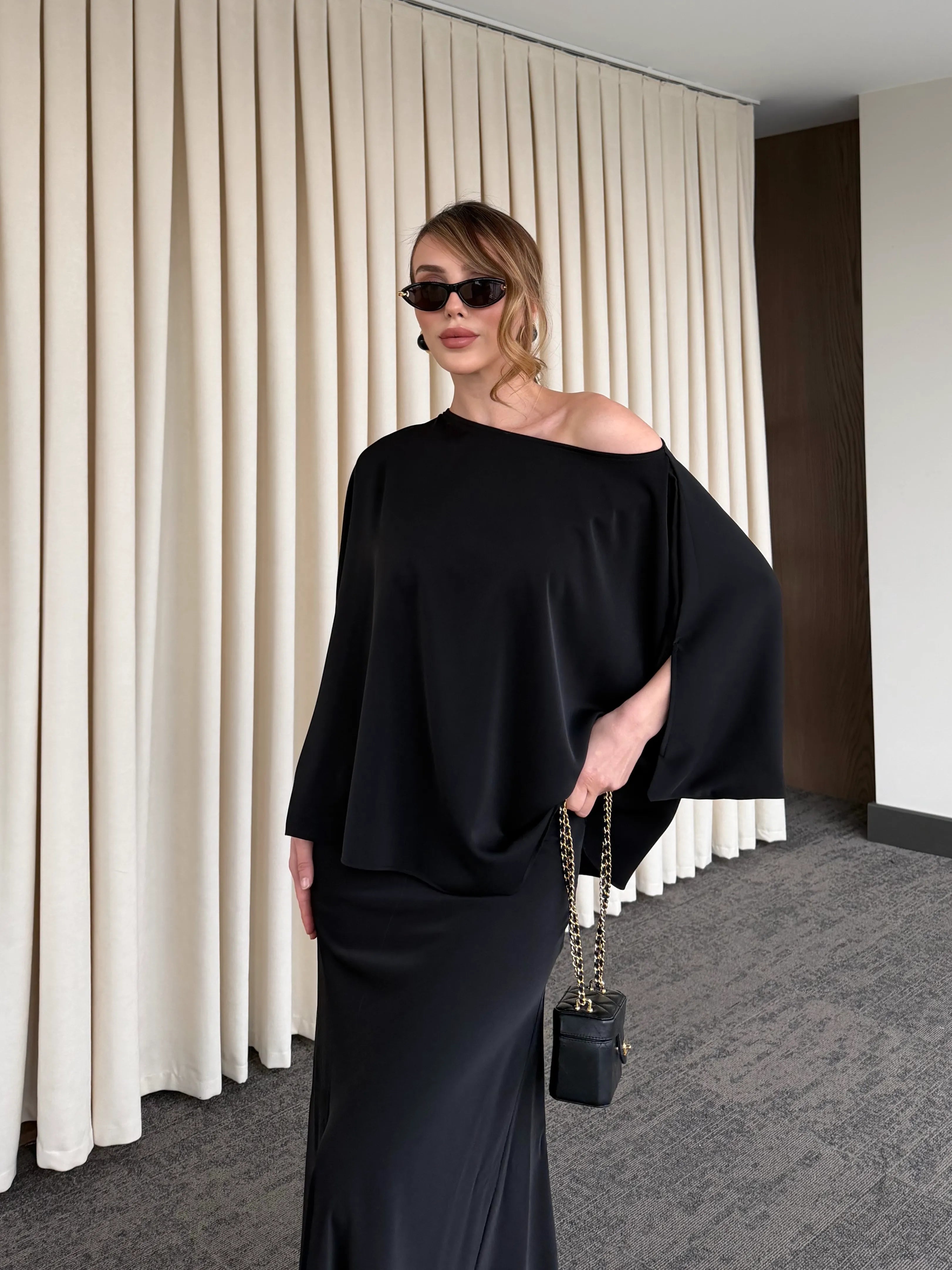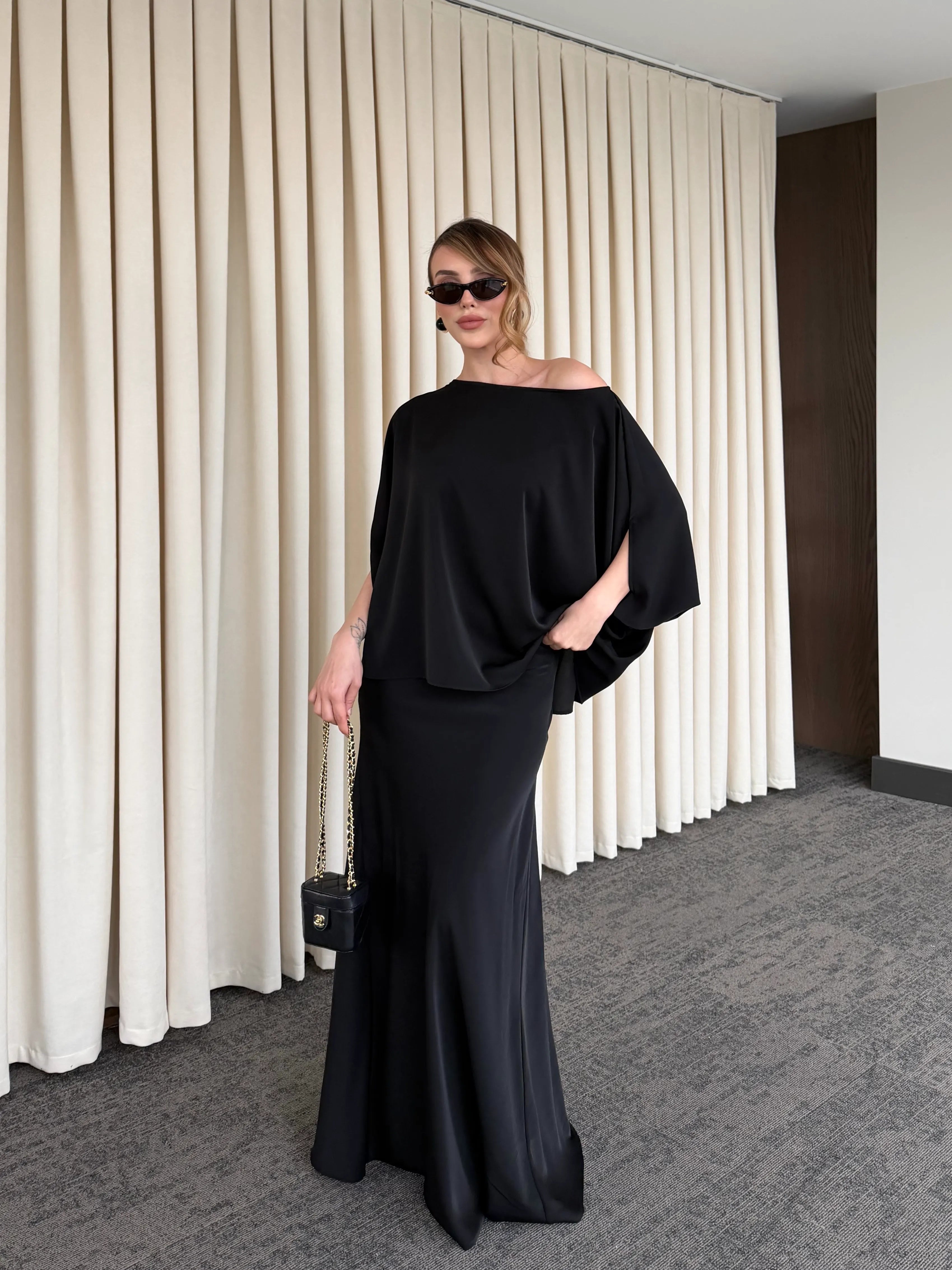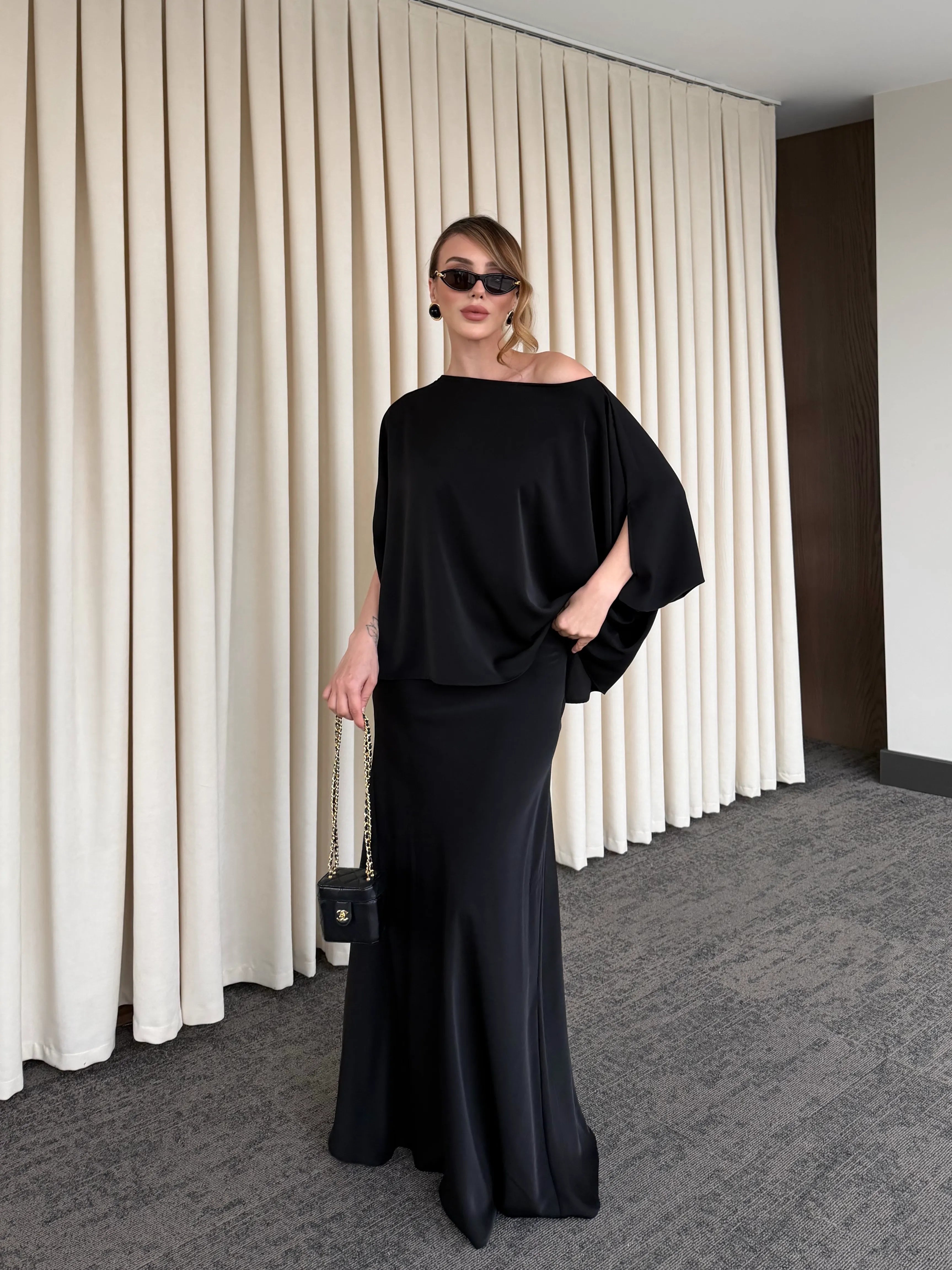 Minimal tasarımı ve akıcı duruşuyla öne çıkan bu alt üst takım, zamansız şıklığın en sofistike halini sunuyor. Rahat kesim üst parçası, dökümlü yapısıyla hem konforlu hem de güçlü bir siluet oluştururken; uzun, akışkan etek formu feminen ve asil bir görünüm kazandırır.