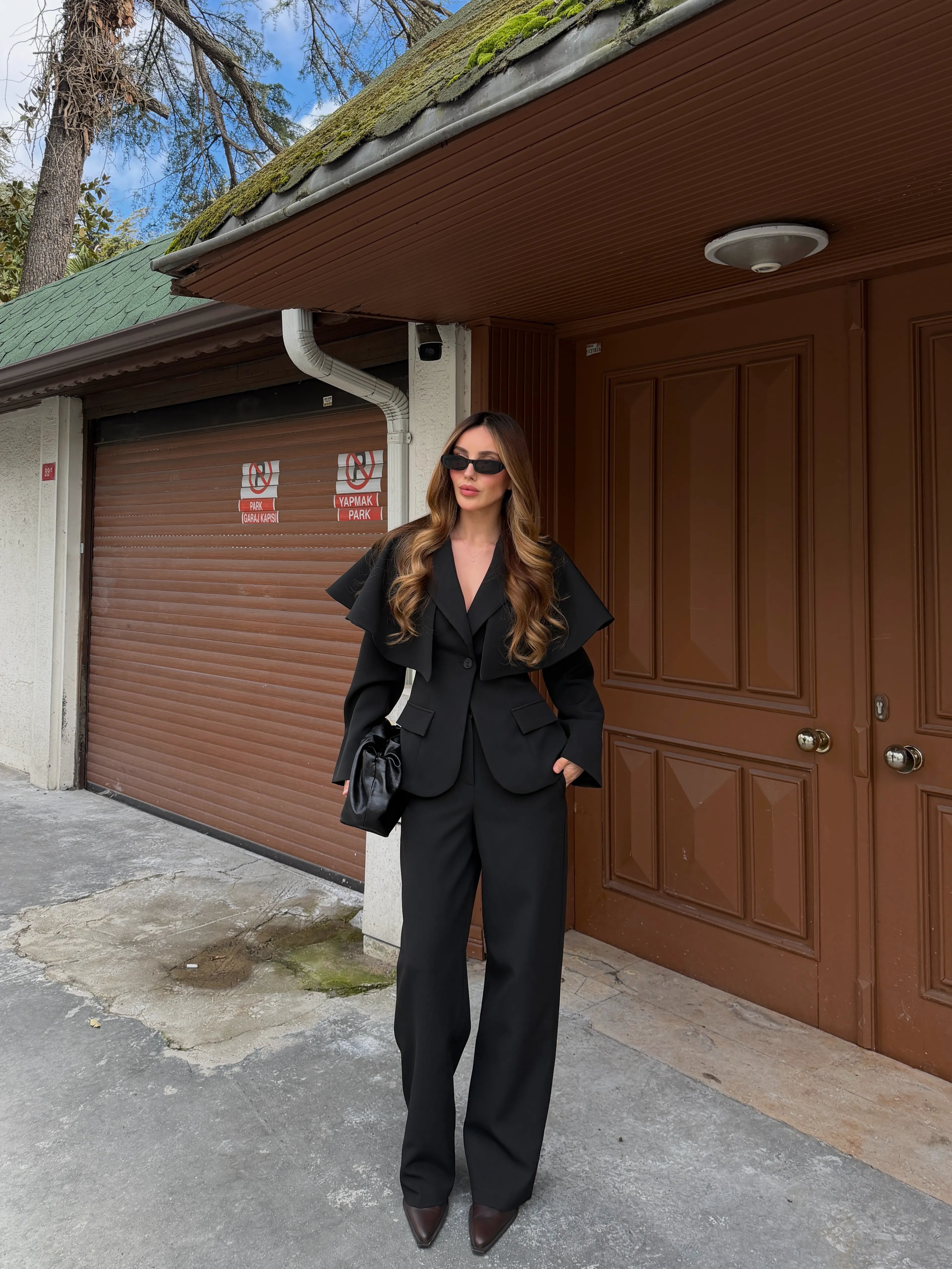 Pelerin detaylı bu özel tasarım takım, klasik ceket formuna modern ve iddialı bir yorum katıyor. Omuzlardan zarifçe düşen pelerin kesimi, her adımda hareket kazanarak sofistike bir görünüm oluştururken stilinizi sıradanlıktan uzaklaştırır.