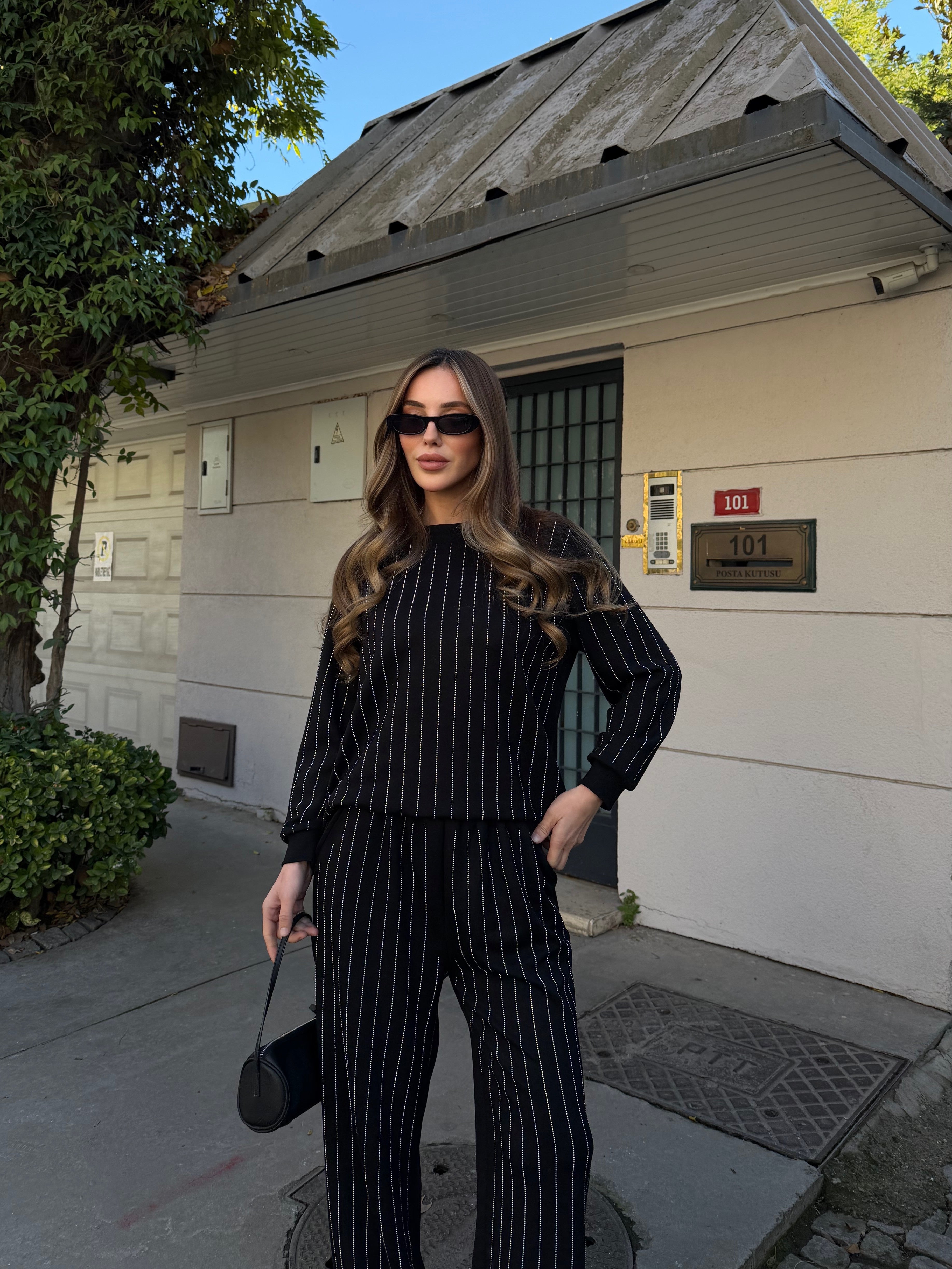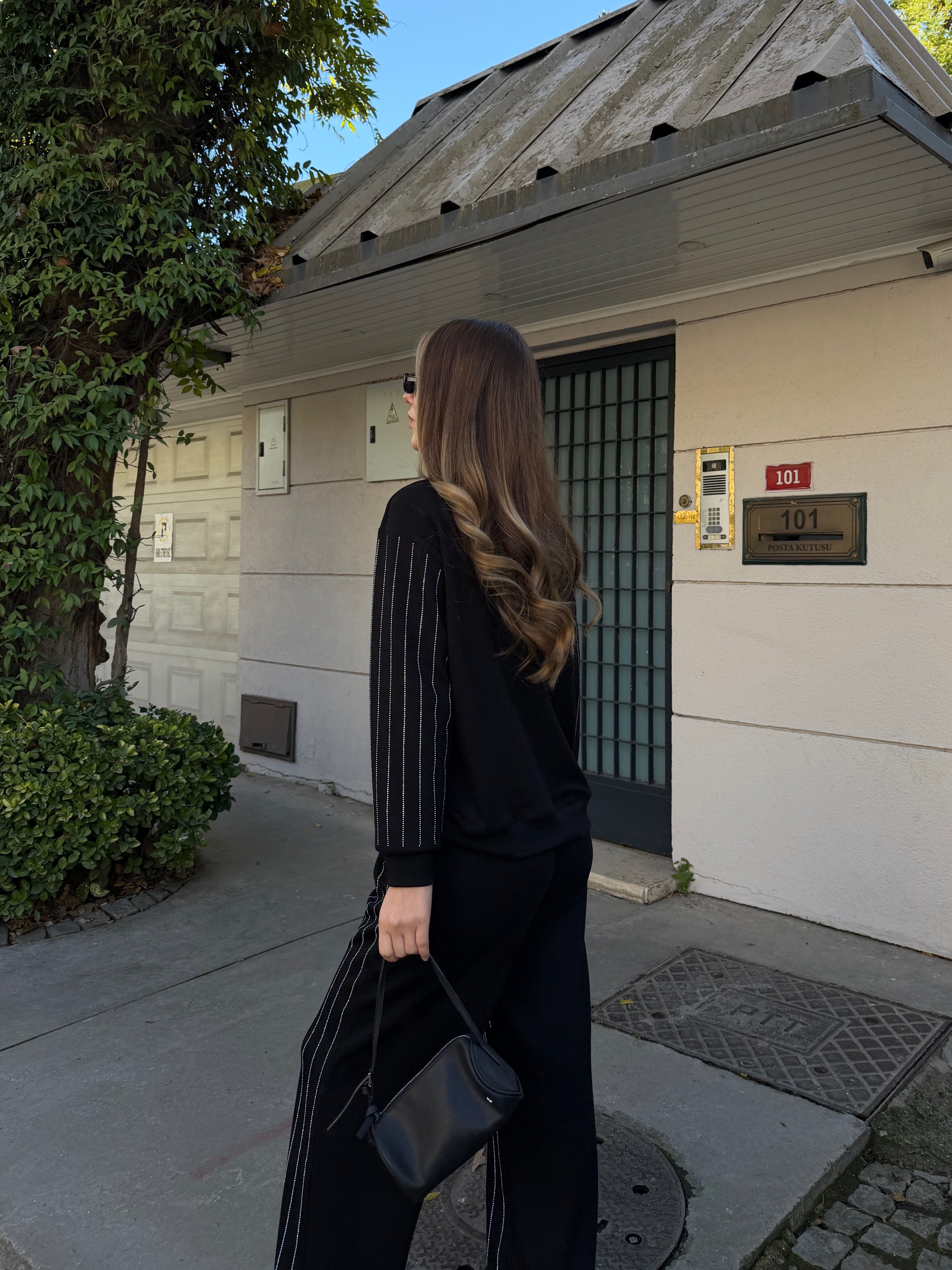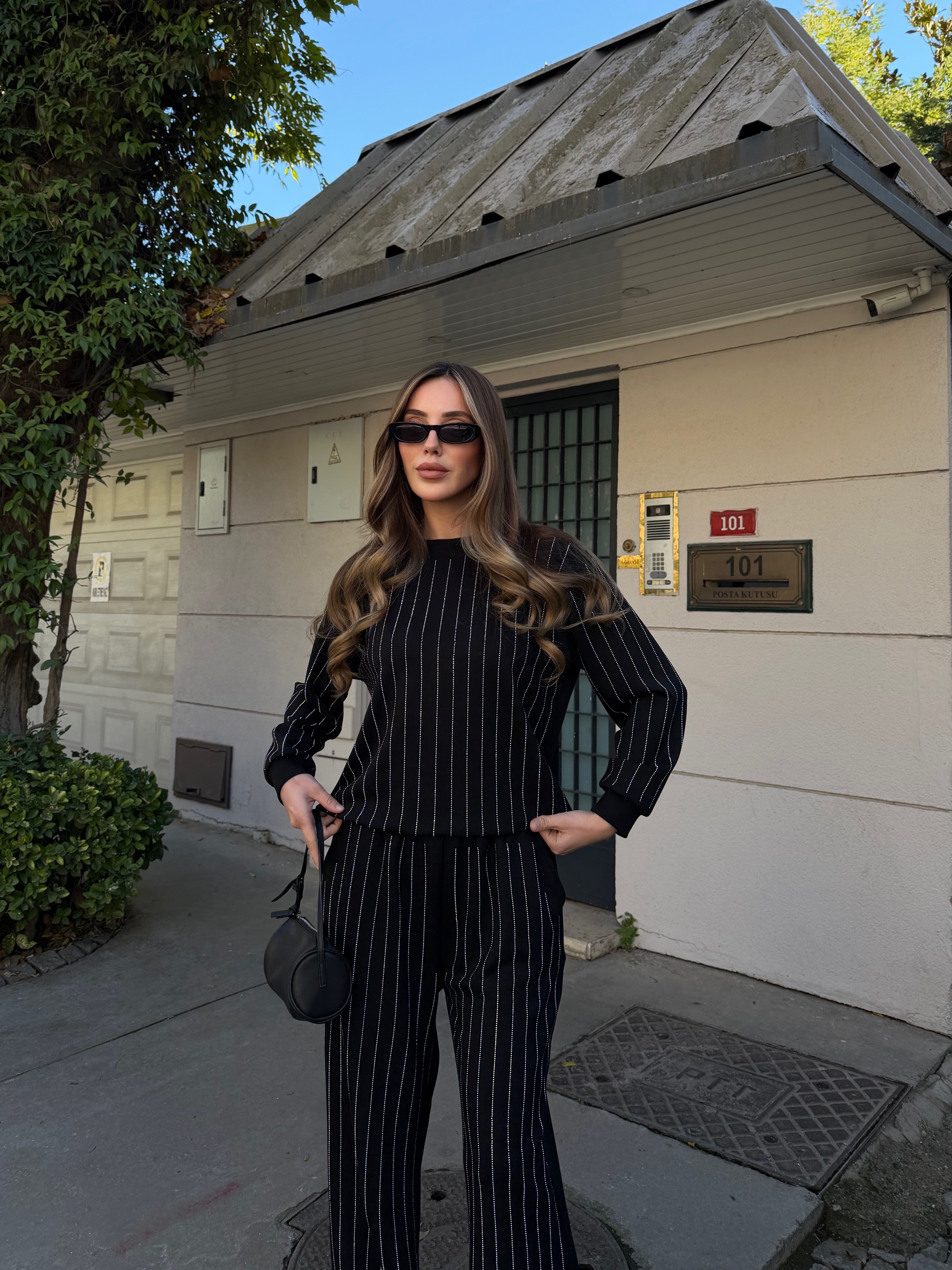 - Siyah Taşlı Bluz Pantolon Takım - 0766