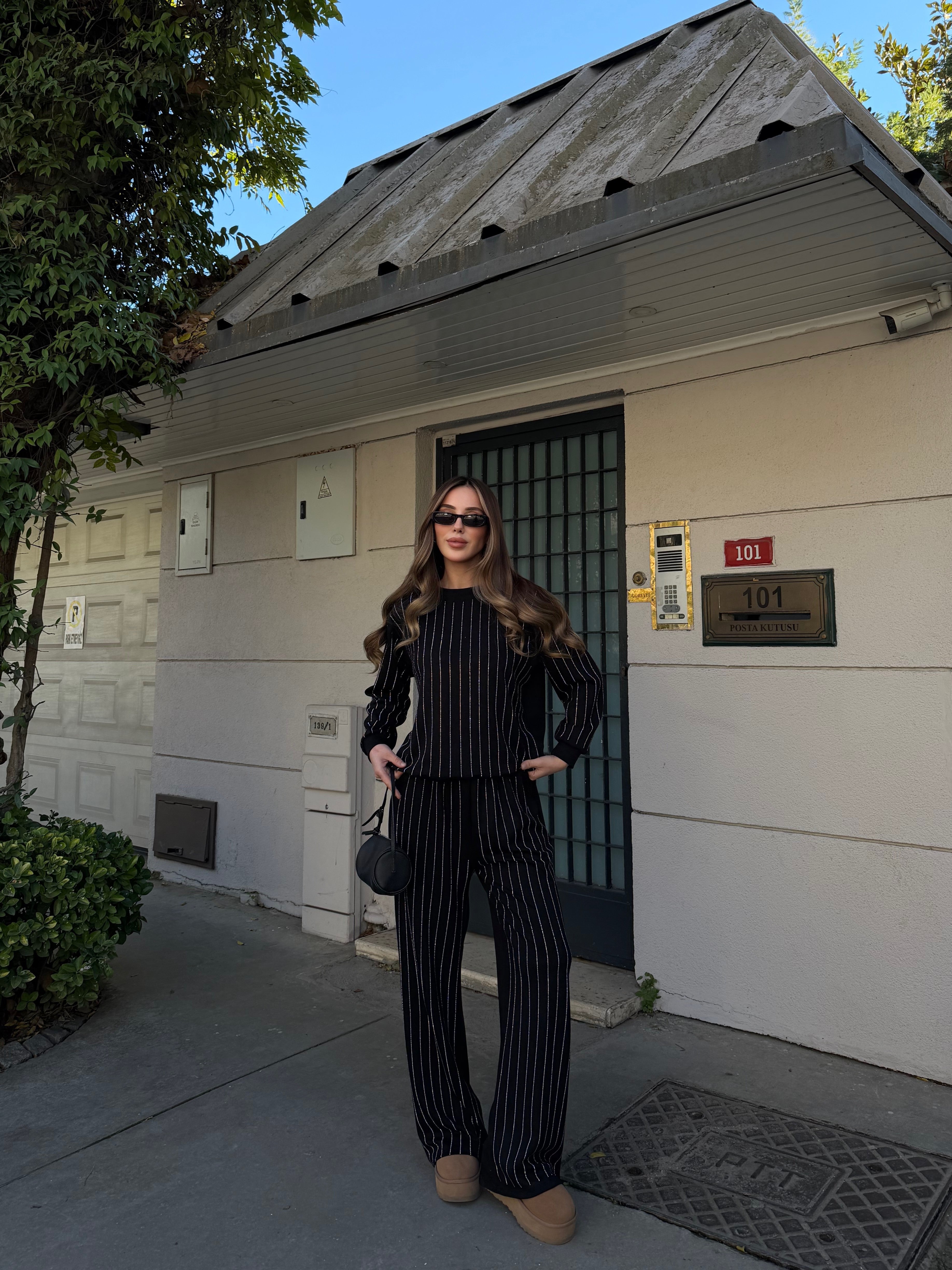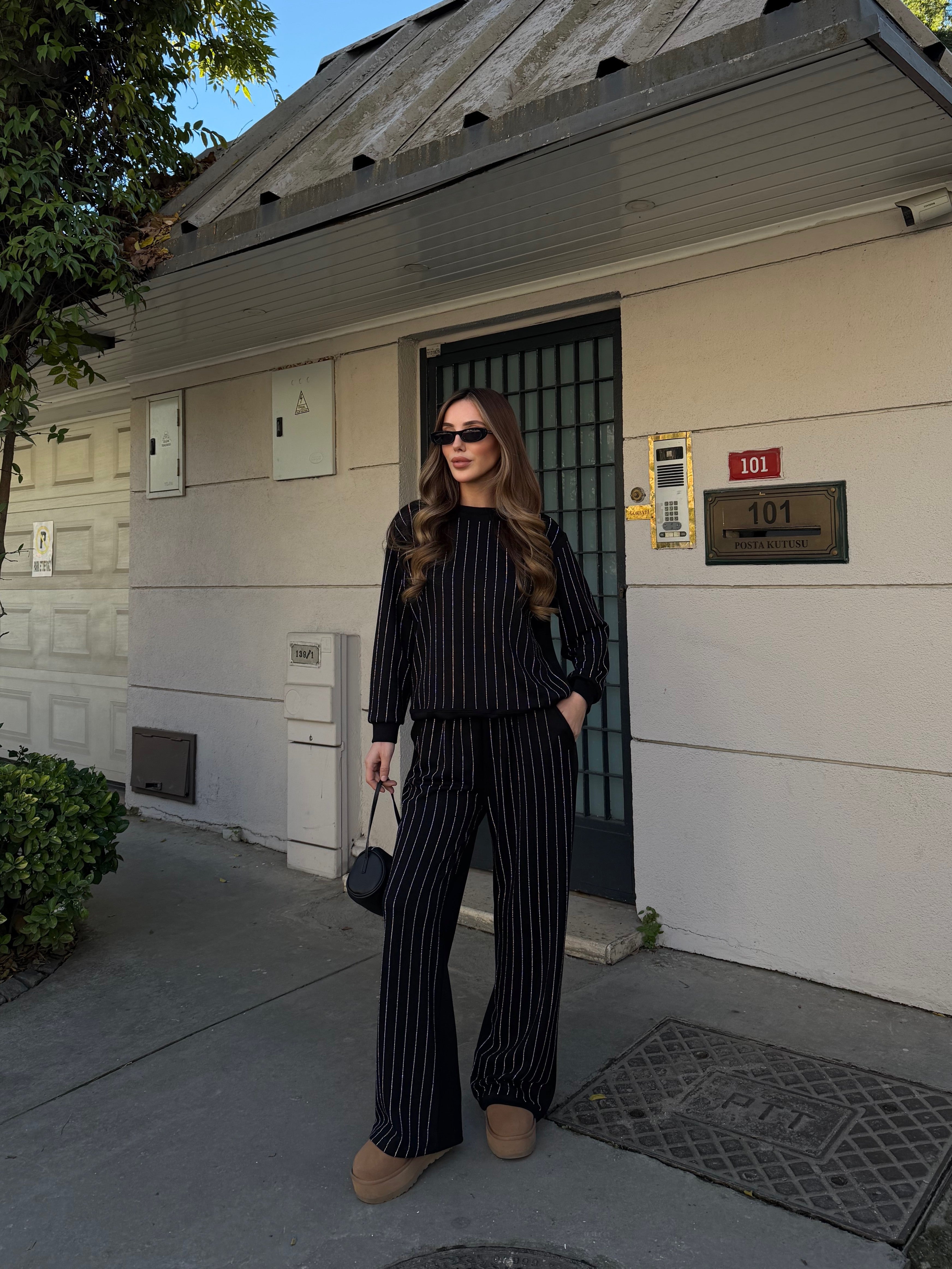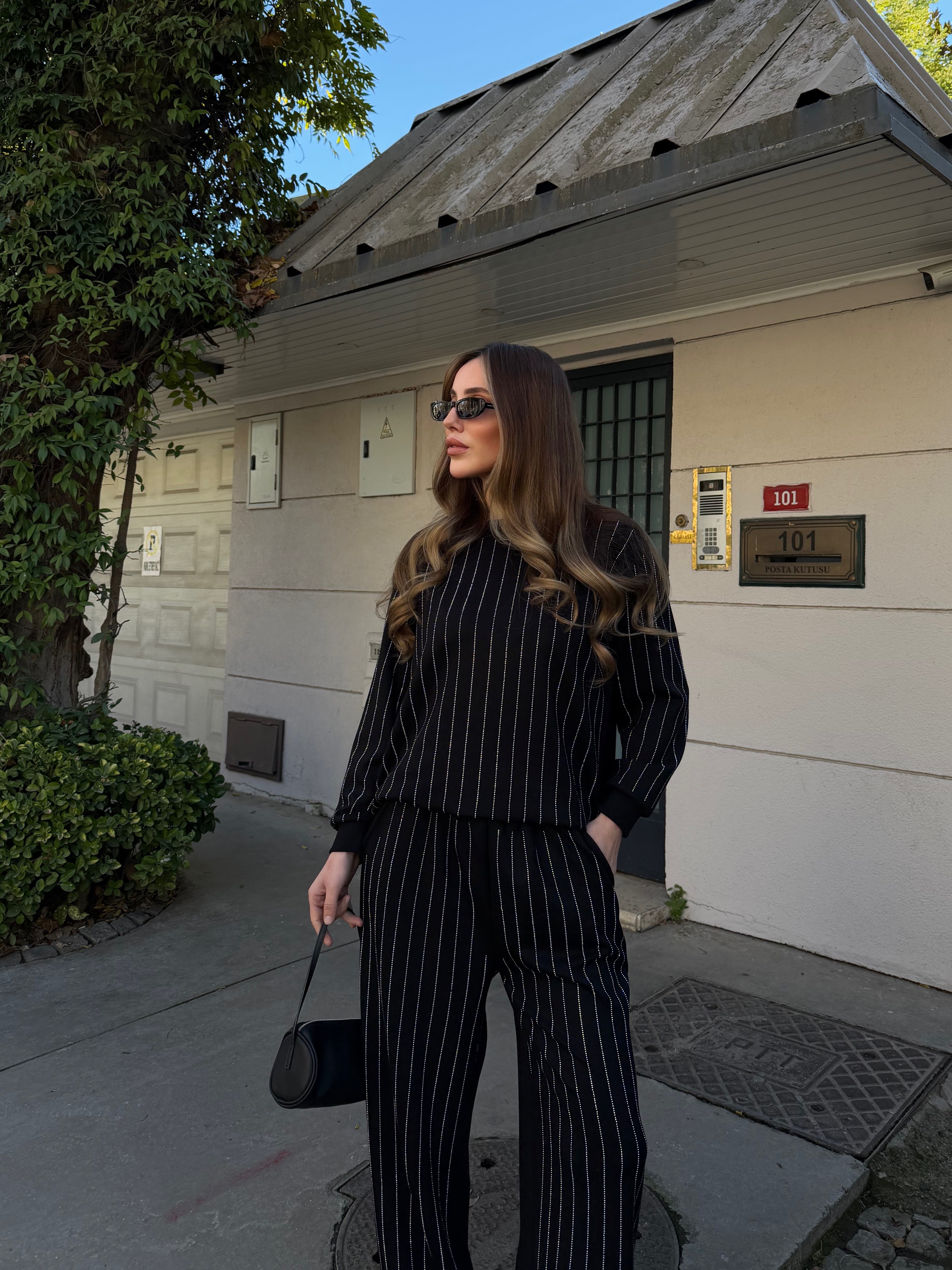 - Siyah Taşlı Bluz Pantolon Takım - 0766