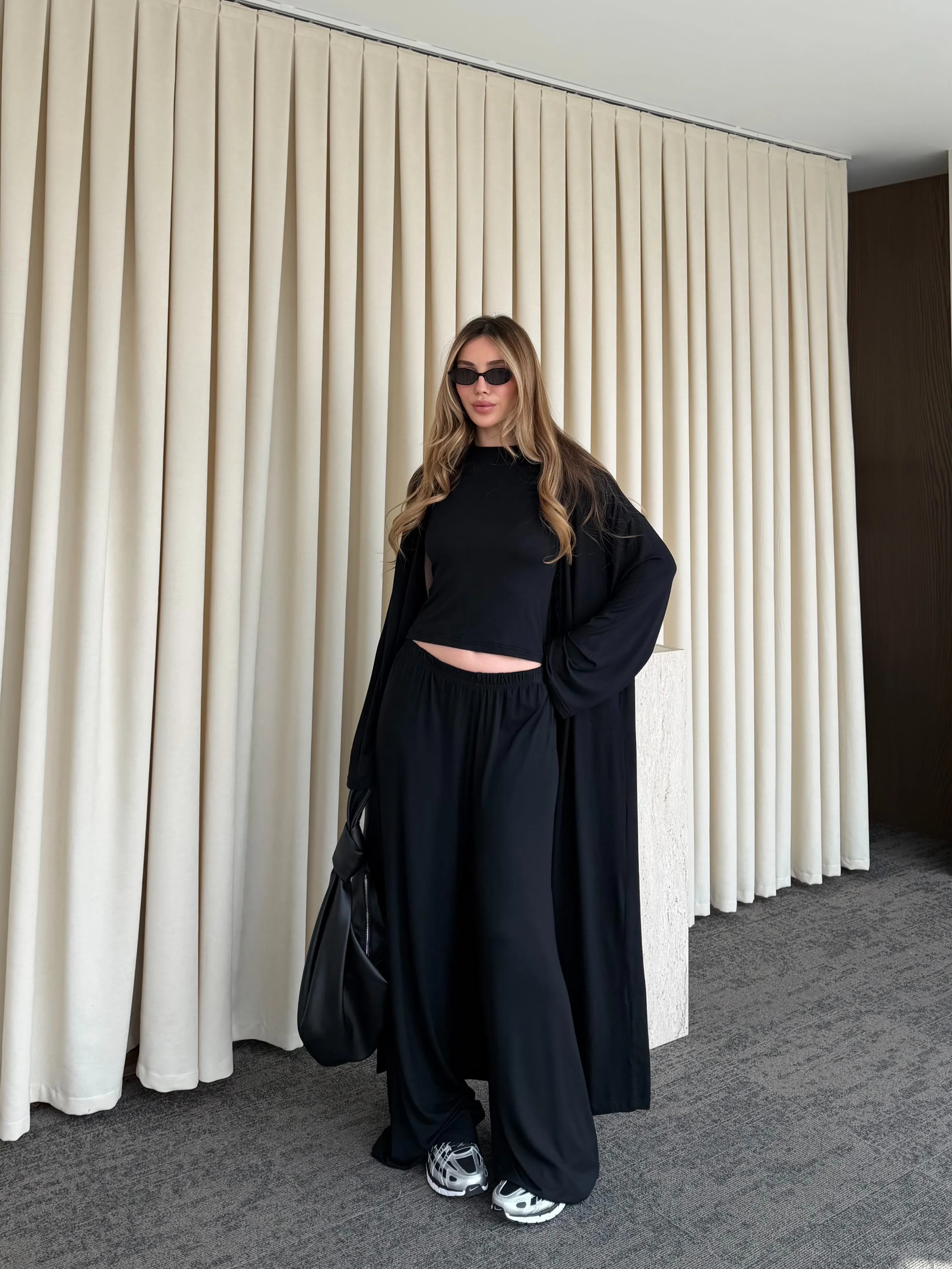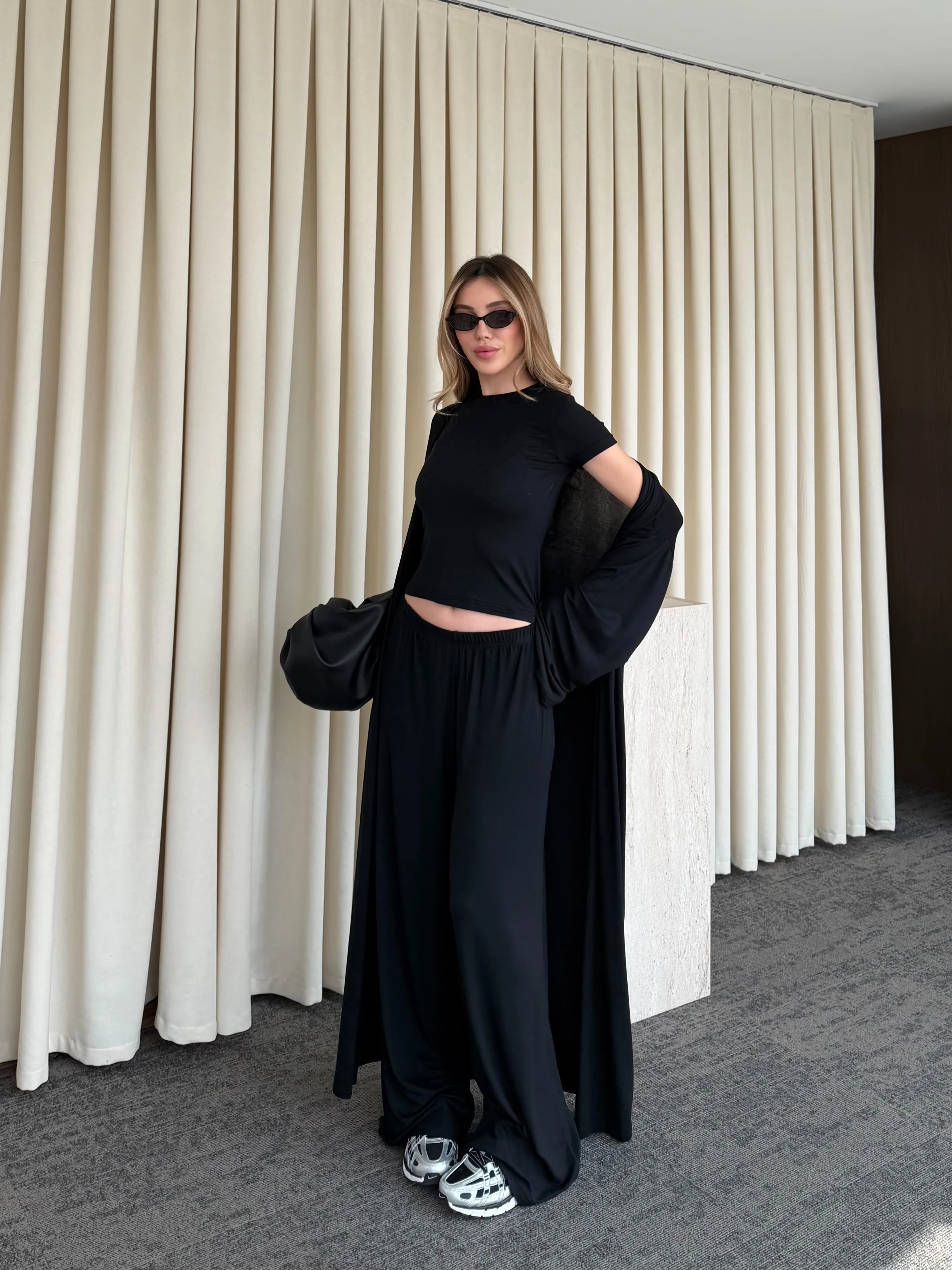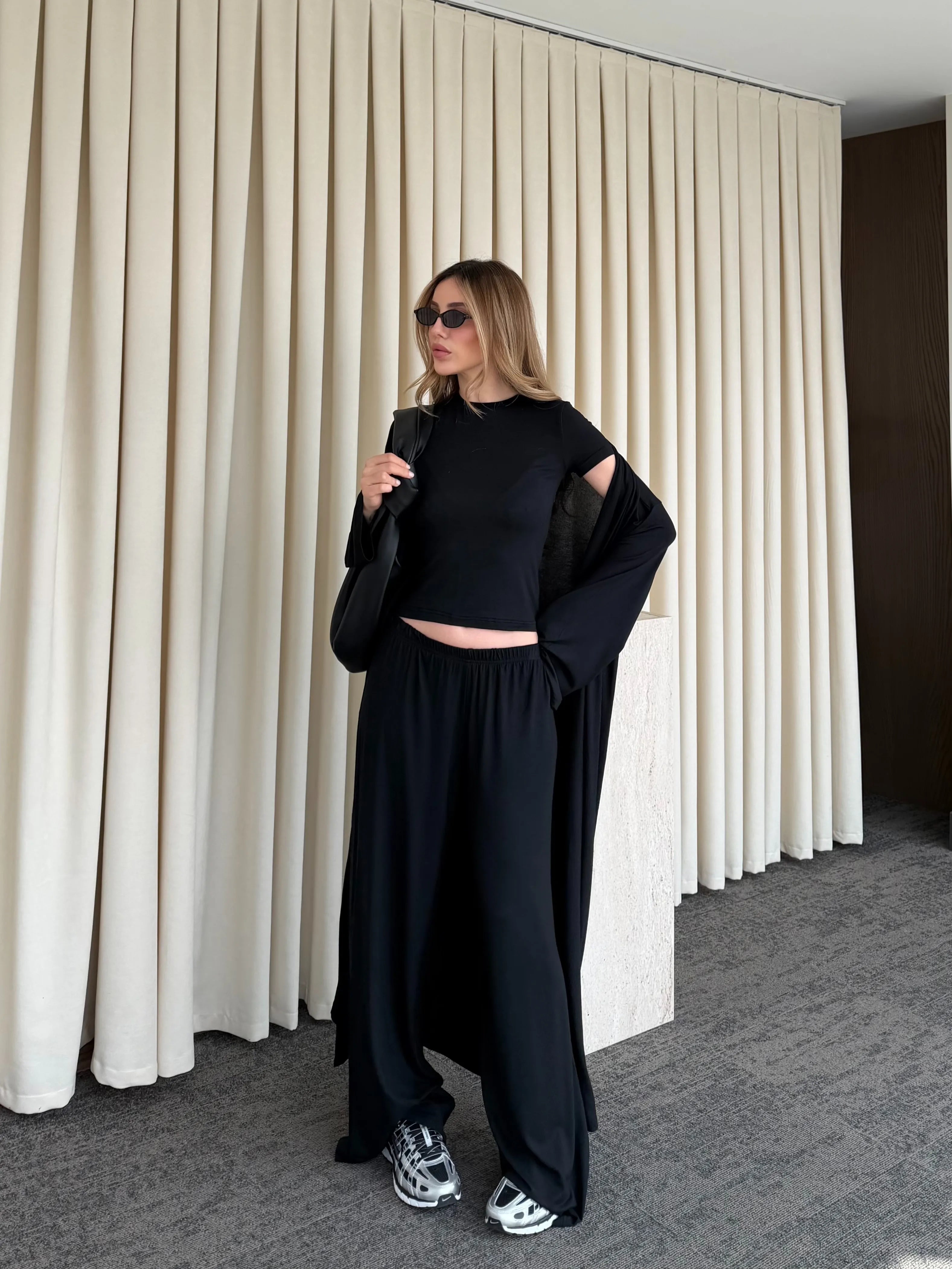 Günün her anına uyum sağlayan bu üçlü takım; akışkan pantolonu, modern kesim üstü ve tamamlayıcı dış katmanıyla stilinizi tek adımda tamamlar. Hareket özgürlüğü sunan yapısı sayesinde gün boyu konfor sağlarken, minimal çizgileriyle dikkat çekmeden fark yaratır.