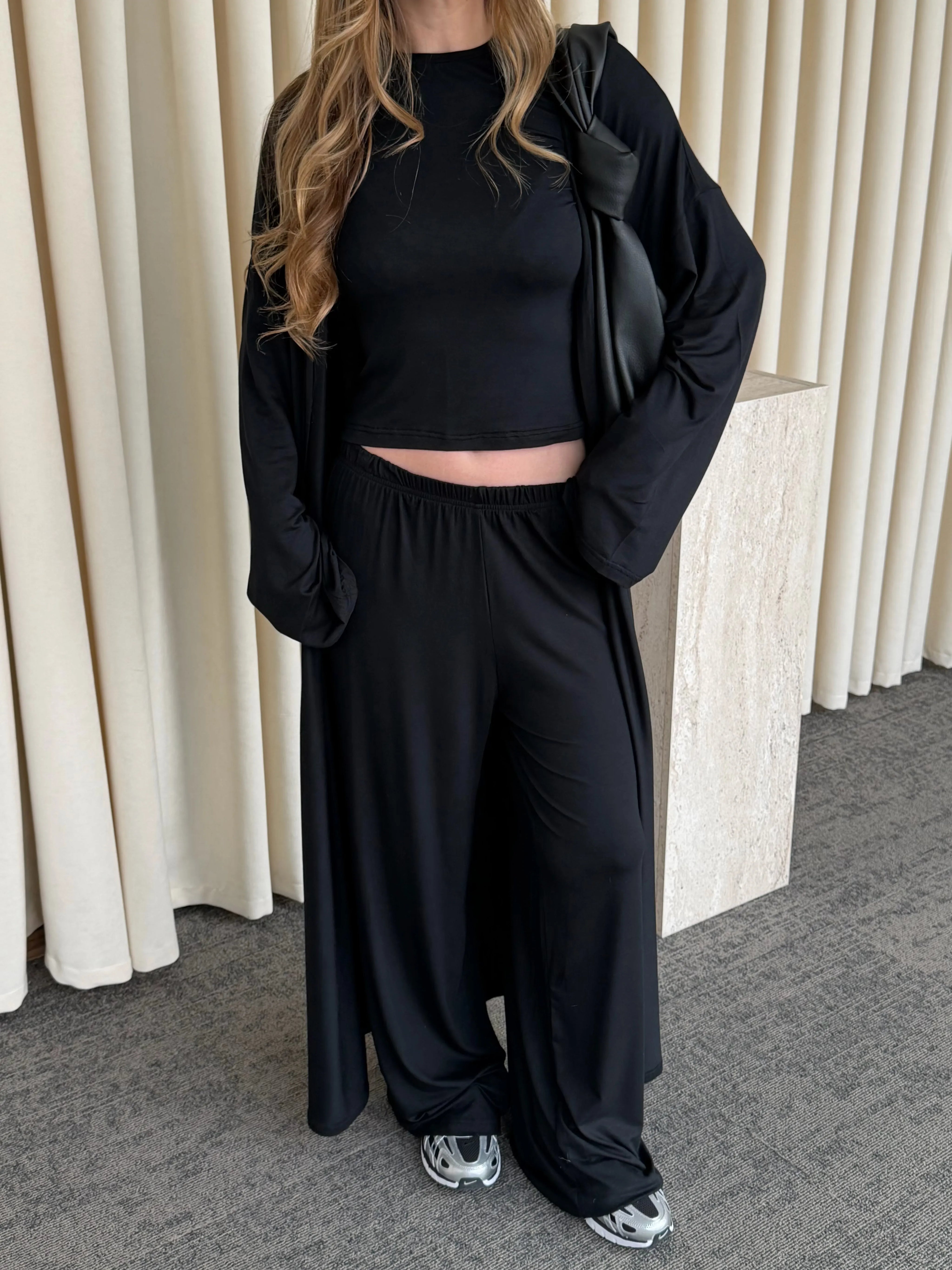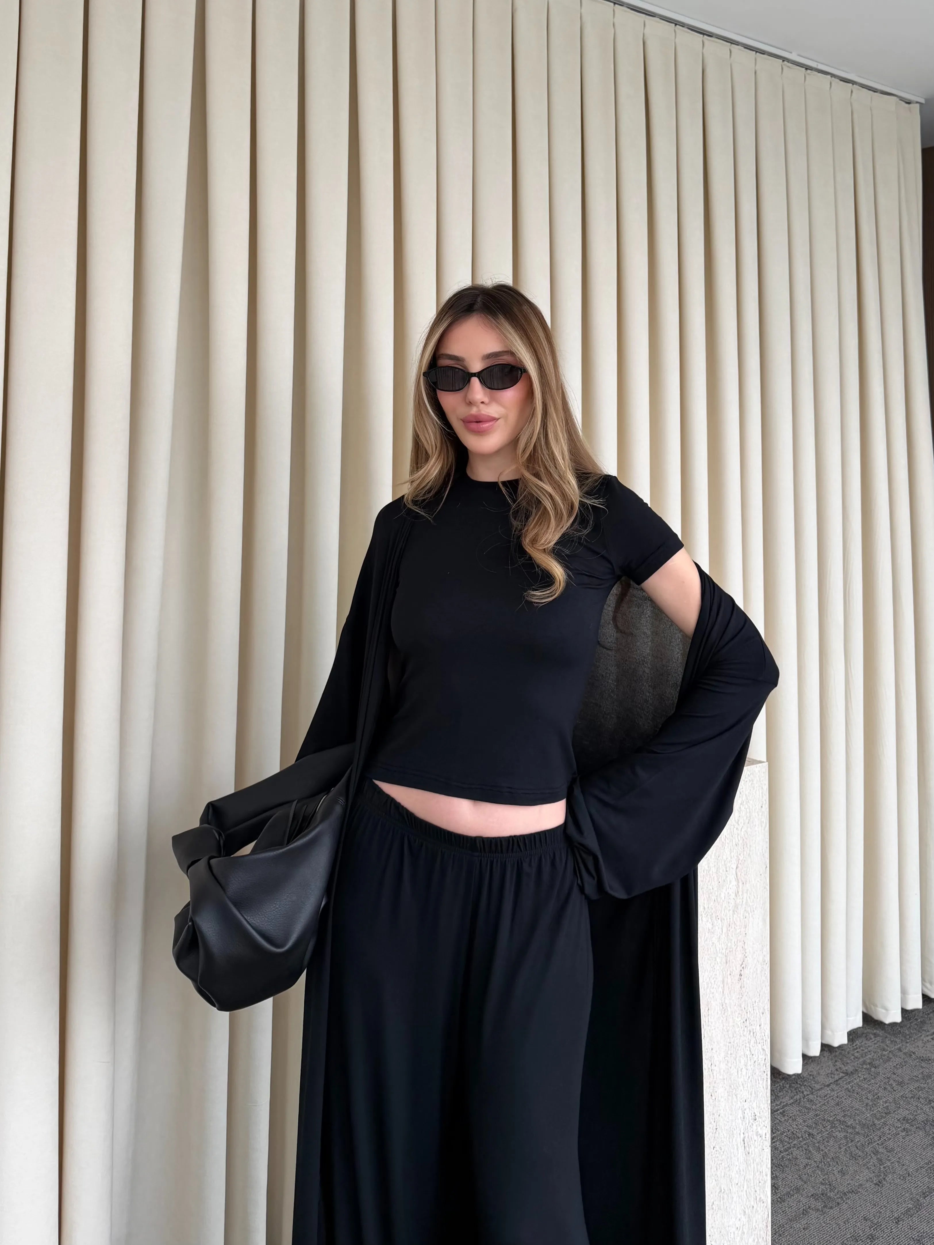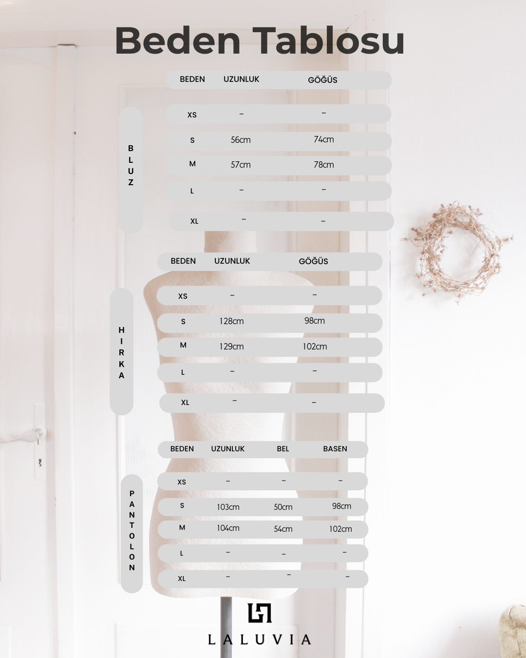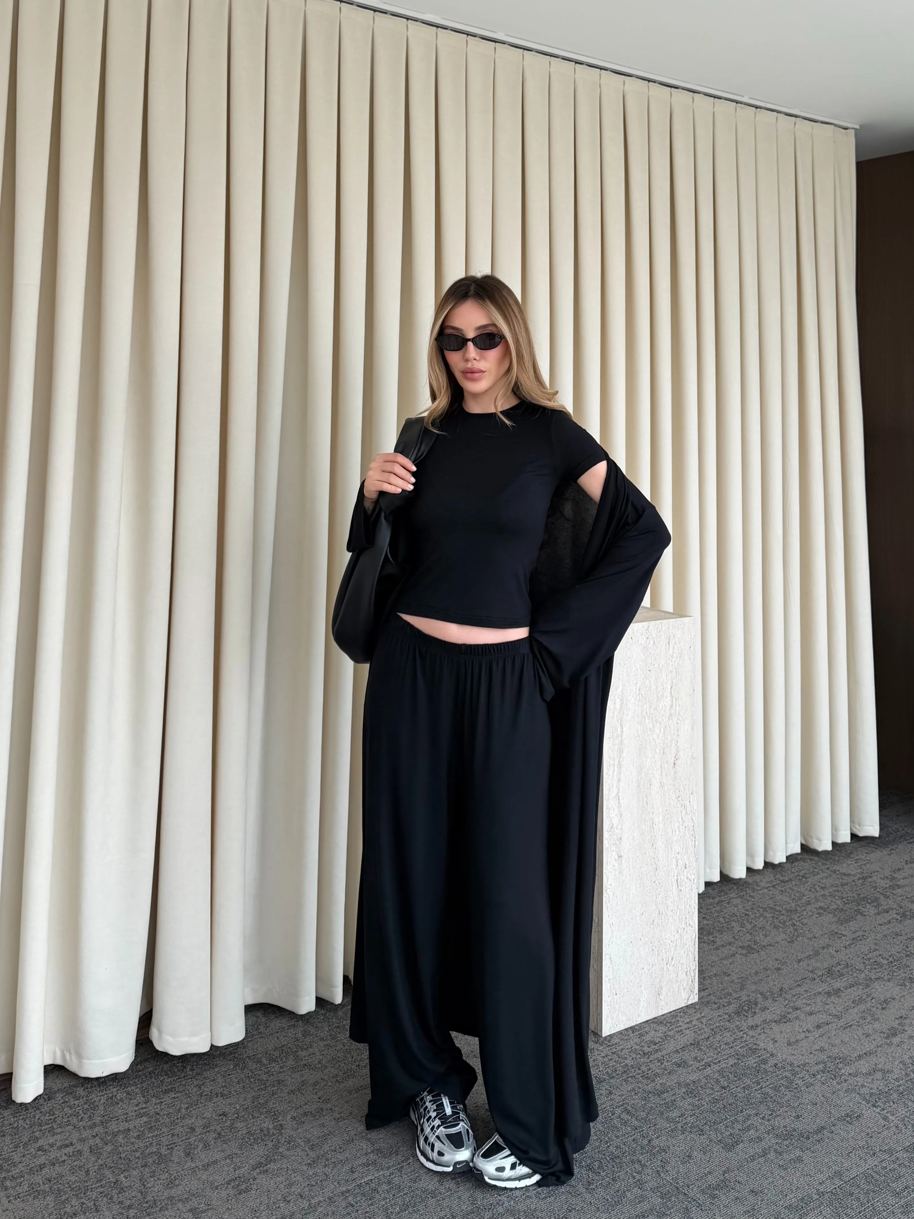 Günün her anına uyum sağlayan bu üçlü takım; akışkan pantolonu, modern kesim üstü ve tamamlayıcı dış katmanıyla stilinizi tek adımda tamamlar. Hareket özgürlüğü sunan yapısı sayesinde gün boyu konfor sağlarken, minimal çizgileriyle dikkat çekmeden fark yaratır.
