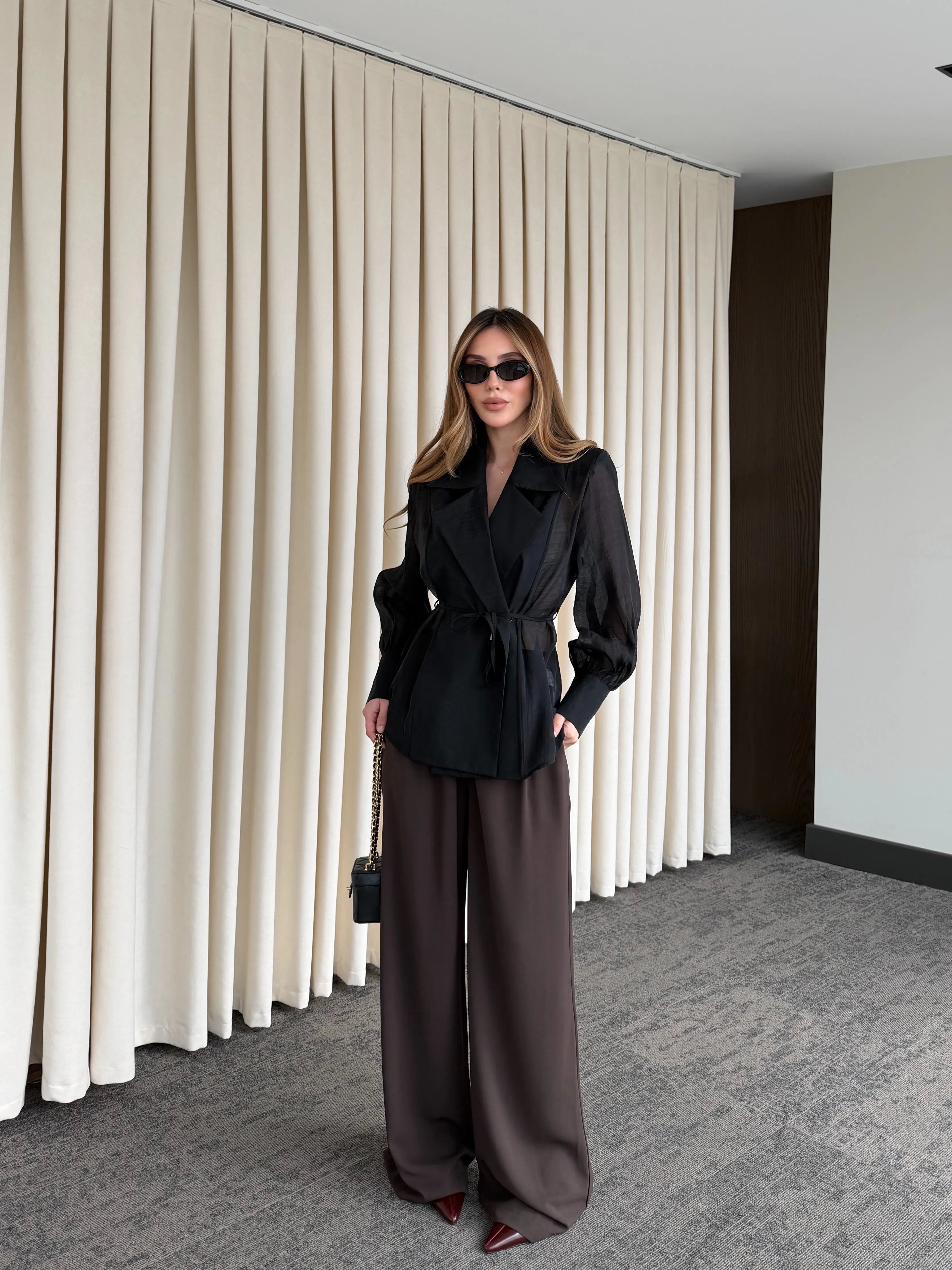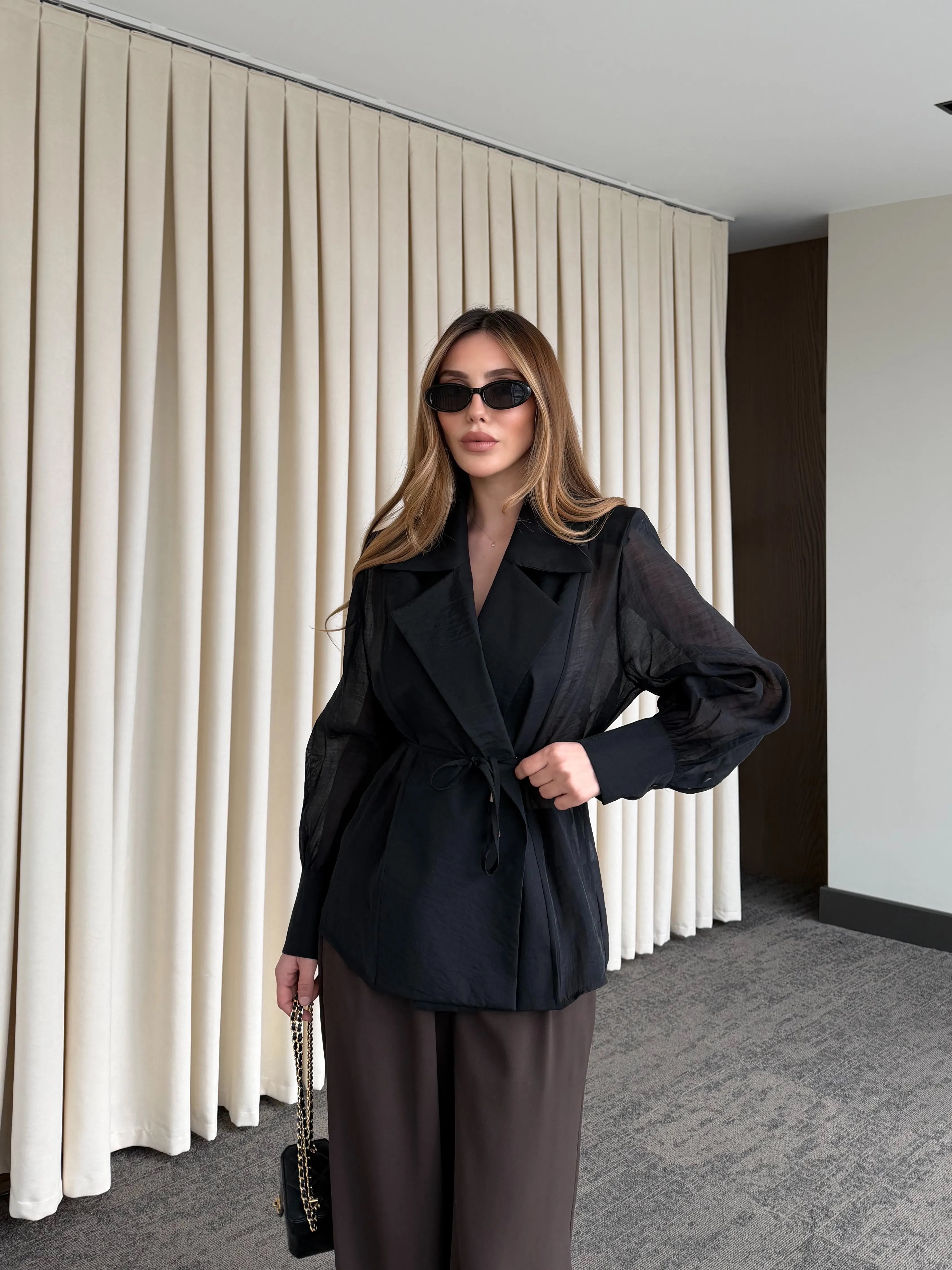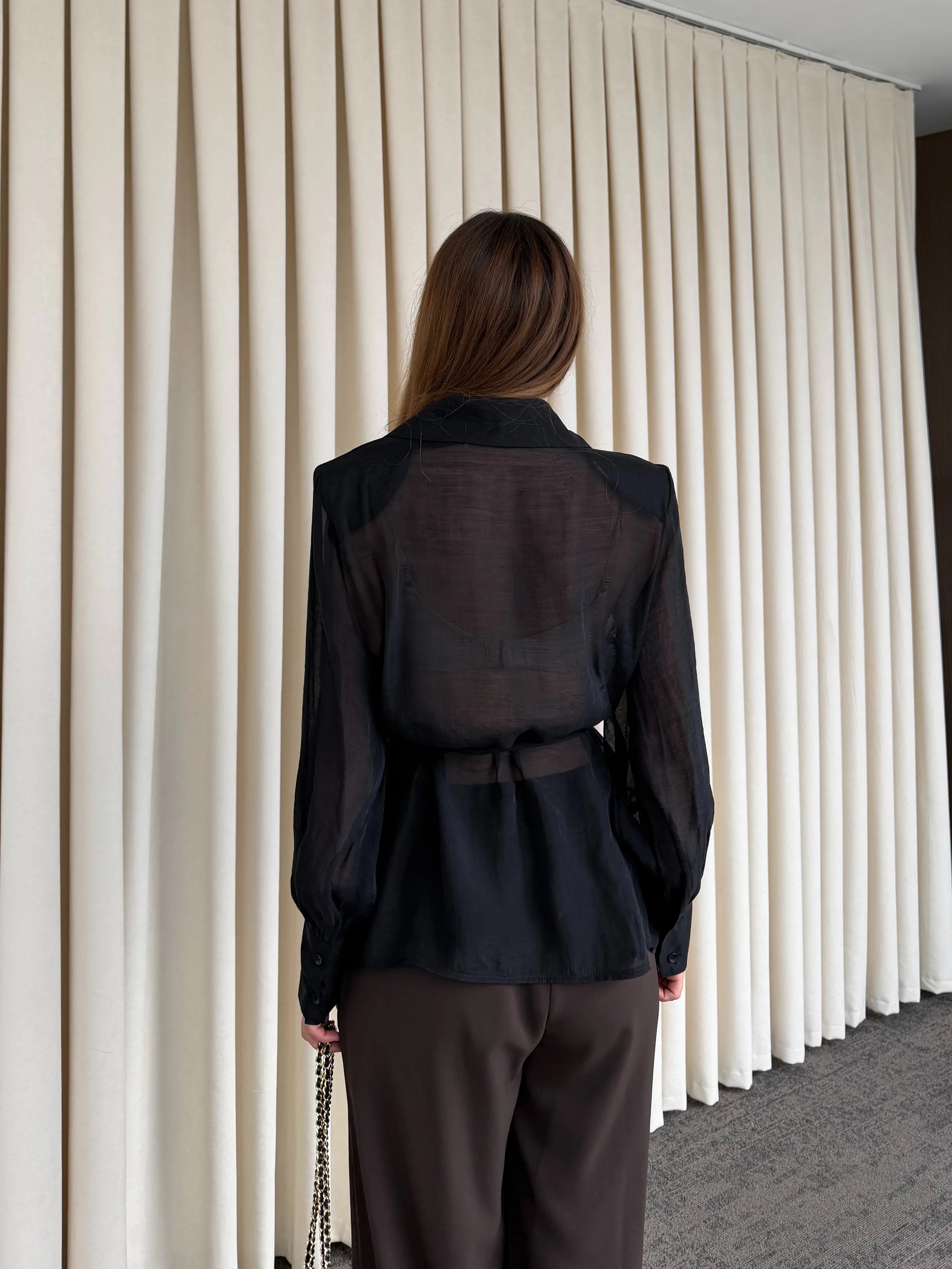 Şıklığı minimal detaylarla buluşturan bu transparan gömlek, stiline sofistike bir dokunuş katmak isteyenler için tasarlandı. Hafif ve akışkan dokusu sayesinde zarif bir siluet oluştururken, transparan yapısı feminen ve güçlü bir görünüm sunar.