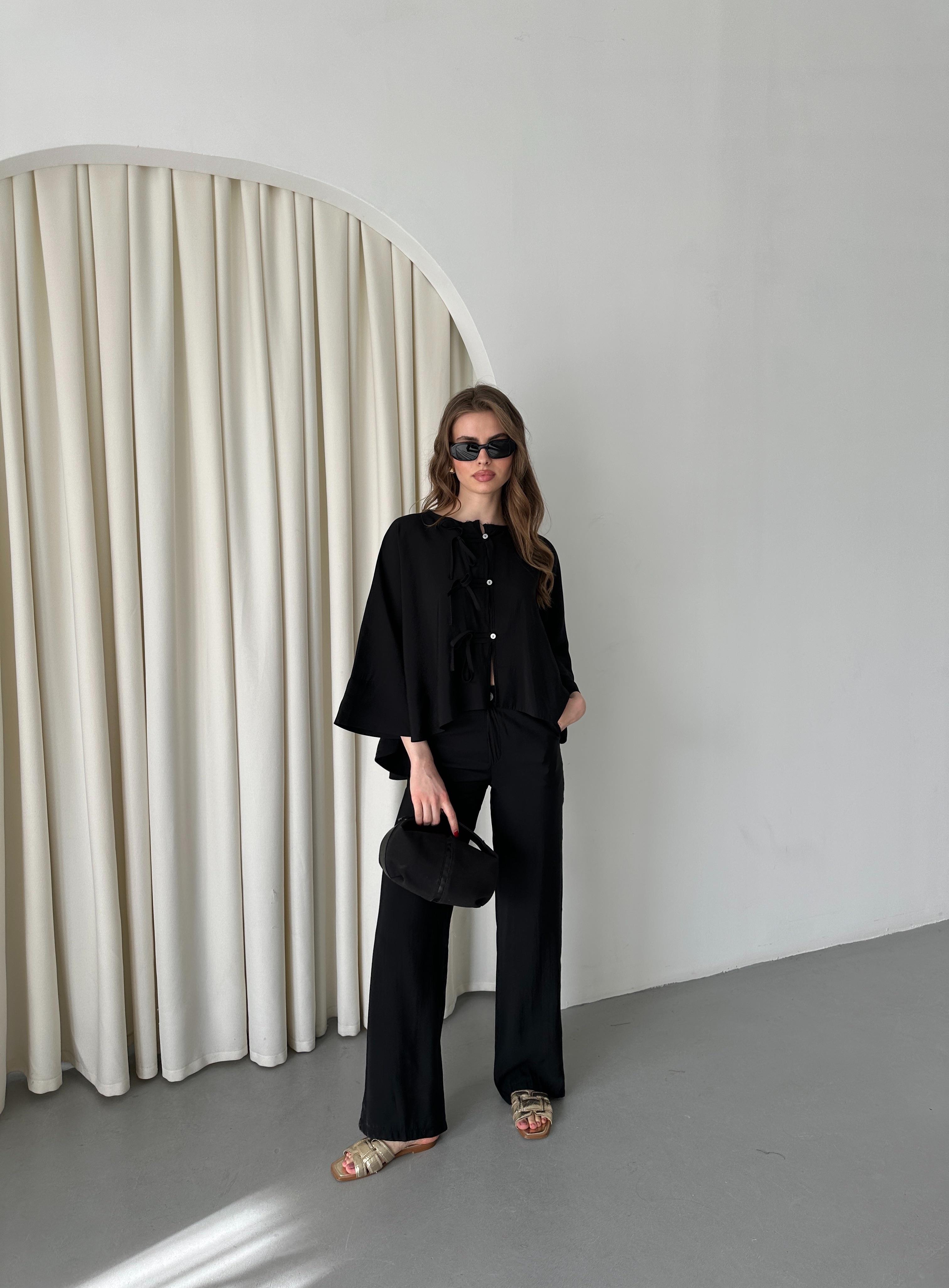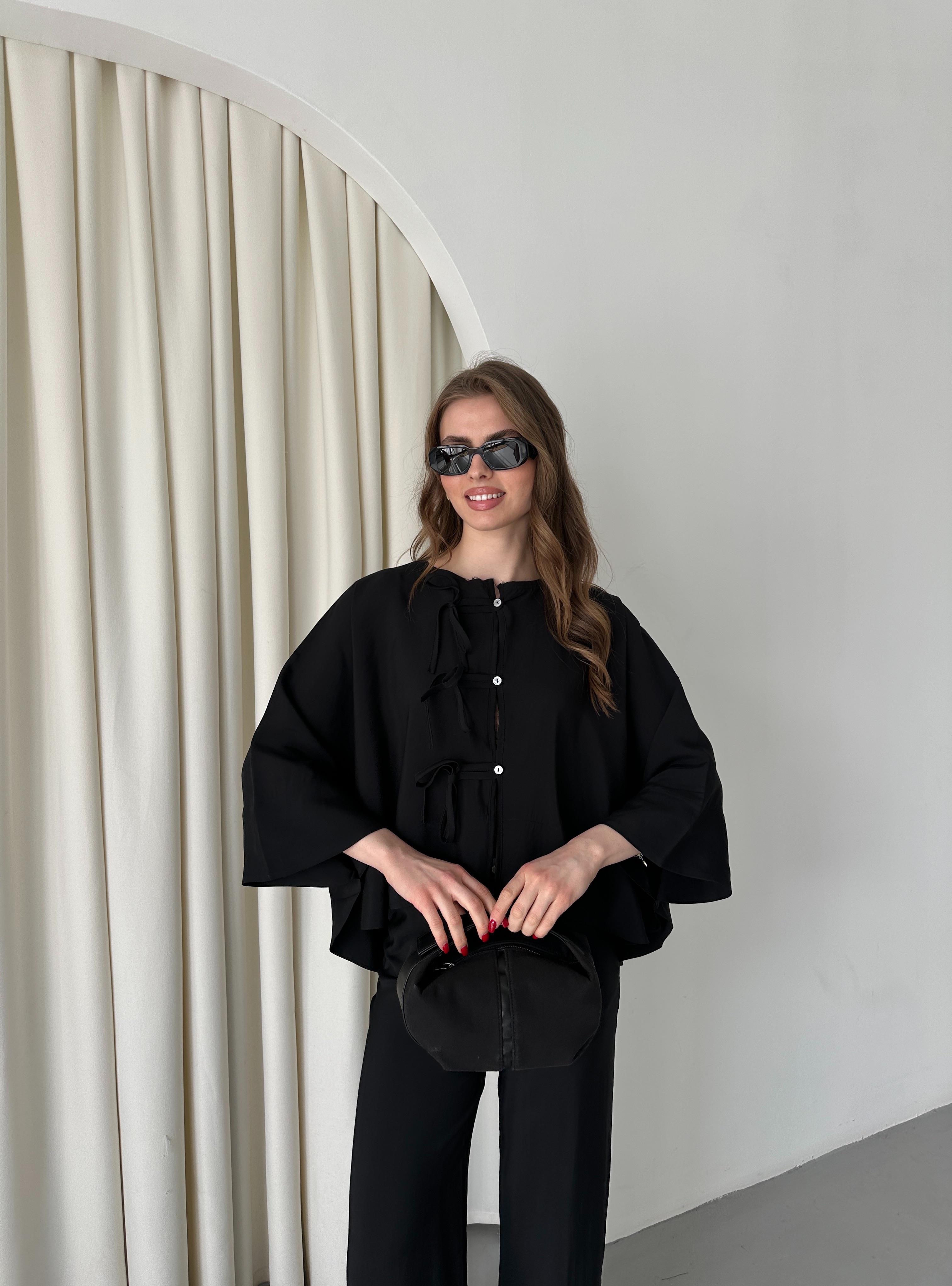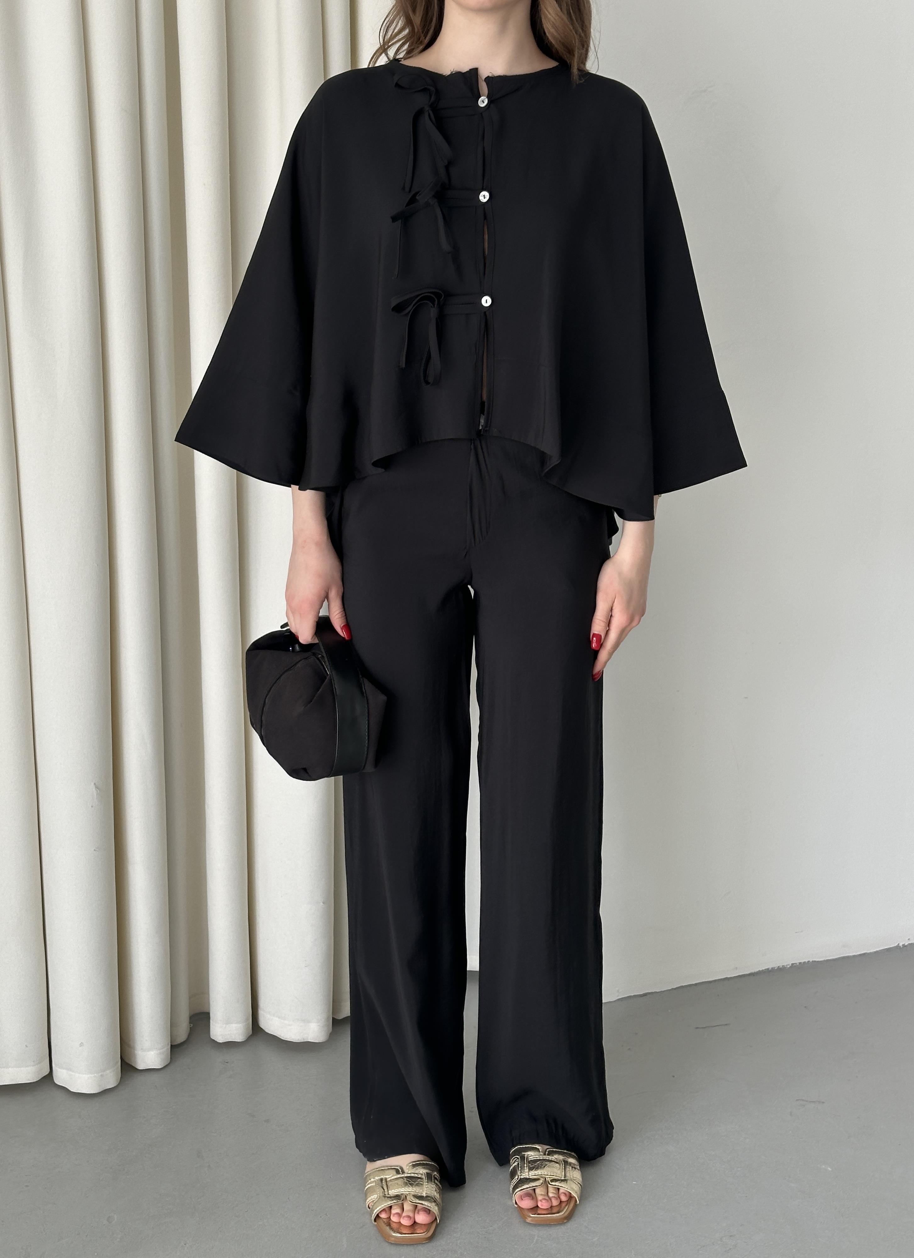 Siyah Yarasa Kol Bağcık Düğme Detaylı Takım