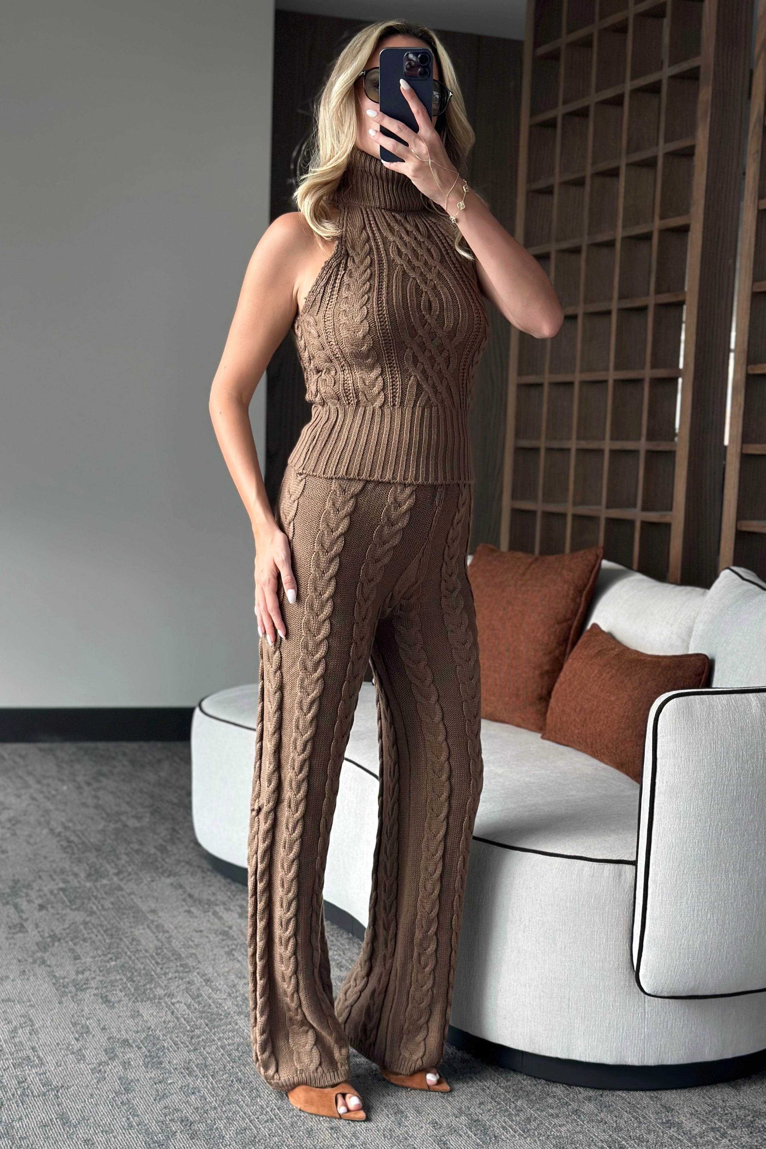 - Sütlü Kahve Kolsuz Bluz Pantolon Takım - 3009