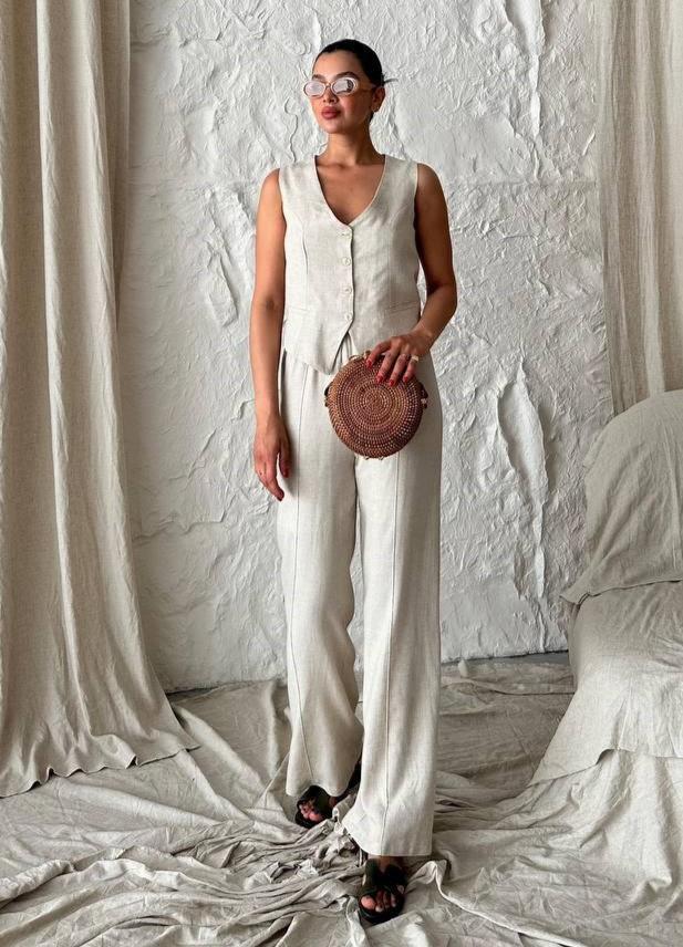 - Taş %100 Pamuk Lavin Keten Yelek Pantolon Takım