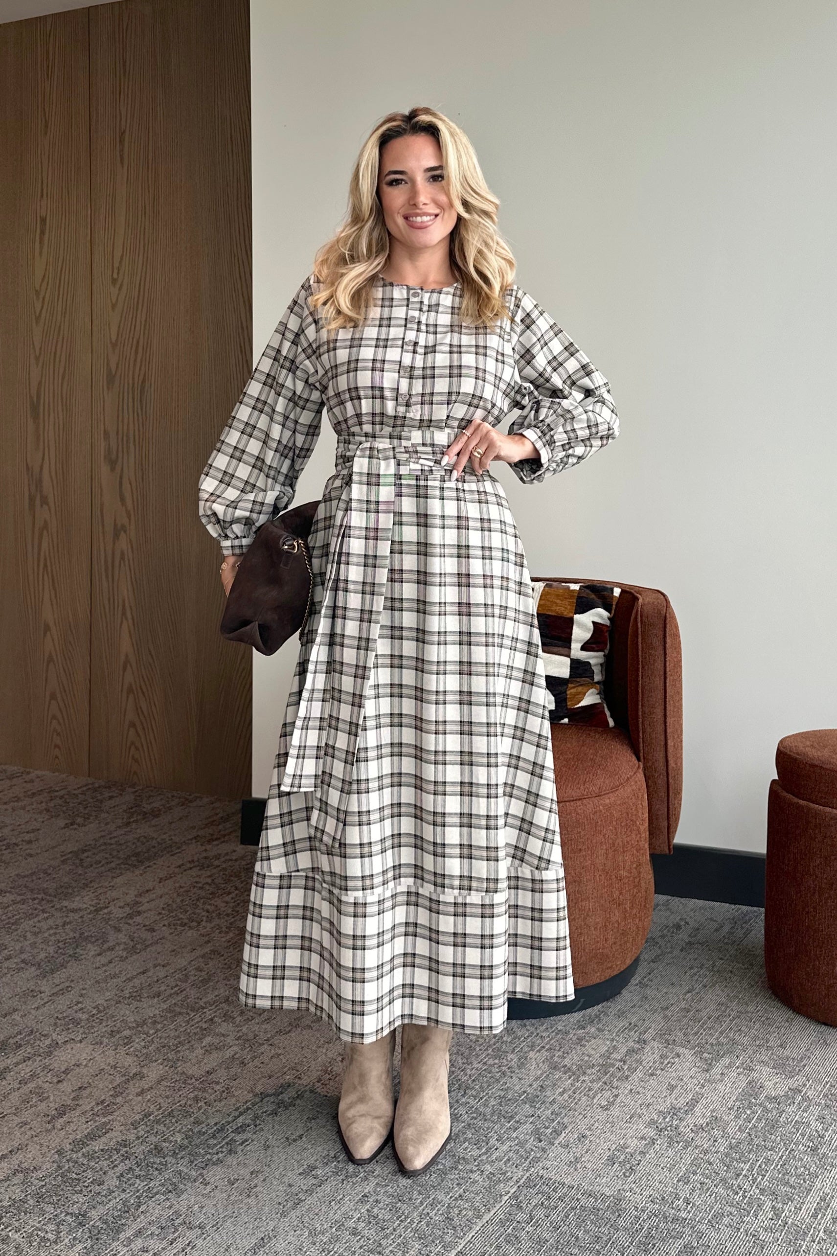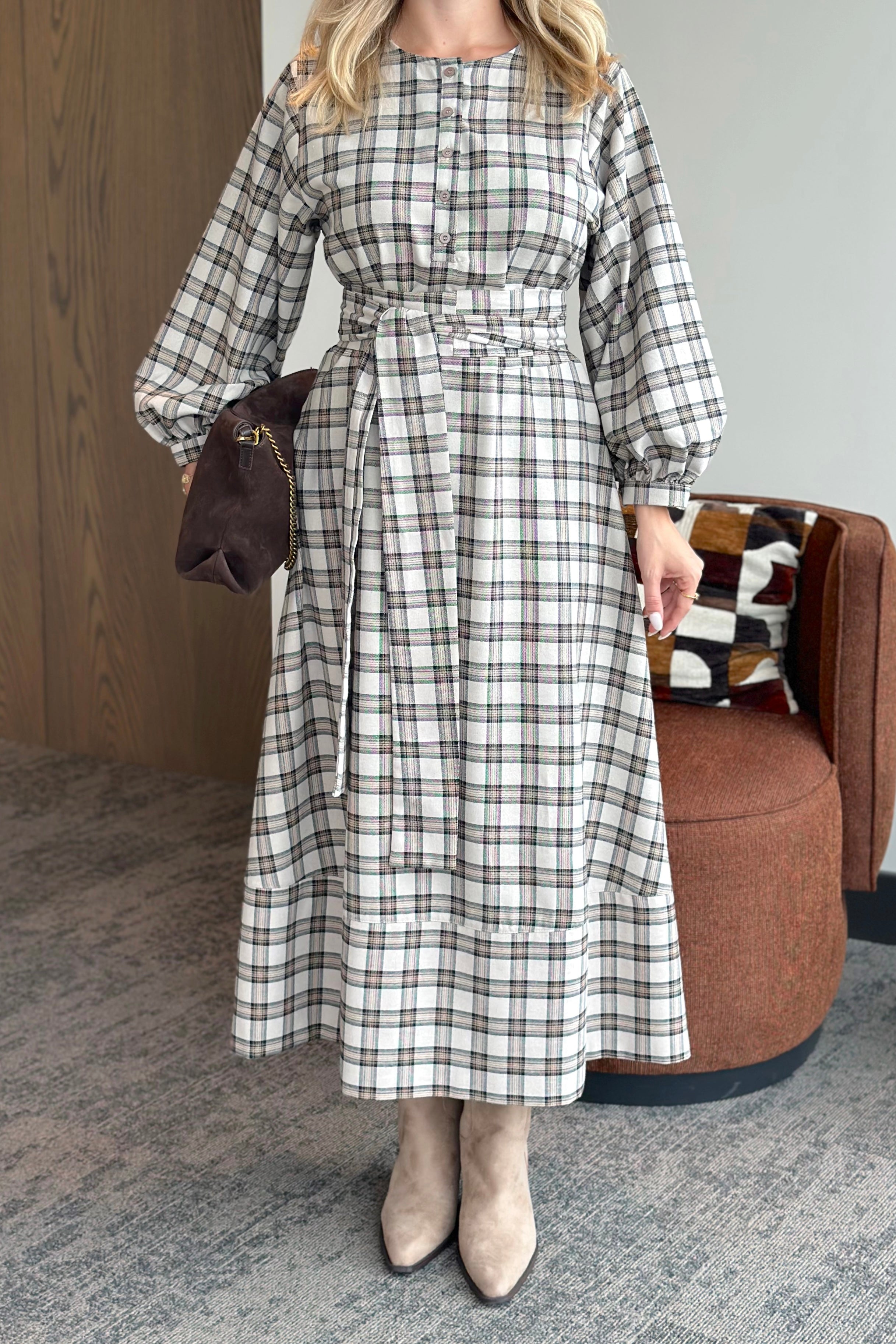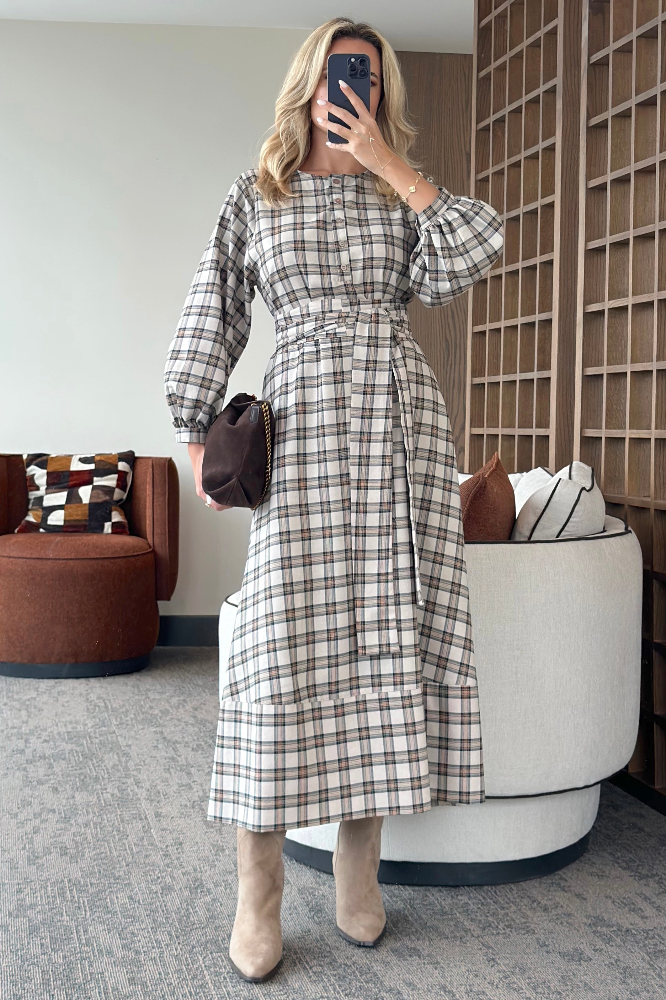 - Taş Ekoseli Kuşaklı Uzun Elbise - 1235