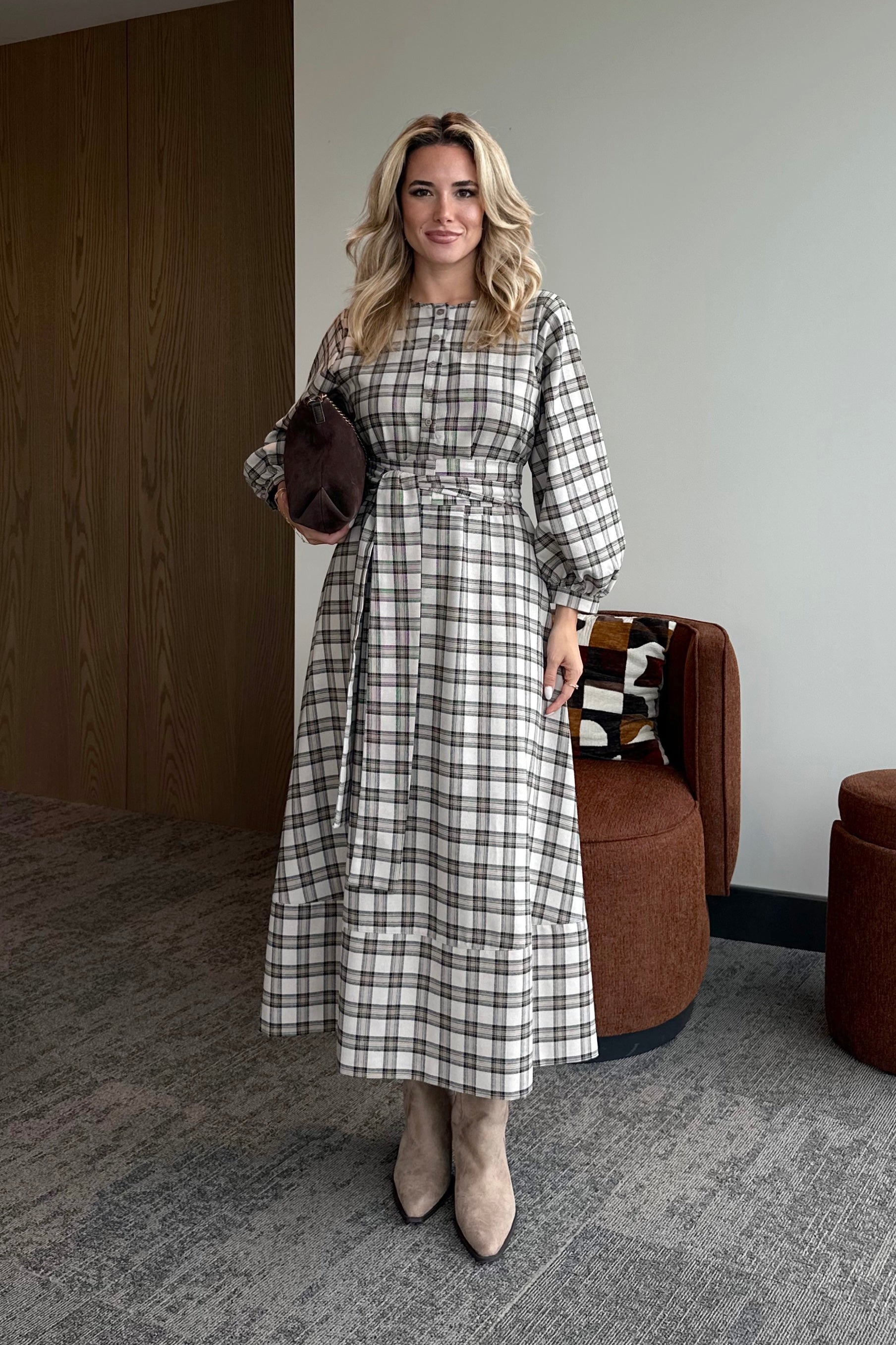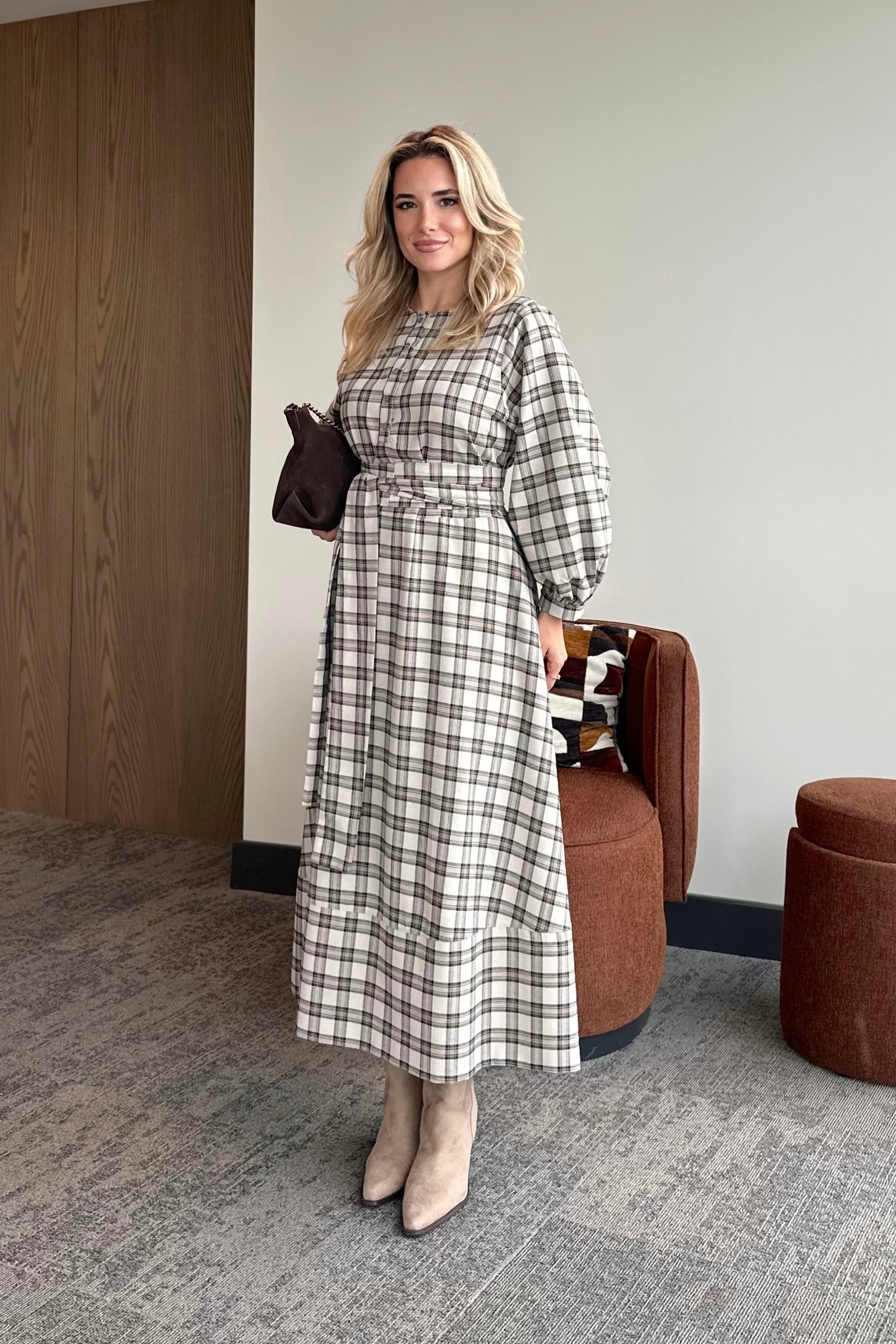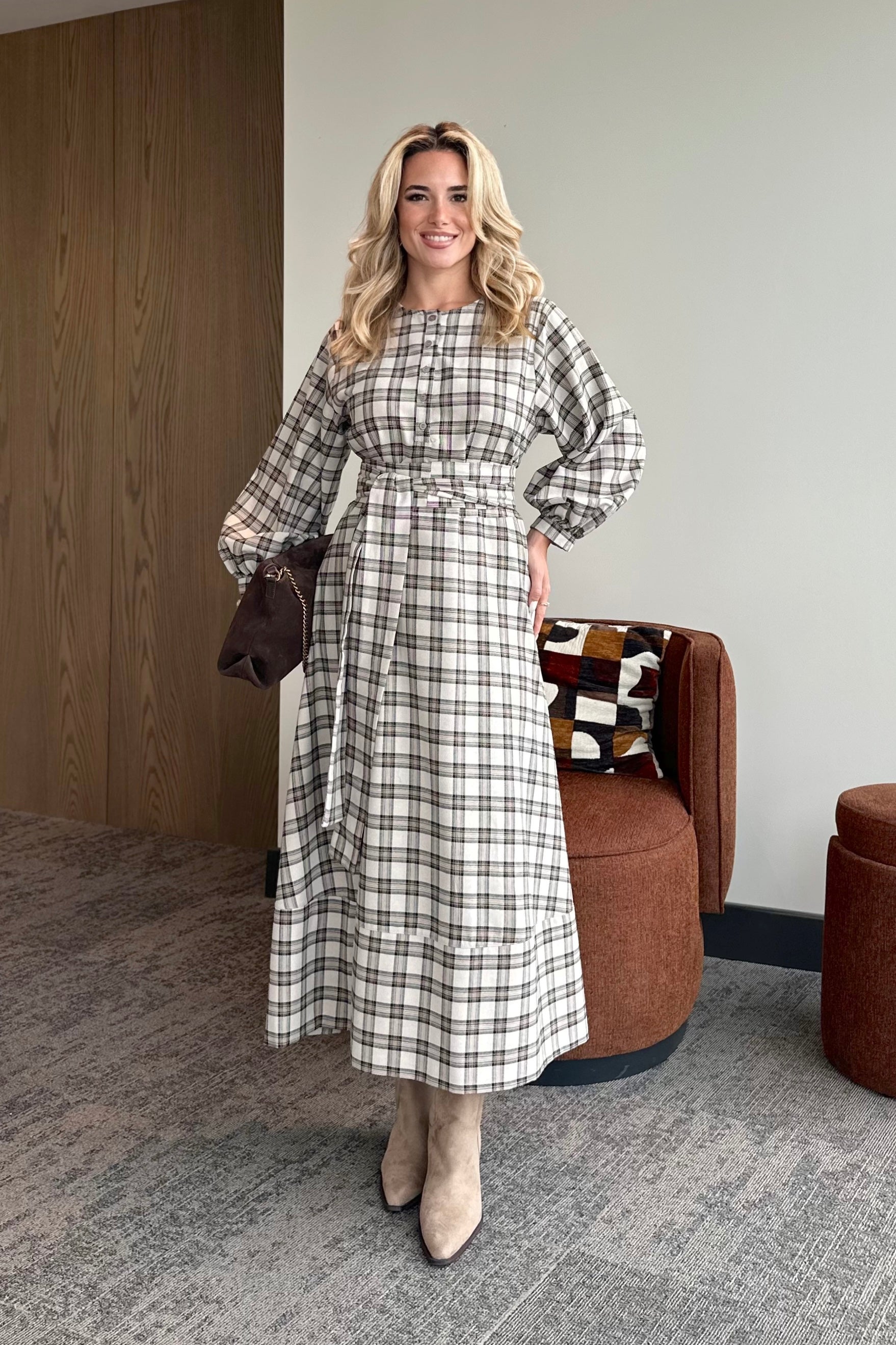 - Taş Ekoseli Kuşaklı Uzun Elbise - 1235