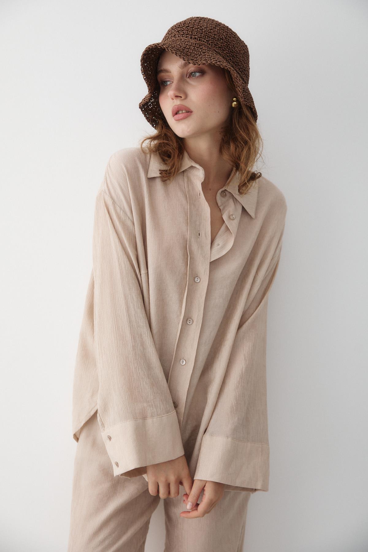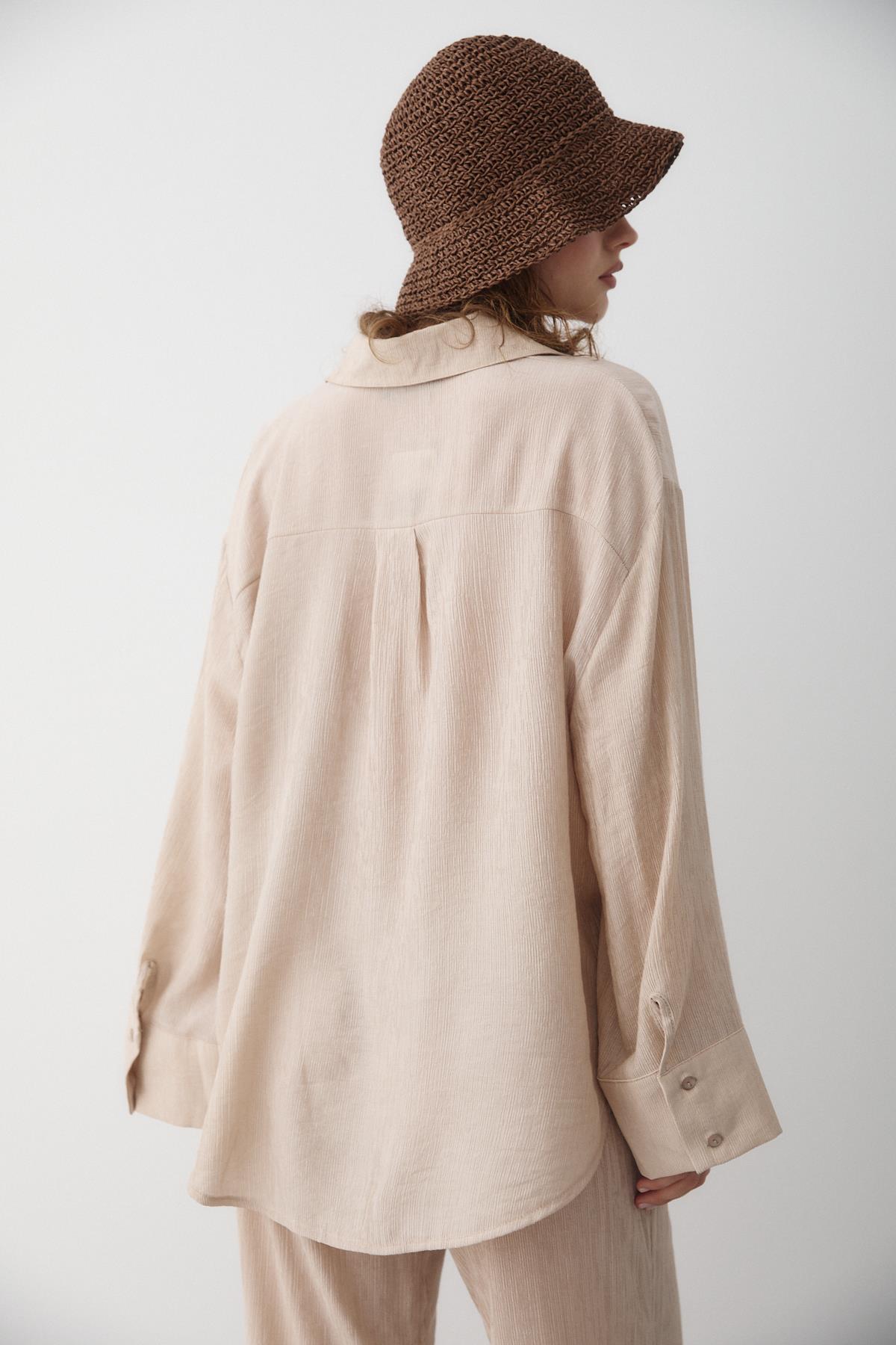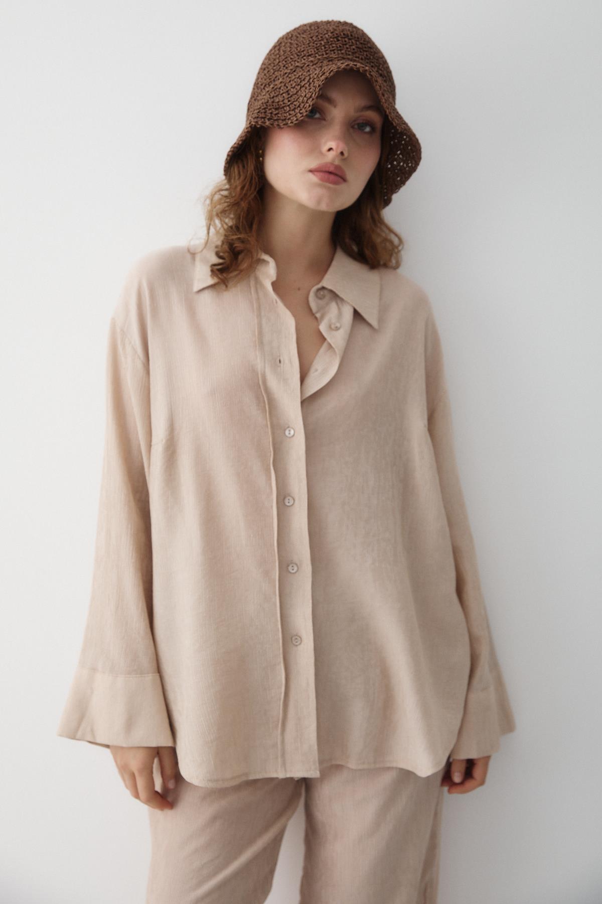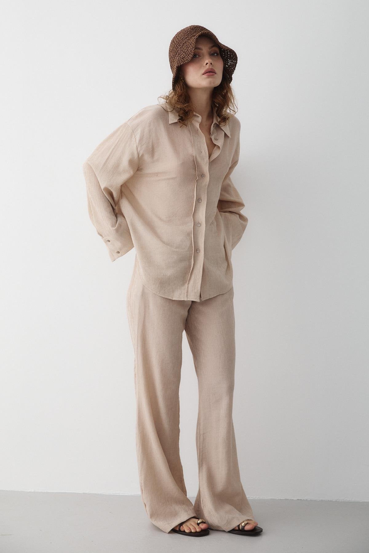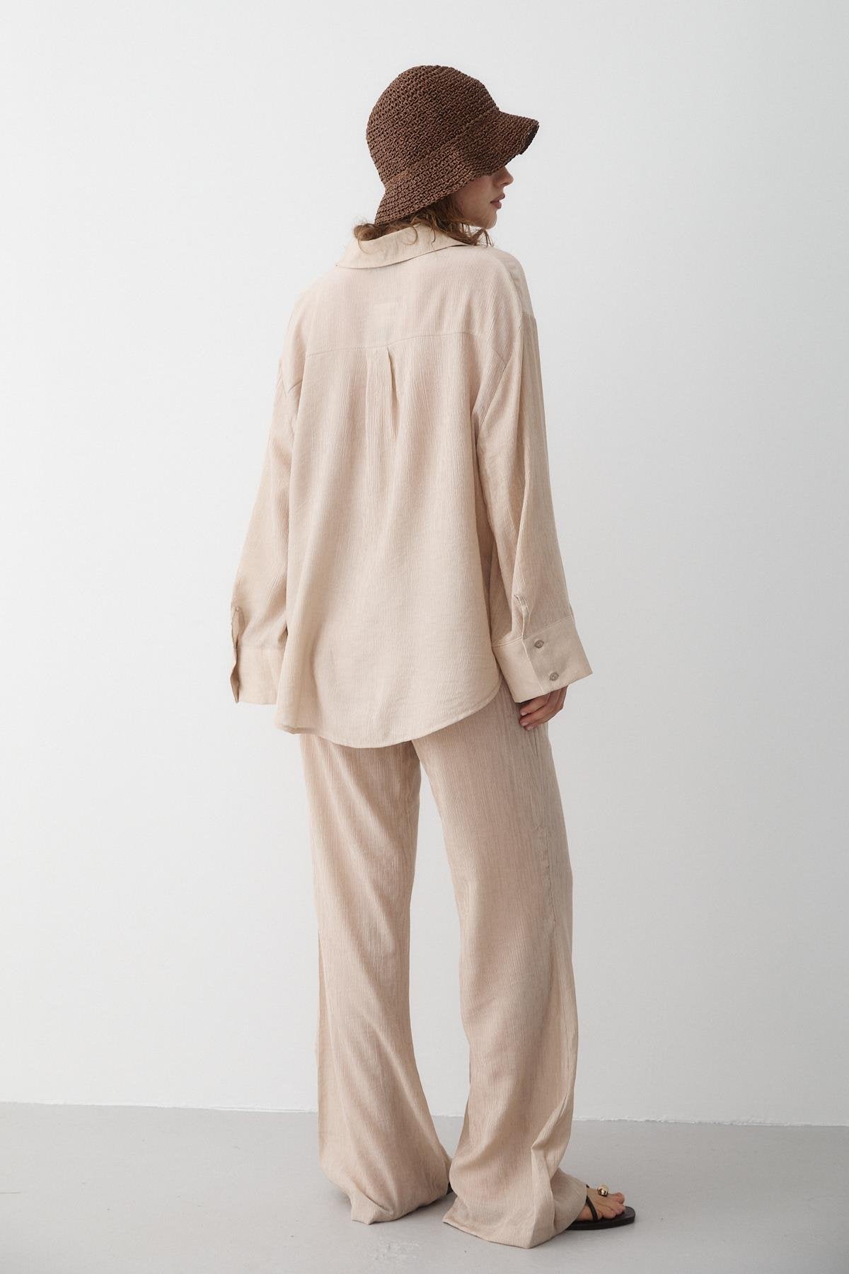 - Taş Rengi Dokulu Gömlekli Pantolon Takım