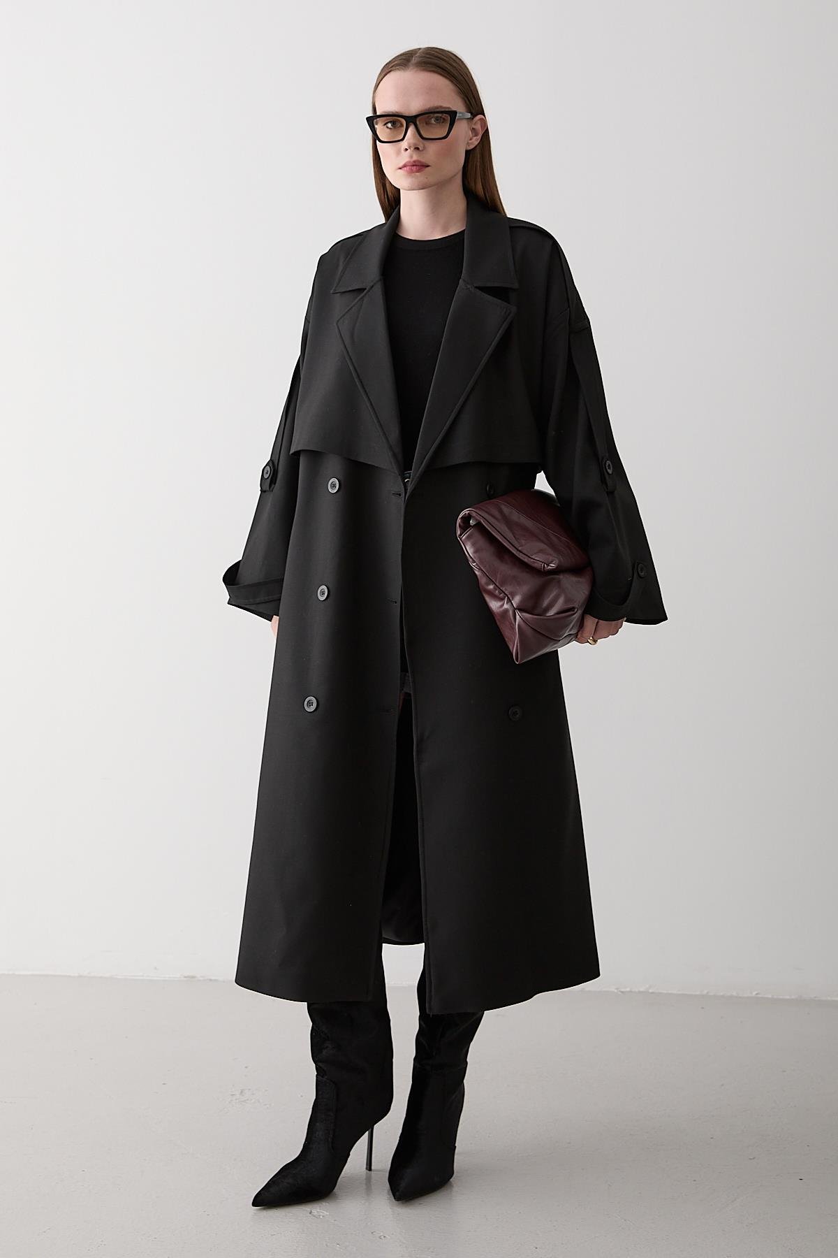 Black Lucky Button Detailed Oversized Trench Coat (9476-12002501260020)