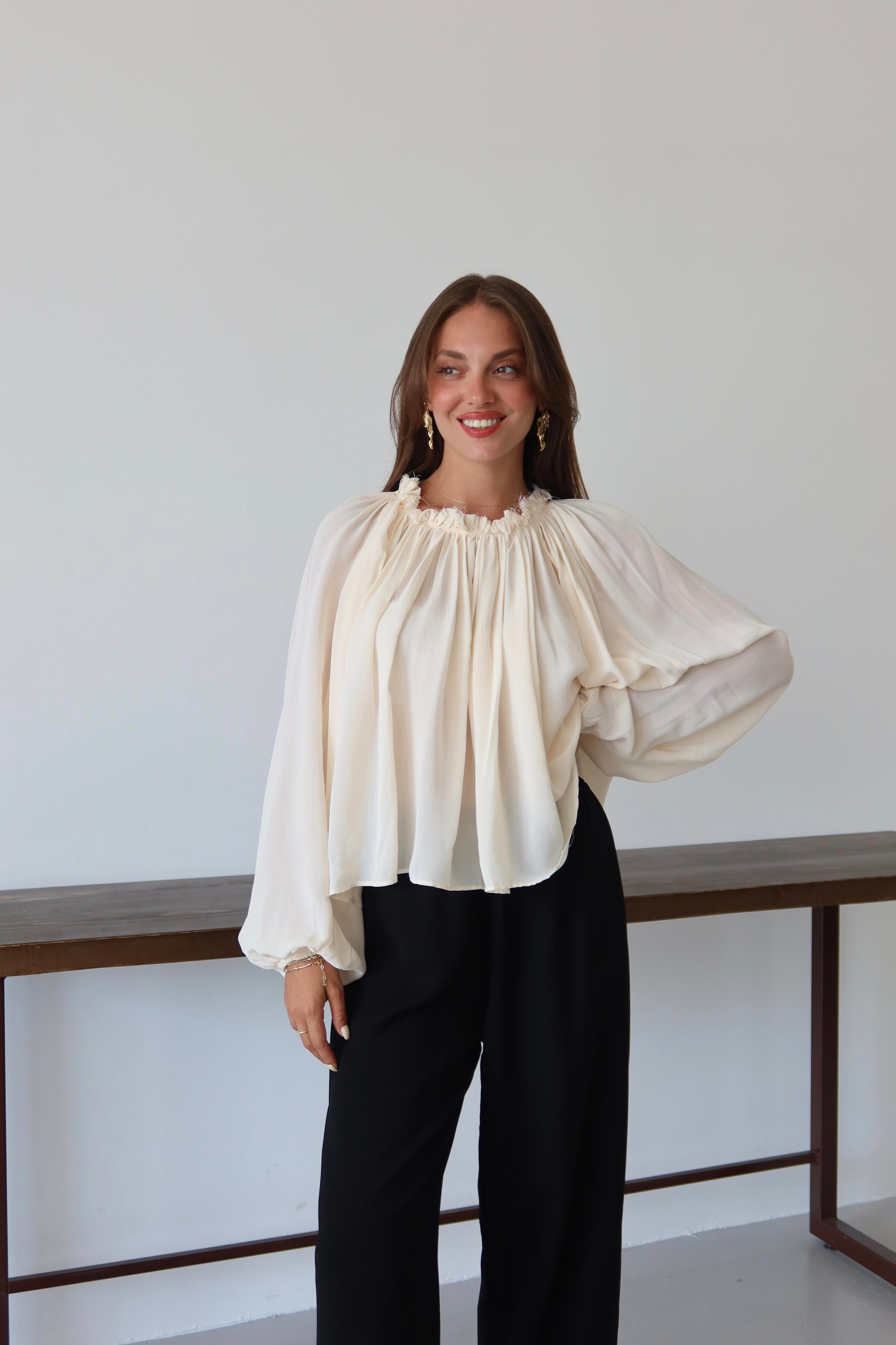 Ekru Yakası Büzgülü Yarasa Kol Bluz