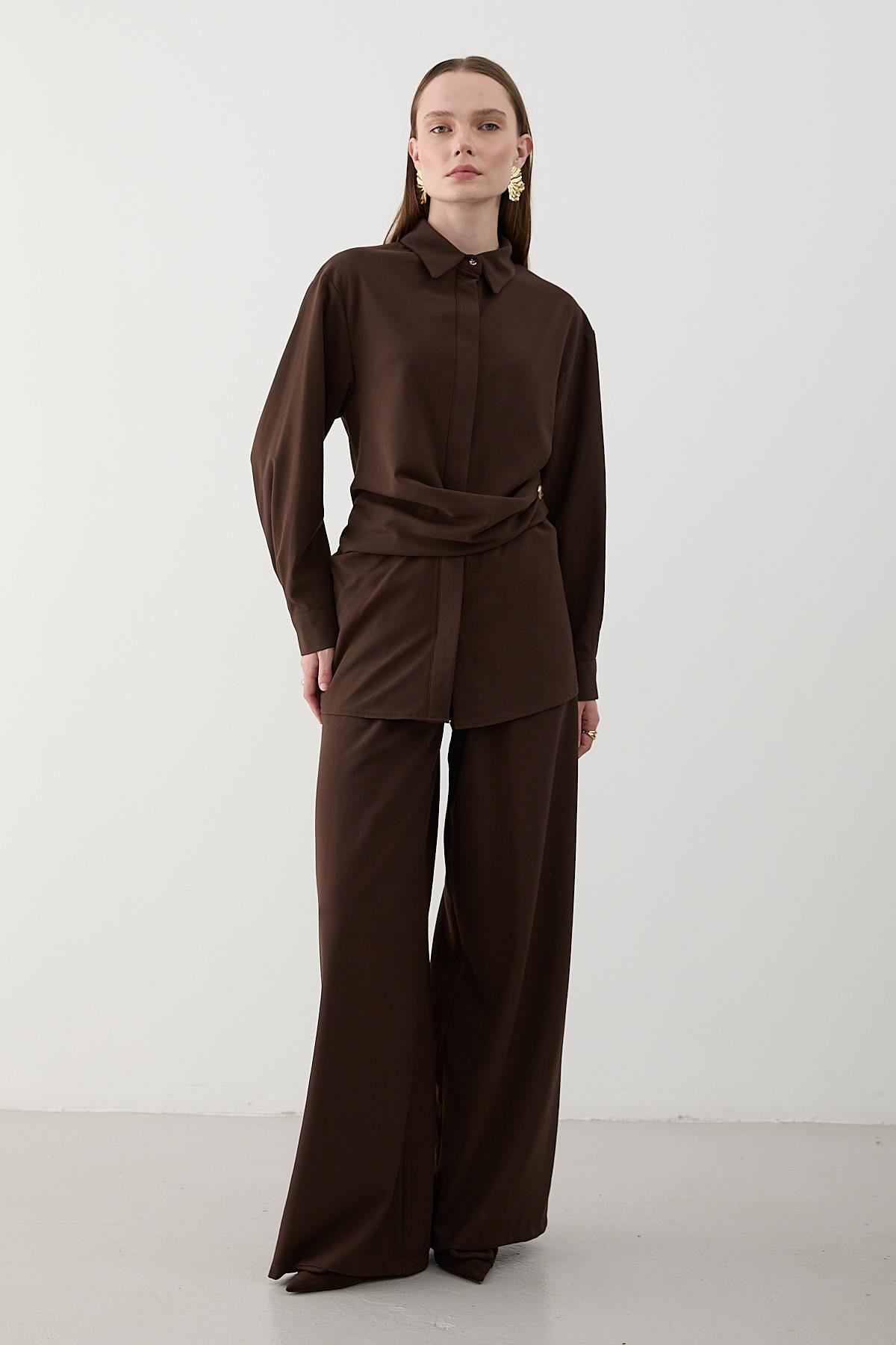 Kahverengi Gold Aksesuar Düğmeli Gömlek Pantolon Takım - 8856