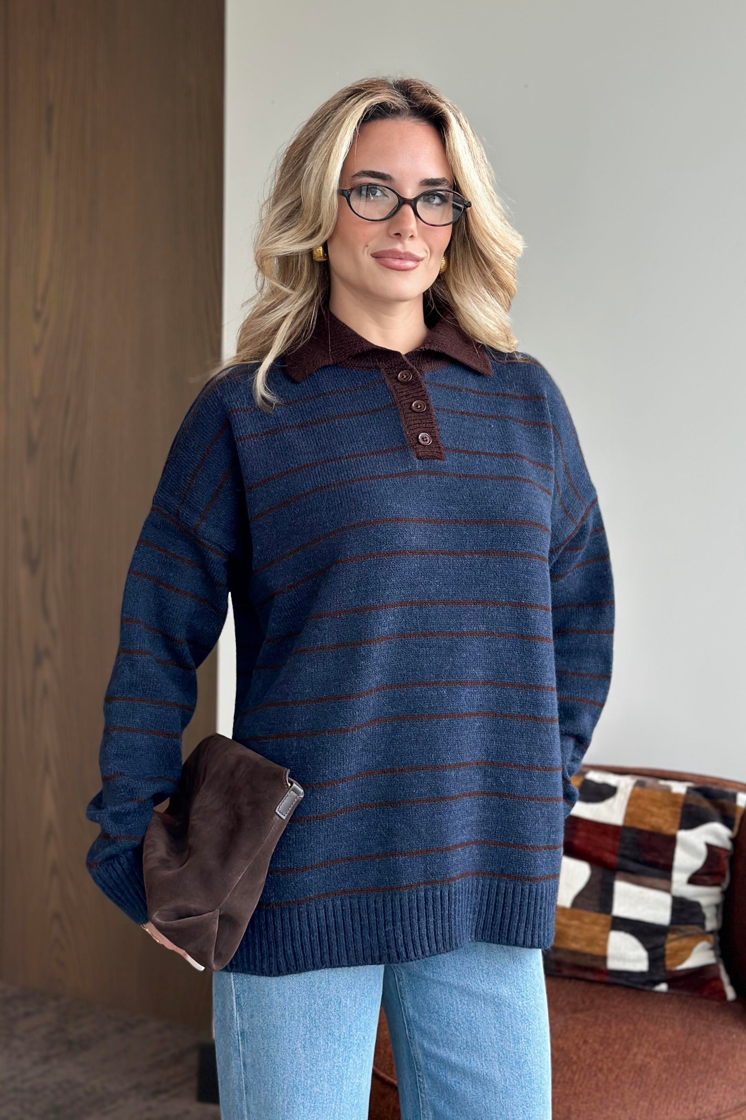 Lacivert - Kahverengi Çizgili Kazak -1510
