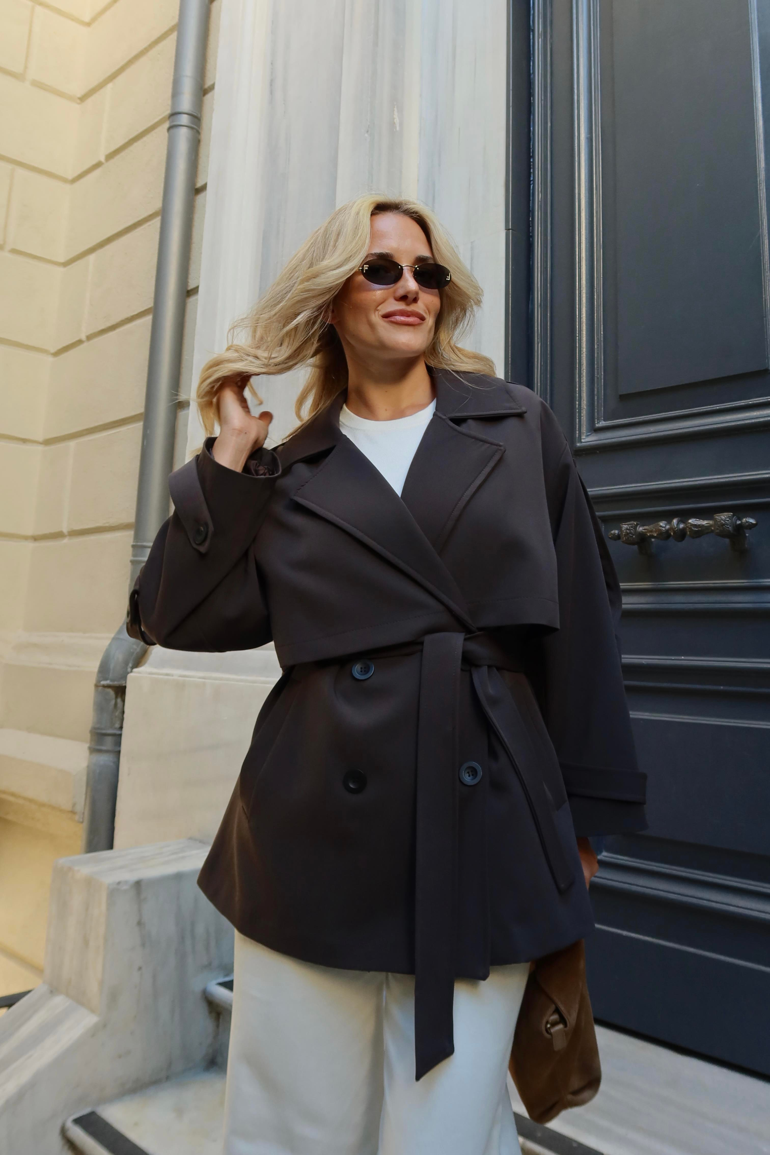 Haki Oversize Düşük Omuz Kısa Trenç - 9580 Antrasit Oversize Düşük Omuz Kısa Trenç - 9580 Siyah Oversize Düşük Omuz Kısa Trenç - 9580